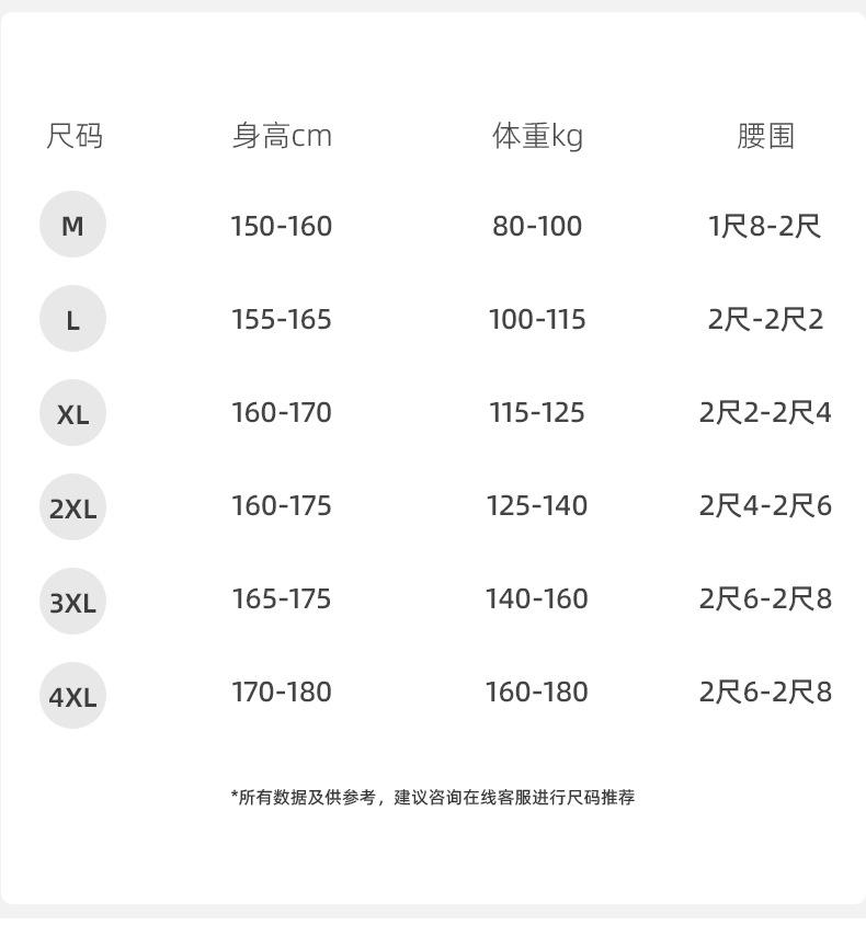 M (reference weight 40.00 kg-50.00 kg, L (reference weight 50.00 kg-57.50 kg, XL (reference weight 57.50 kg-62...