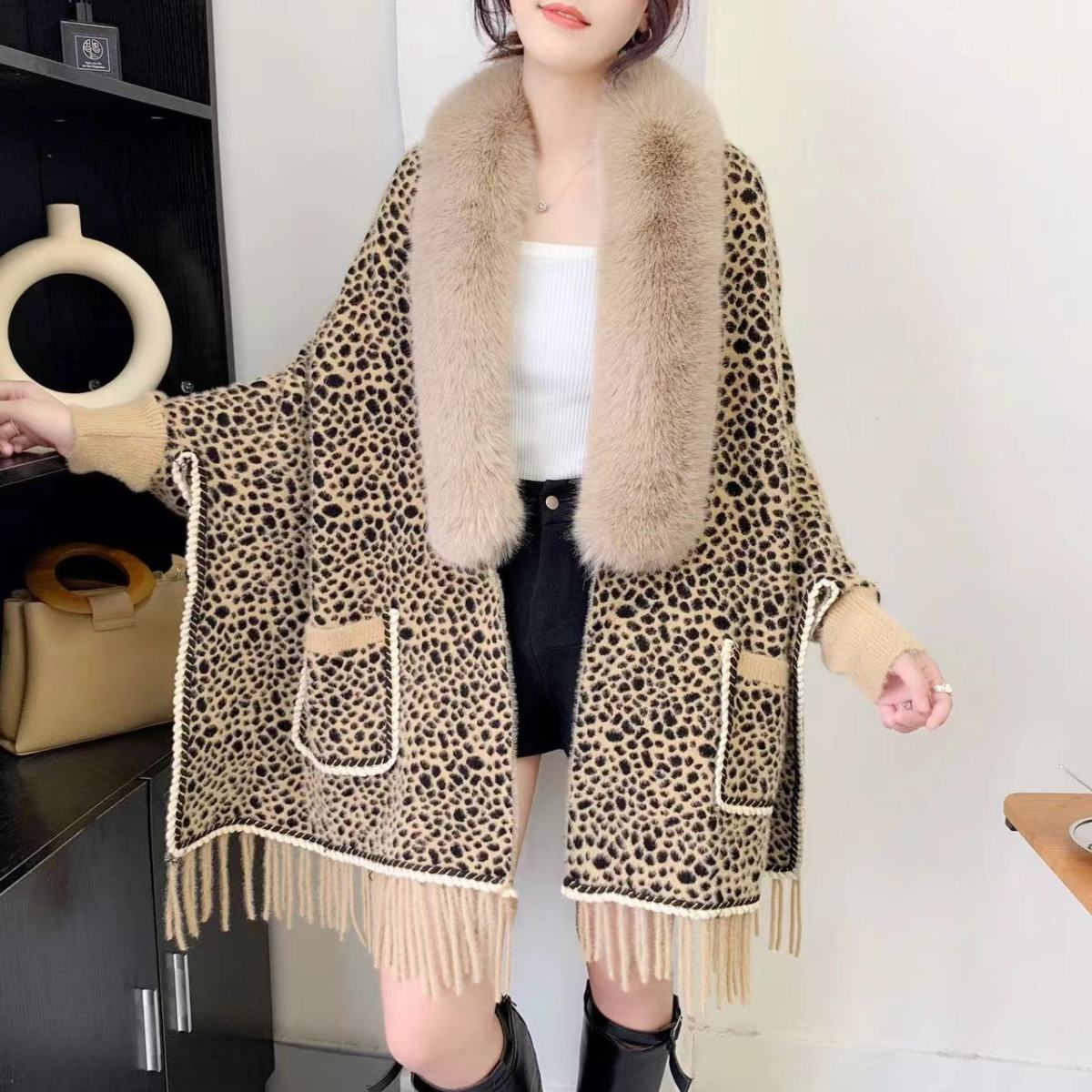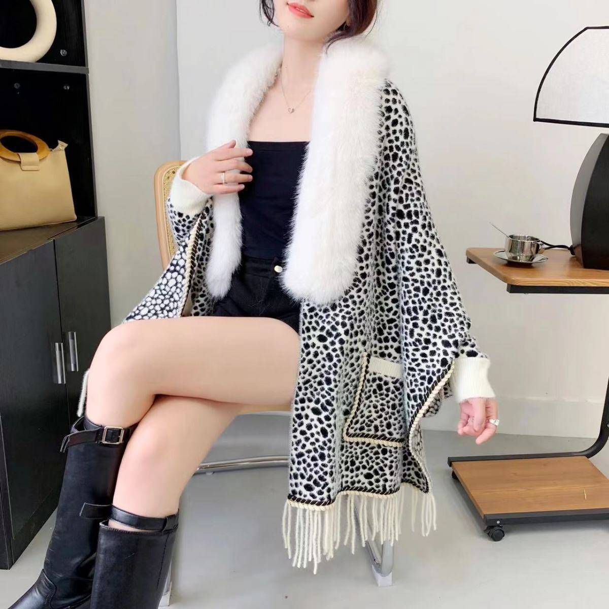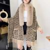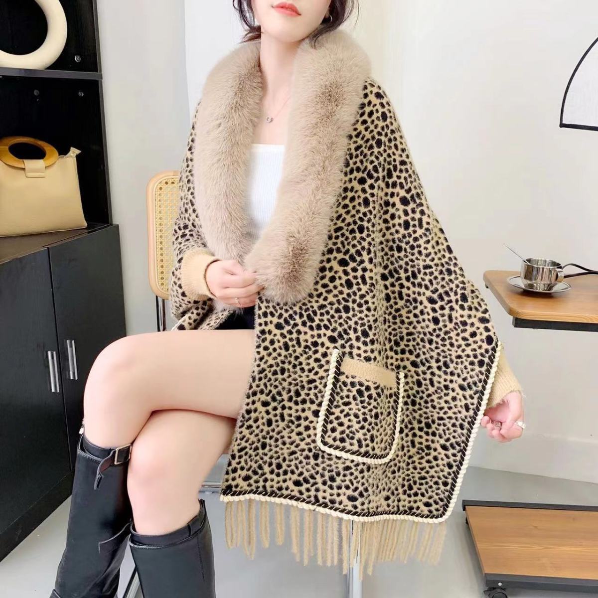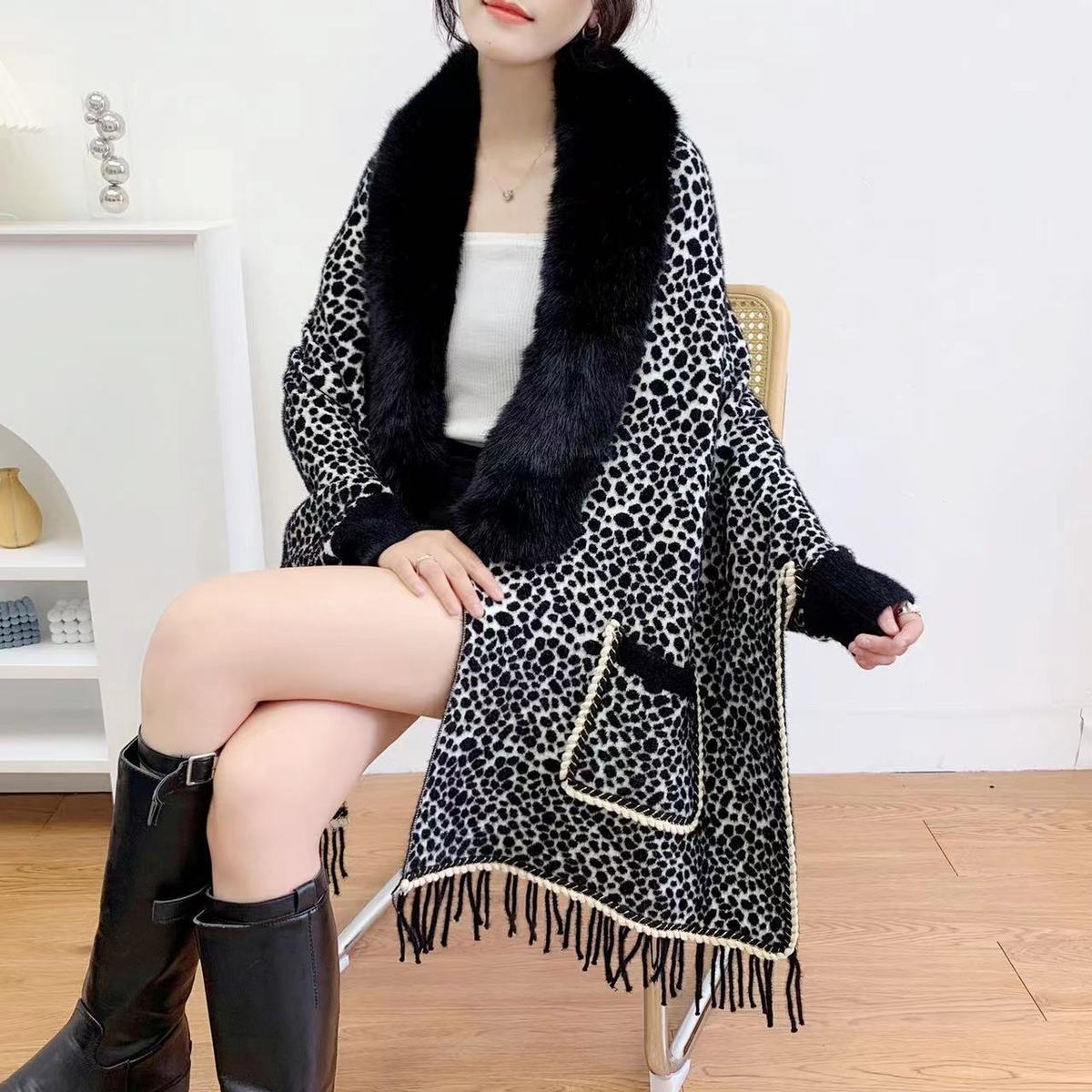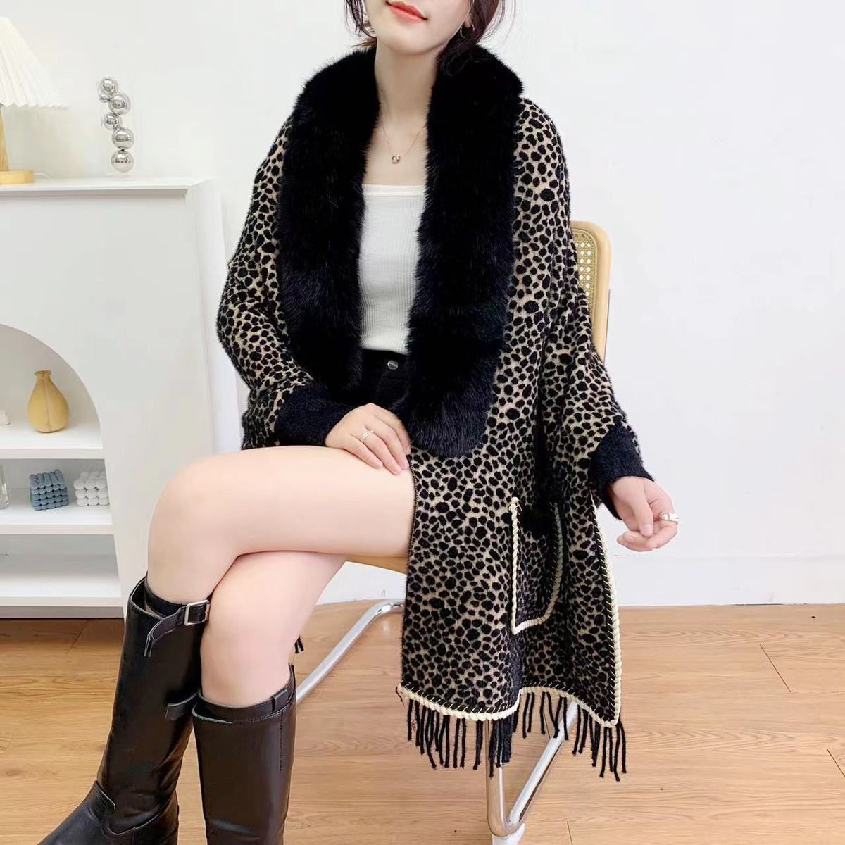 Chal de piel sintética de visón con mangas anudadas y estampado de leopardo, estilo capa, bufanda, estilo Chanel con bolsillo, abrigo suéter holgado para mujer