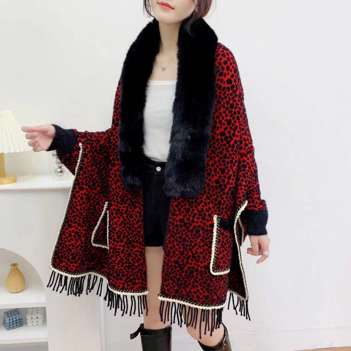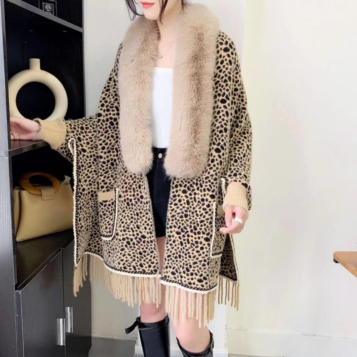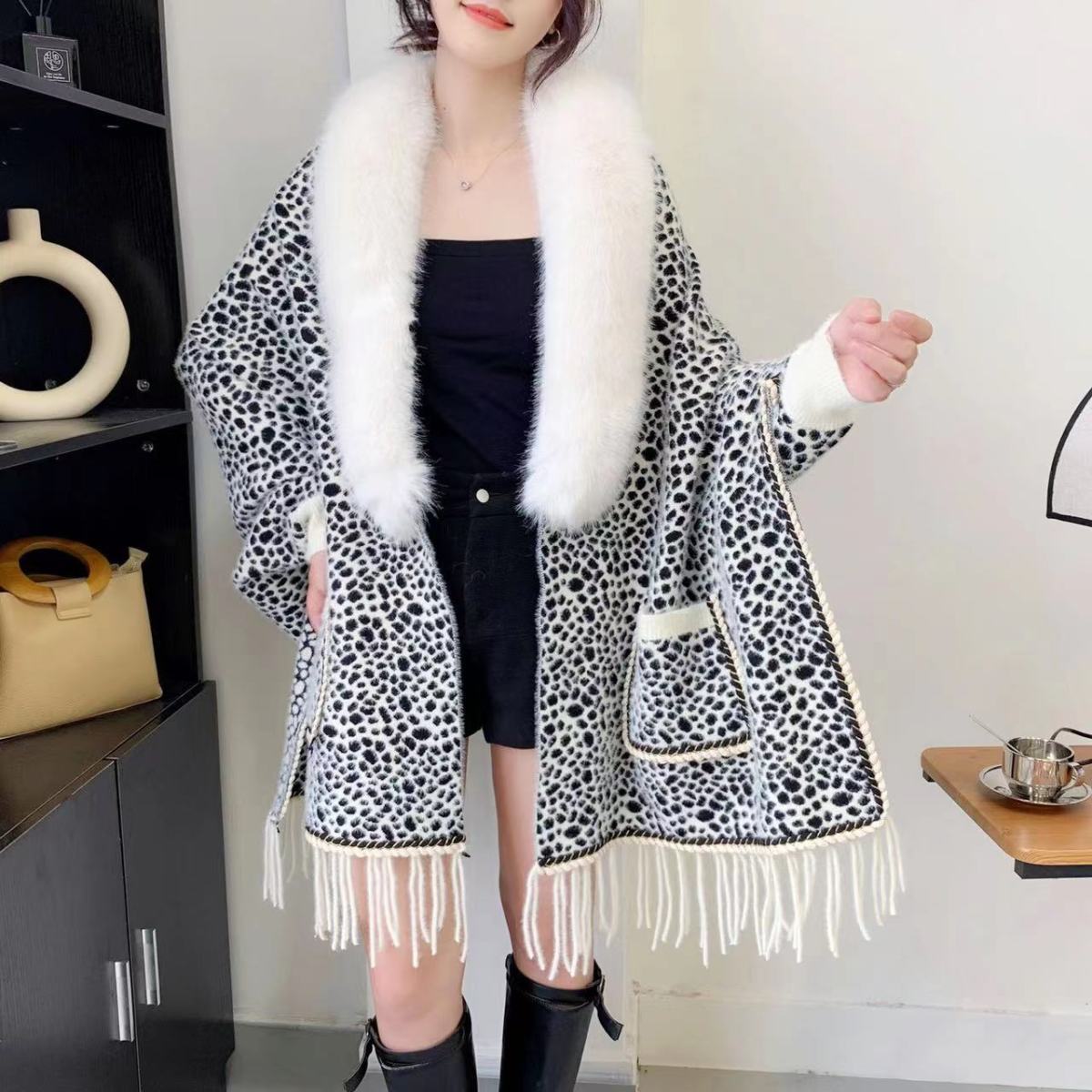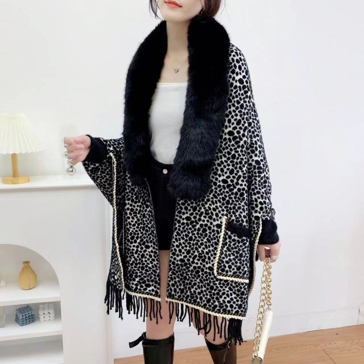 Chal de piel sintética de visón con mangas anudadas y estampado de leopardo, estilo capa, bufanda, estilo Chanel con bolsillo, abrigo suéter holgado para mujer