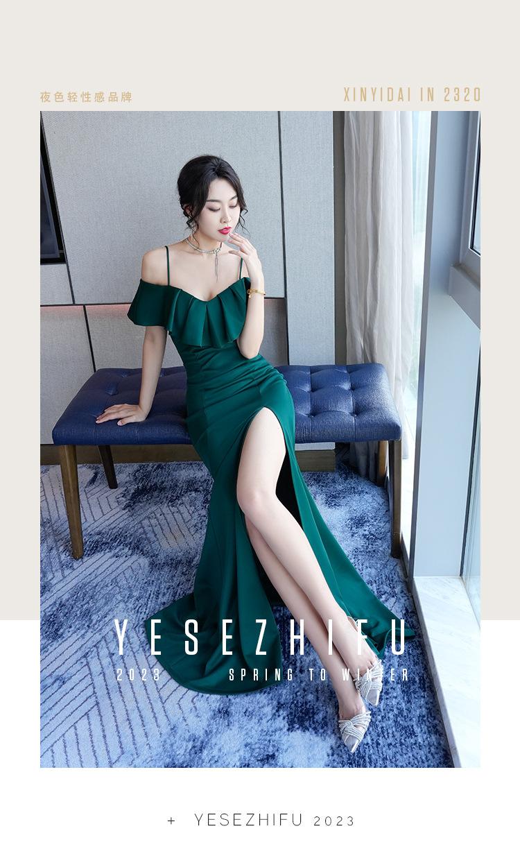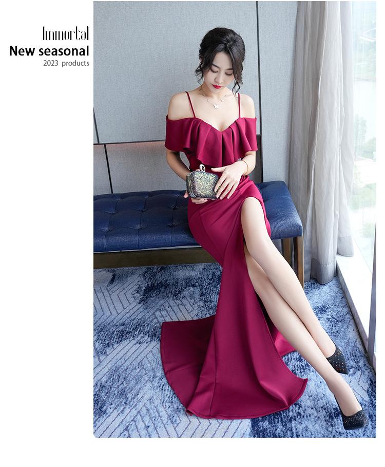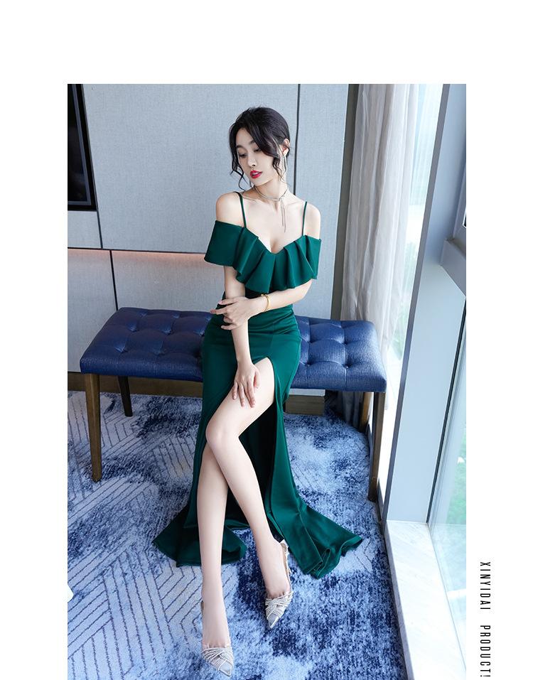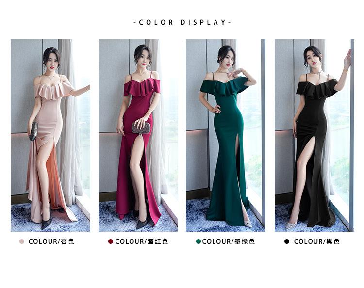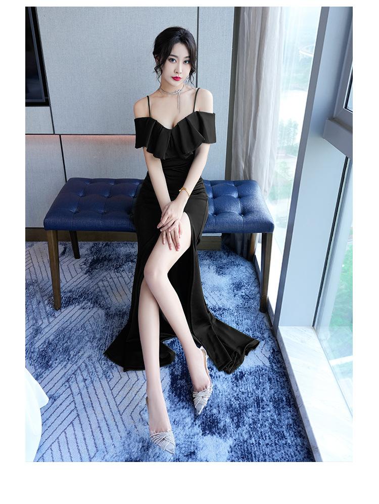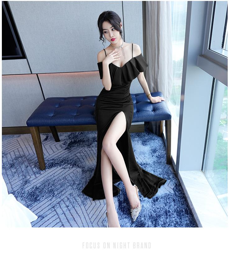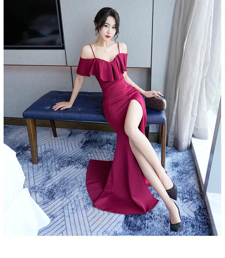 Sexy Tirantes Escote Bajo Un Hombro Manga Hoja de Loto Falda Larga Ajustada Abertura Alta Club Nocturno Cóctel Fiesta Modelo Brindis Vestido de Noche