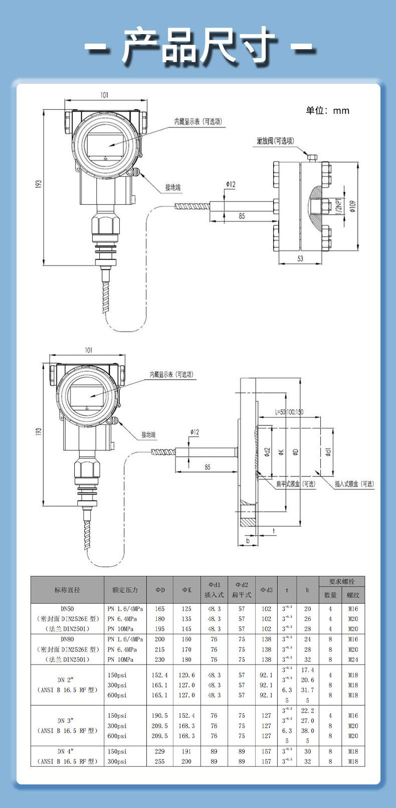 0-0.4KPa-40KPa + 316l + DN50 PN1/4MPa insert length 50mm, 0-2.5KPa-250KPa + 316l + DN50 PN1/4MPa insert length...