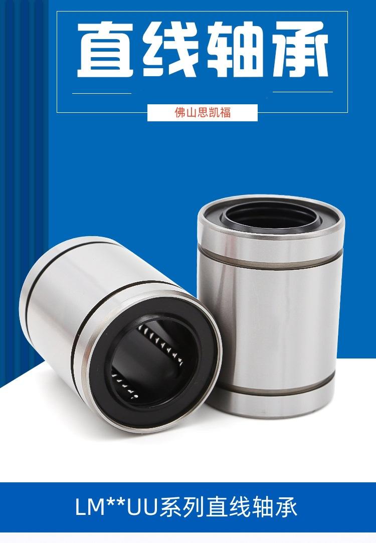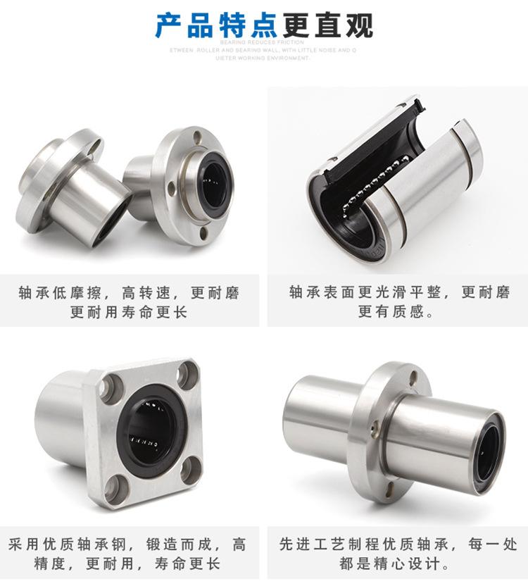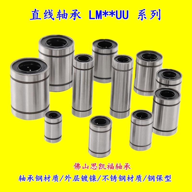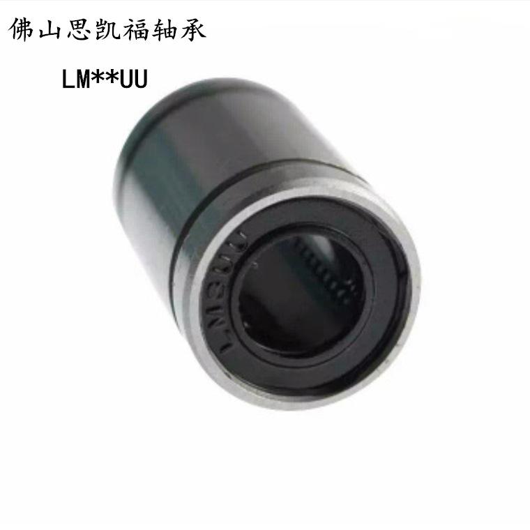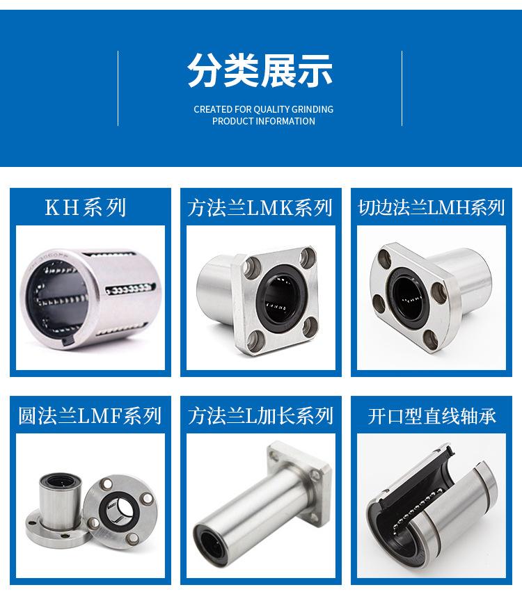 Tipo estándar (LM/LME/LMB..UU), tipo de ajuste (LM/LME..UUAJ), tipo abierto (LM/LME..UUOP); tipo extendido (LM/LME..LUU); tipo brida (LMF/LMK/LMH..UU, LMEF/LMEK..UU), tipo brida extendido (LMF/LMK/LMH..LUU, LMEF/LMEK..LUU), tipo brida de montaje intermedio (LMFC LMKC), tipo brida con extremo guía (LMF-E/LMK-E), tipo simple KH, tipo autolubricante OB, corredera lineal tipo abierto LMC/LMG, etc.
