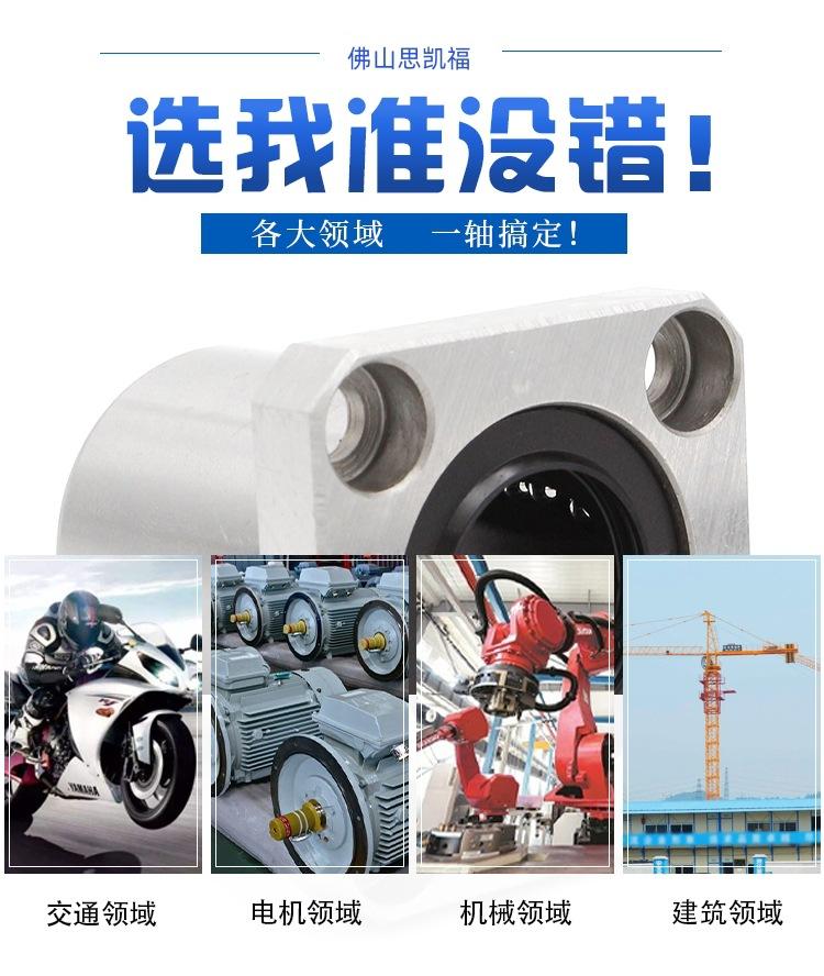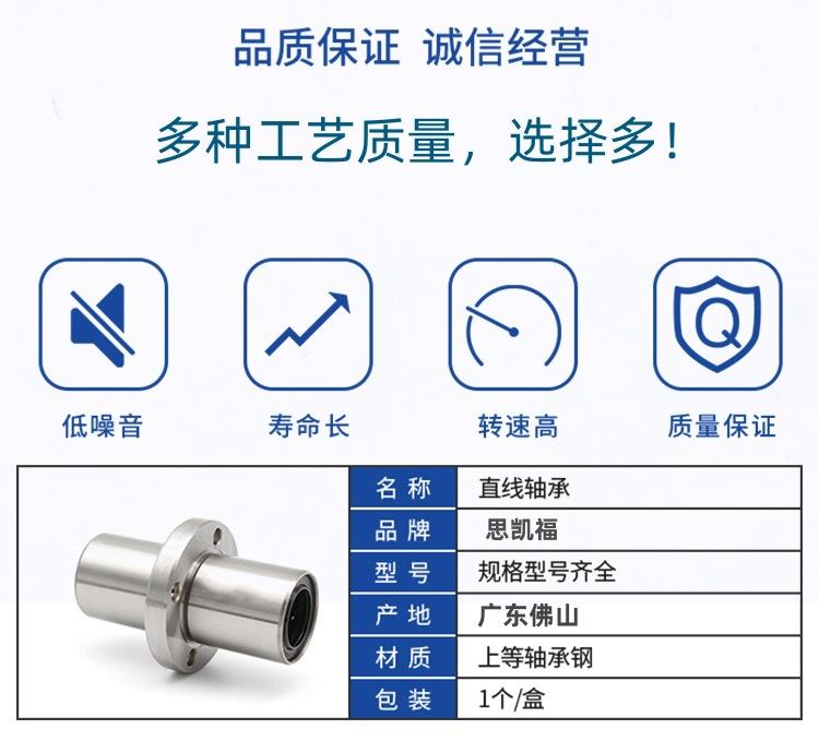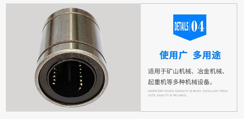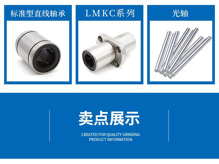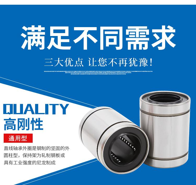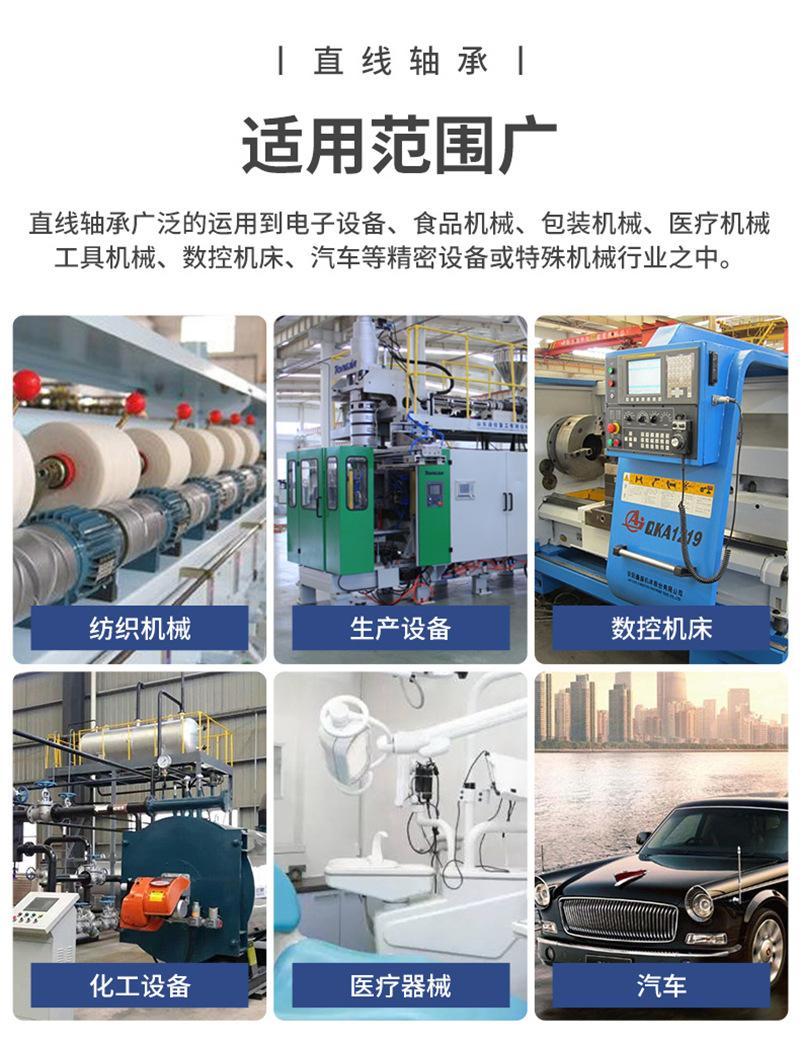 Tipo estándar (LM/LME/LMB..UU), tipo de ajuste (LM/LME..UUAJ), tipo abierto (LM/LME..UUOP); tipo extendido (LM/LME..LUU); tipo brida (LMF/LMK/LMH..UU, LMEF/LMEK..UU), tipo brida extendido (LMF/LMK/LMH..LUU, LMEF/LMEK..LUU), tipo brida de montaje intermedio (LMFC LMKC), tipo brida con extremo guía (LMF-E/LMK-E), tipo simple KH, tipo autolubricante OB, corredera lineal tipo abierto LMC/LMG, etc.