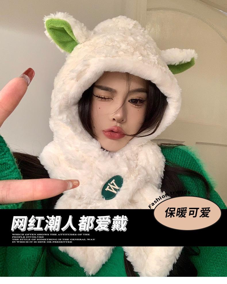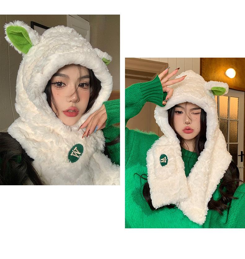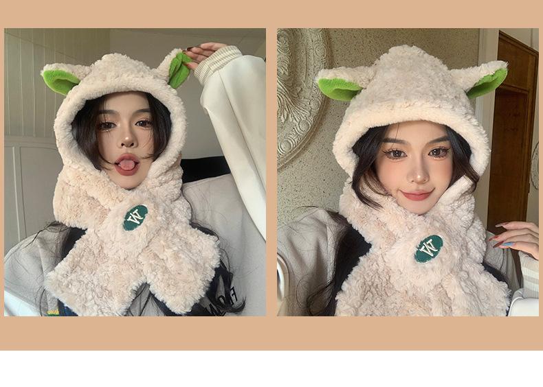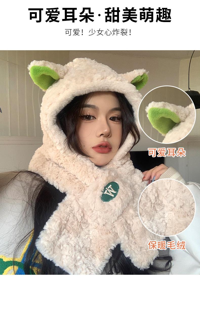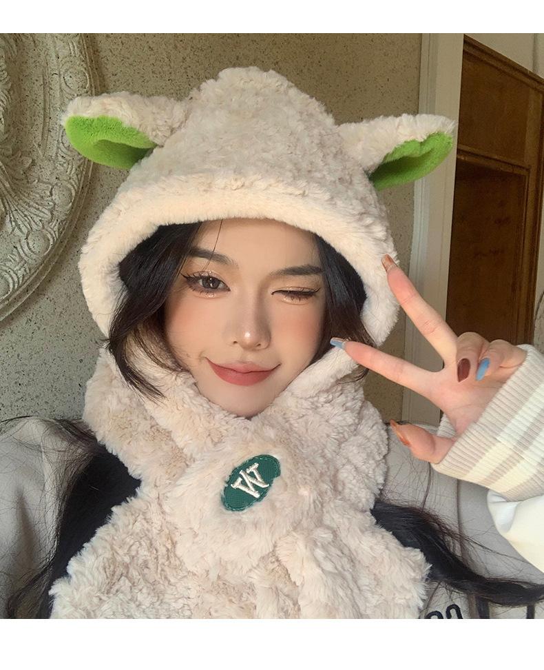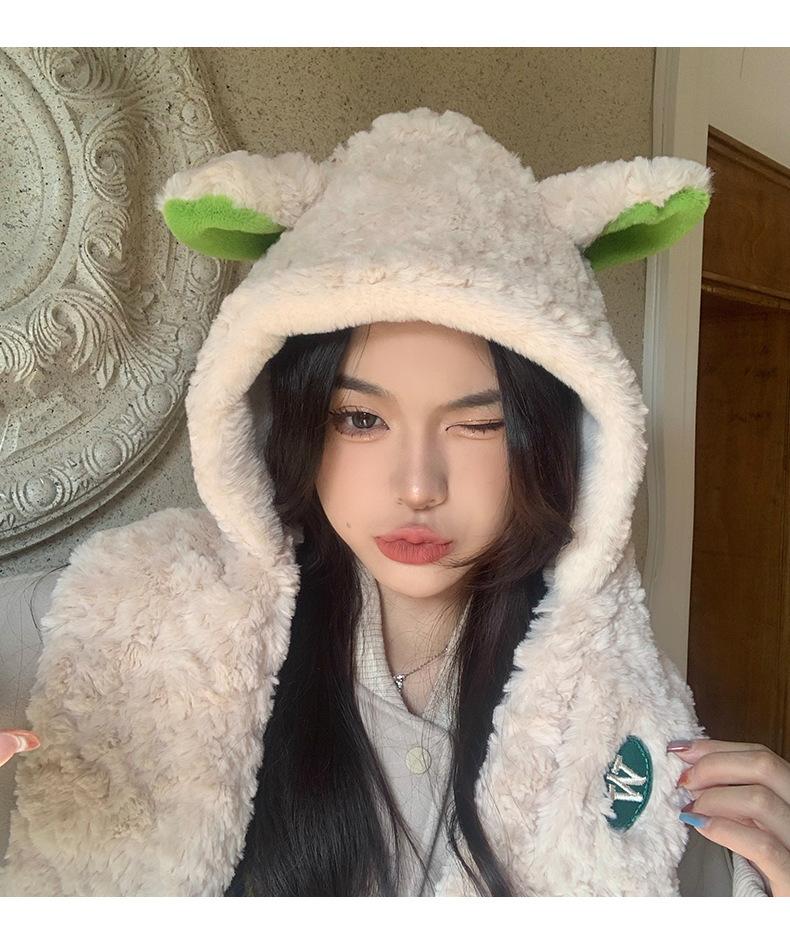 Lindo gorro y bufanda de cordero integrados para mujer, gorro peludo cálido con protección para las orejas, gorro de invierno Lei Feng para otoño e invierno.