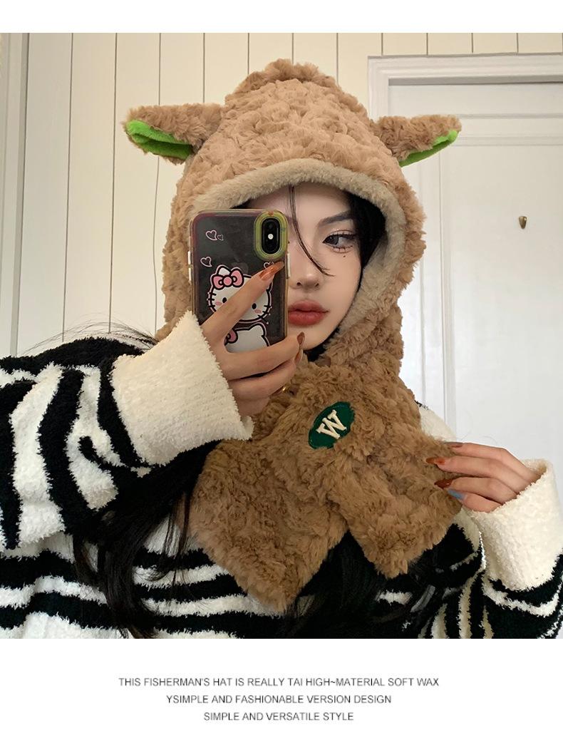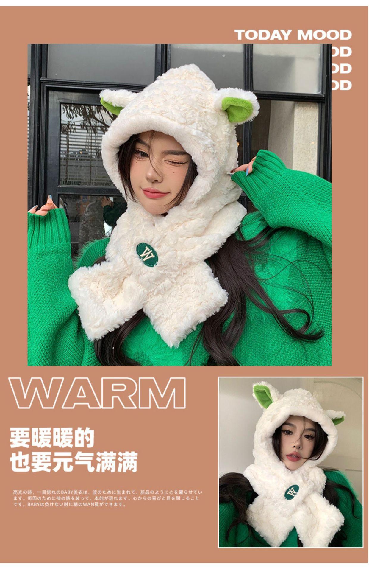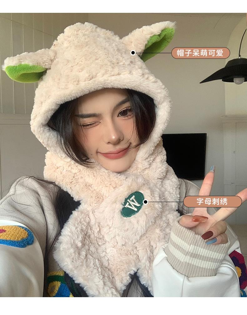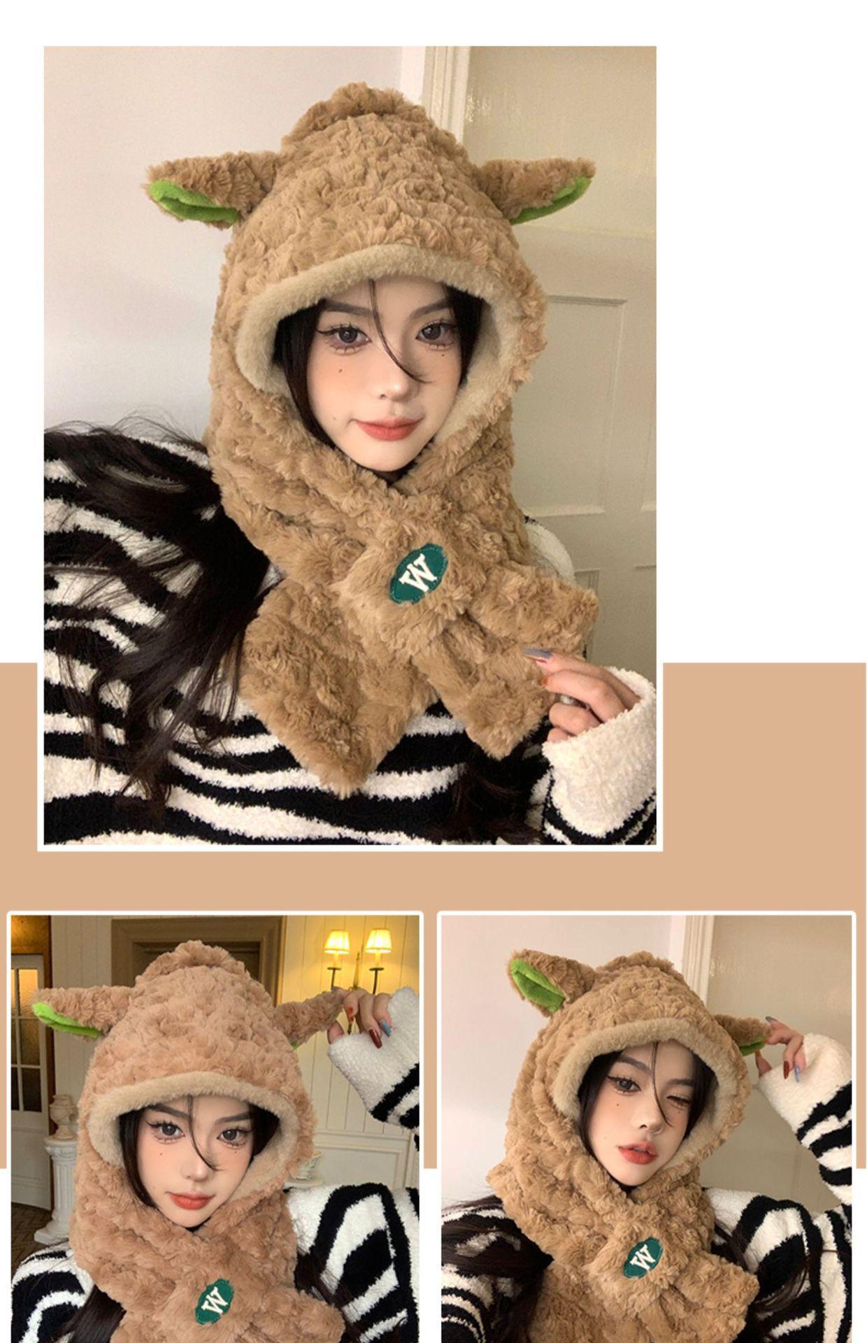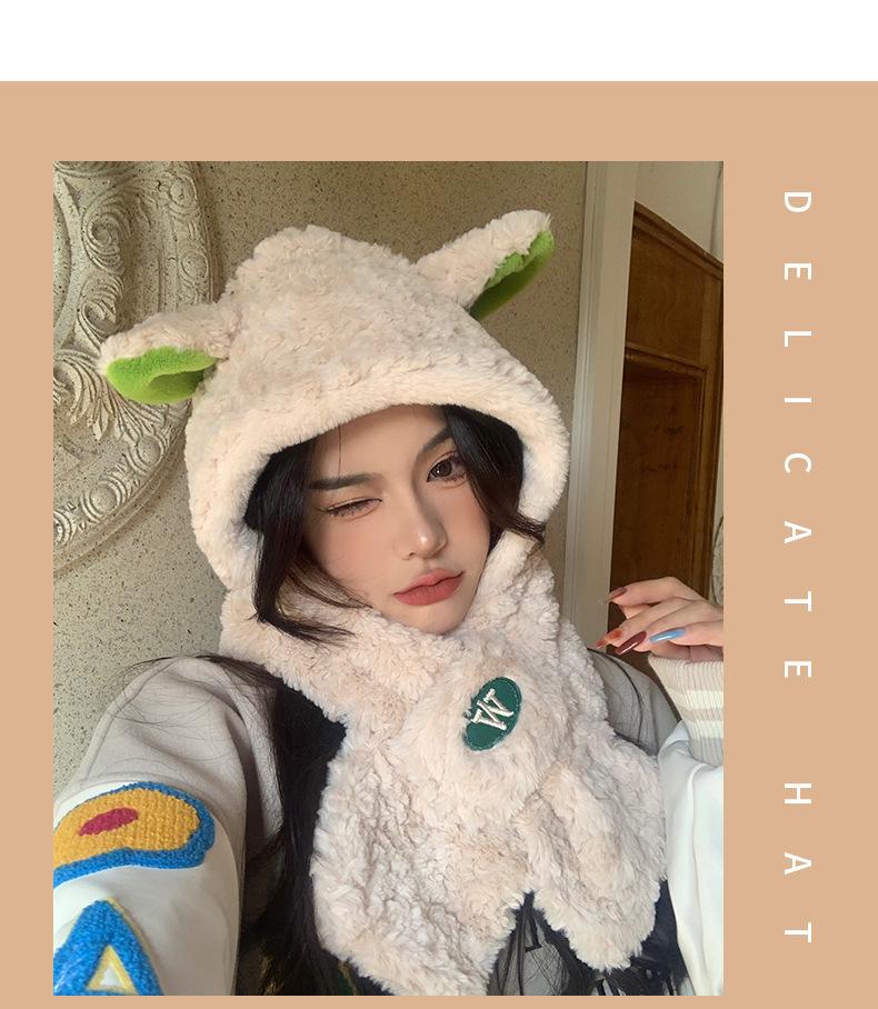 Lindo gorro y bufanda de cordero integrados para mujer, gorro peludo cálido con protección para las orejas, gorro de invierno Lei Feng para otoño e invierno.