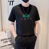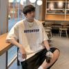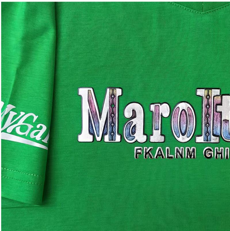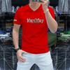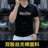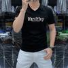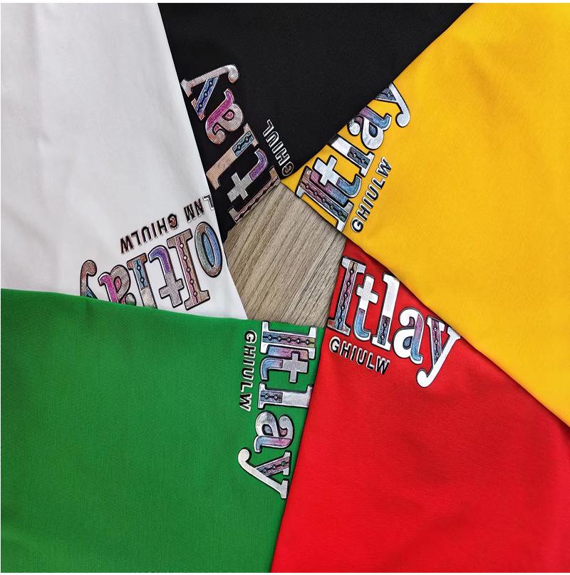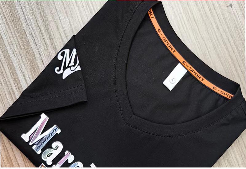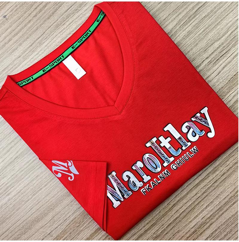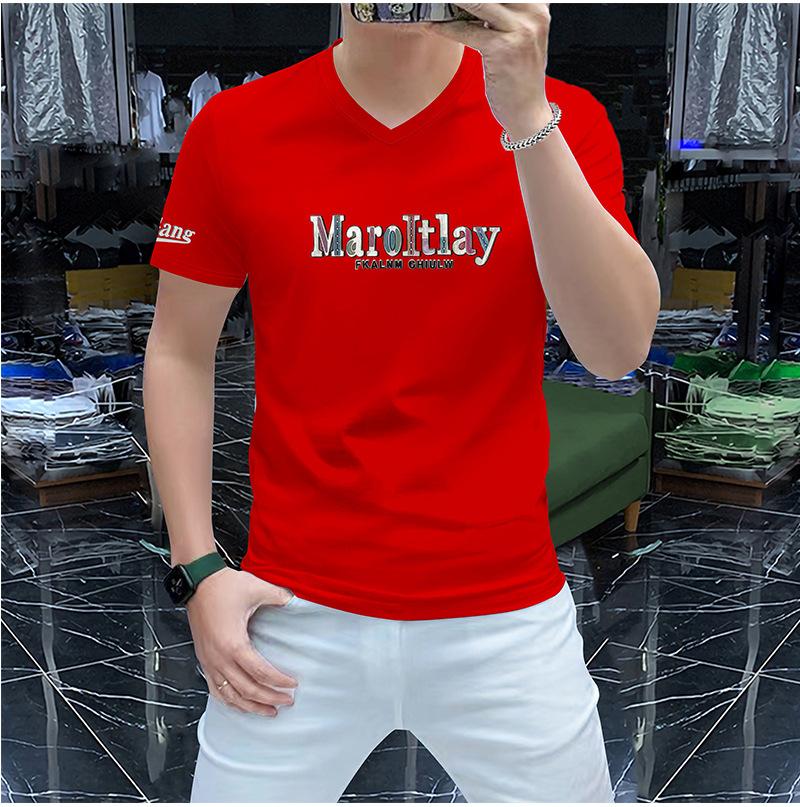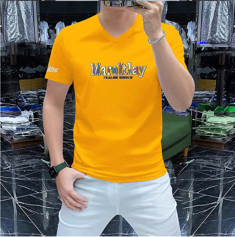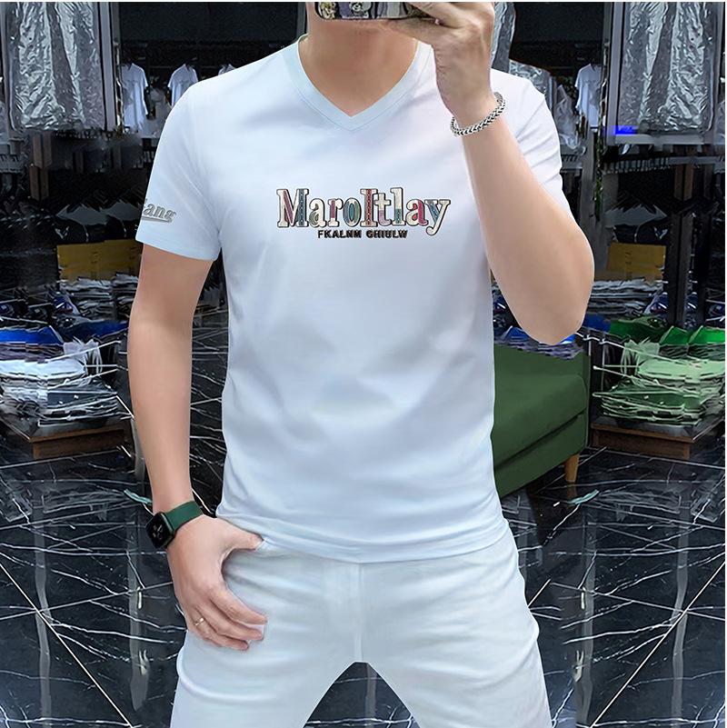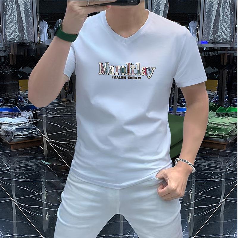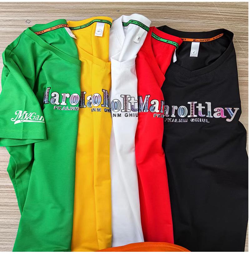 Camiseta de verano para hombre, nueva, de algodón mercerizado con cuello en V, letras coloridas, manga corta, cómoda, combinable, con cuello melocotón