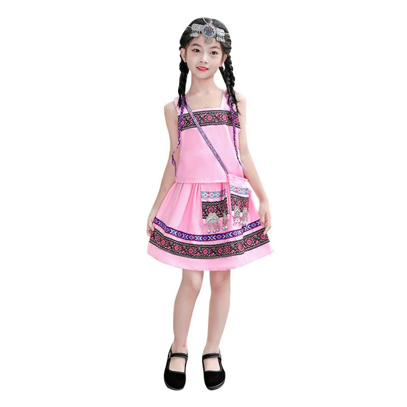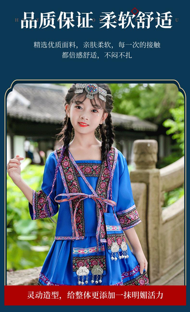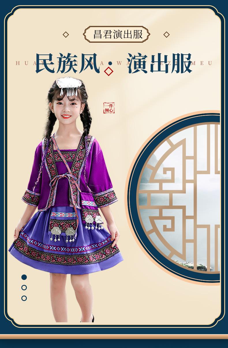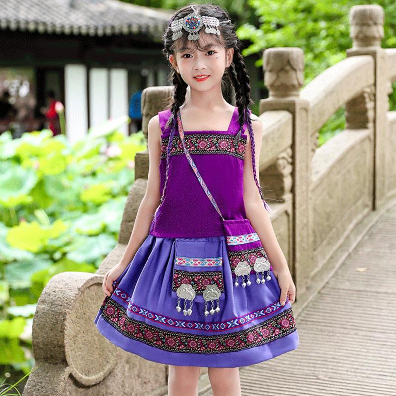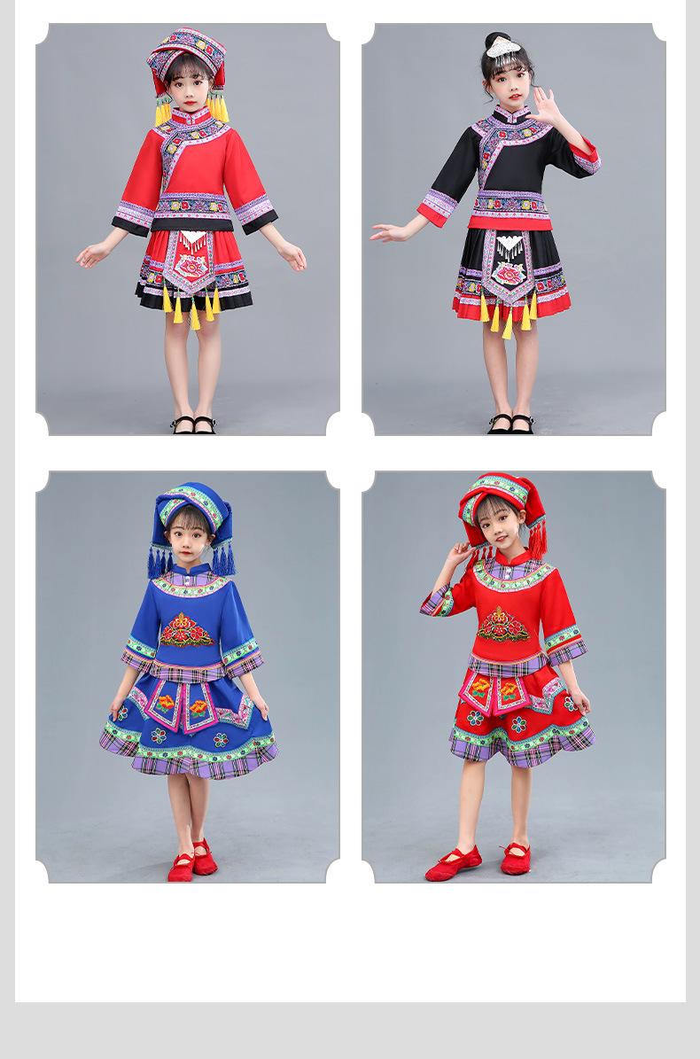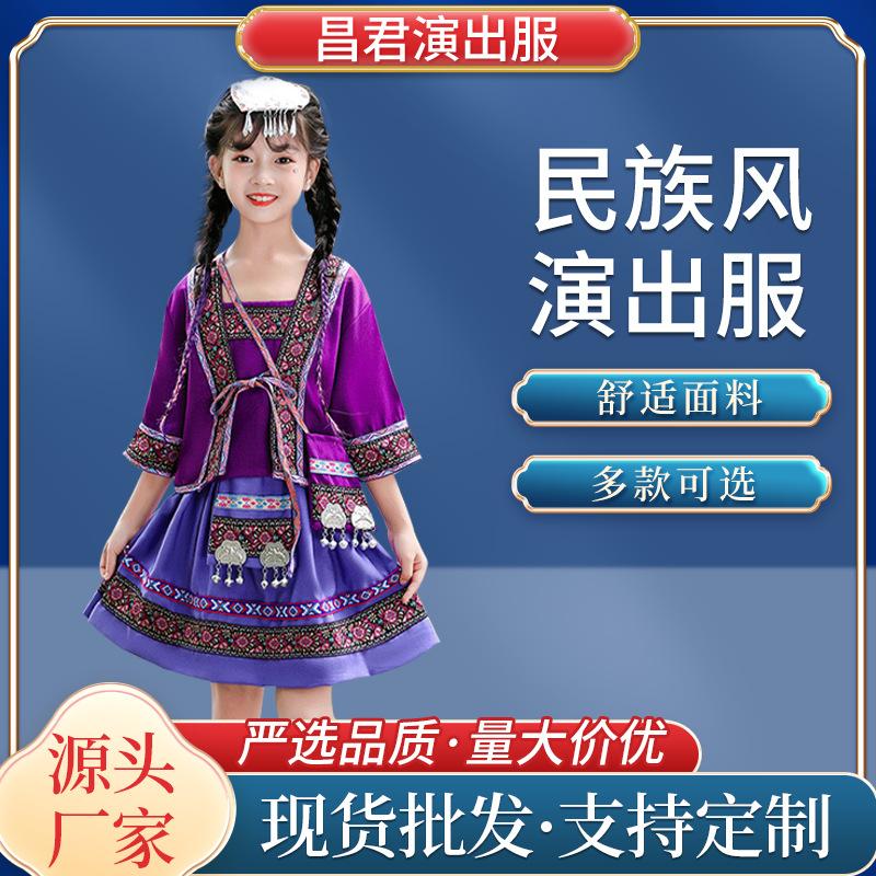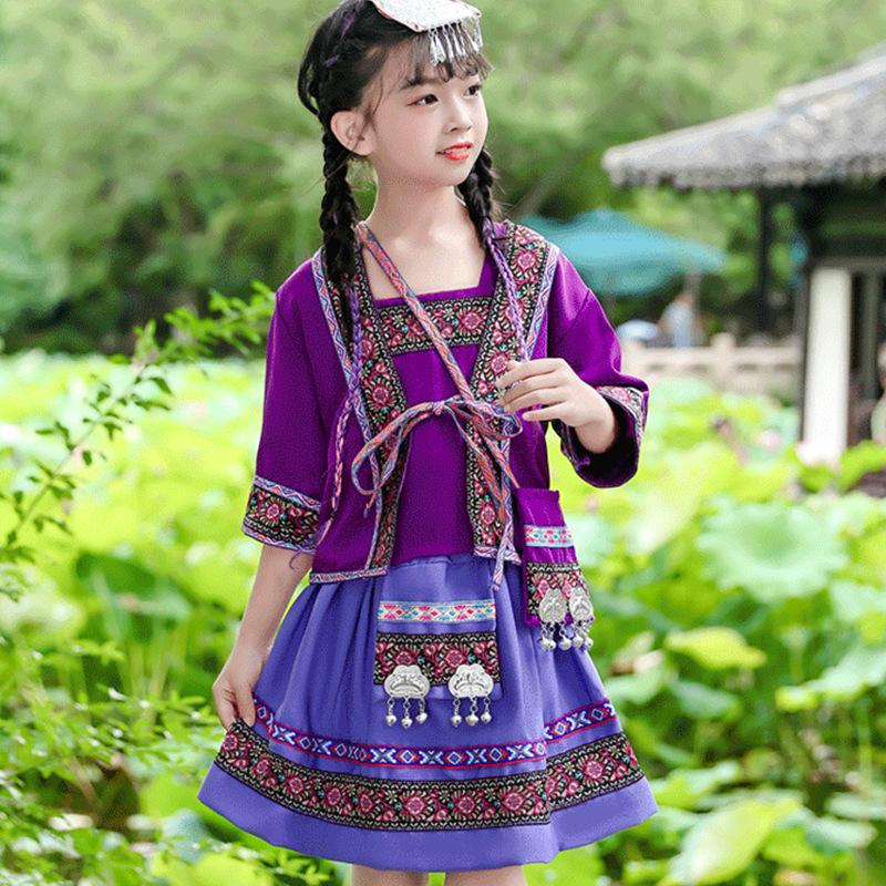 Venta al por mayor, disfraz étnico infantil del 3 de marzo, Zhuang Yi Miao, niña Yao Hani, ropa de actuación de manga corta