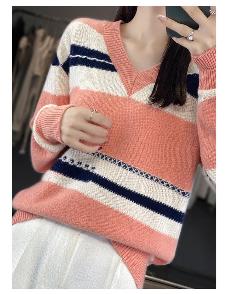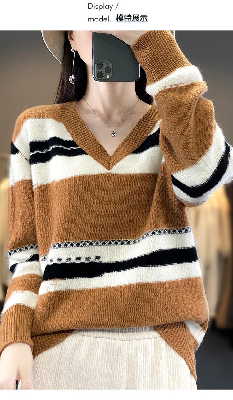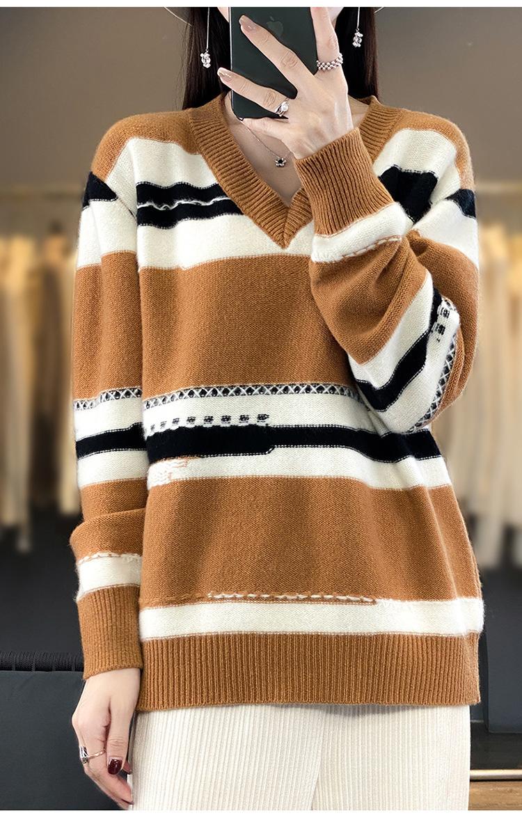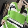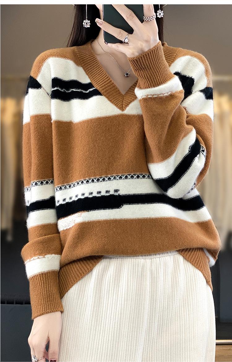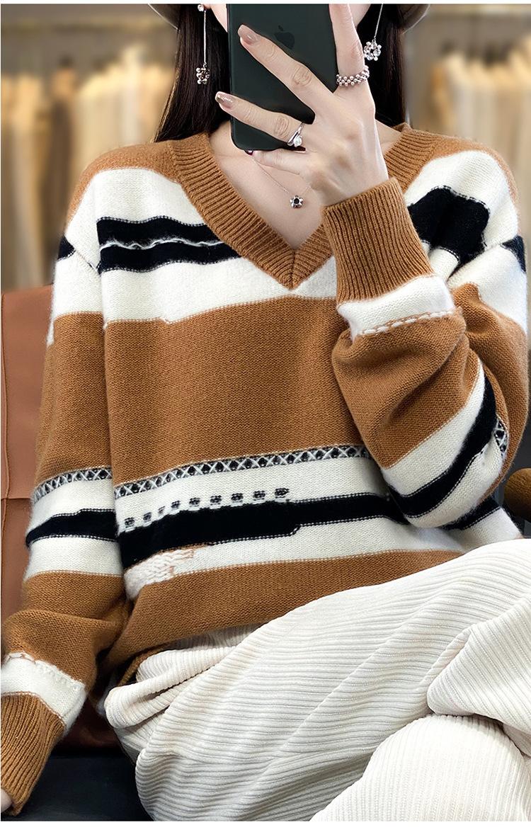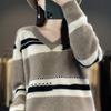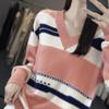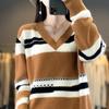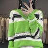 Camisa de lana a rayas de colores contrastantes para otoño e invierno, suéter holgado de manga larga, top de punto ajustado y a juego.