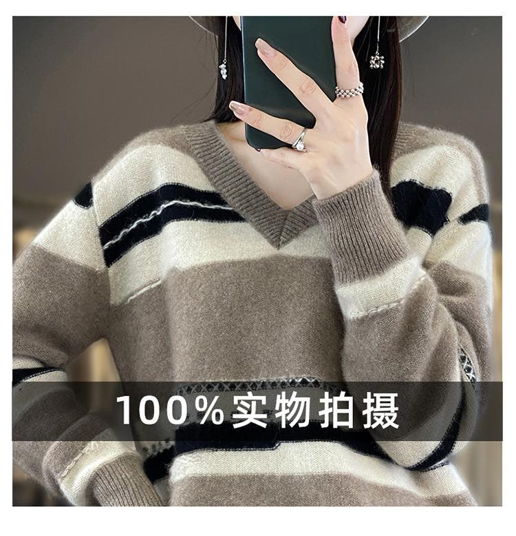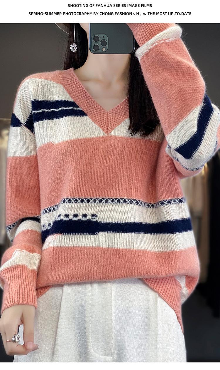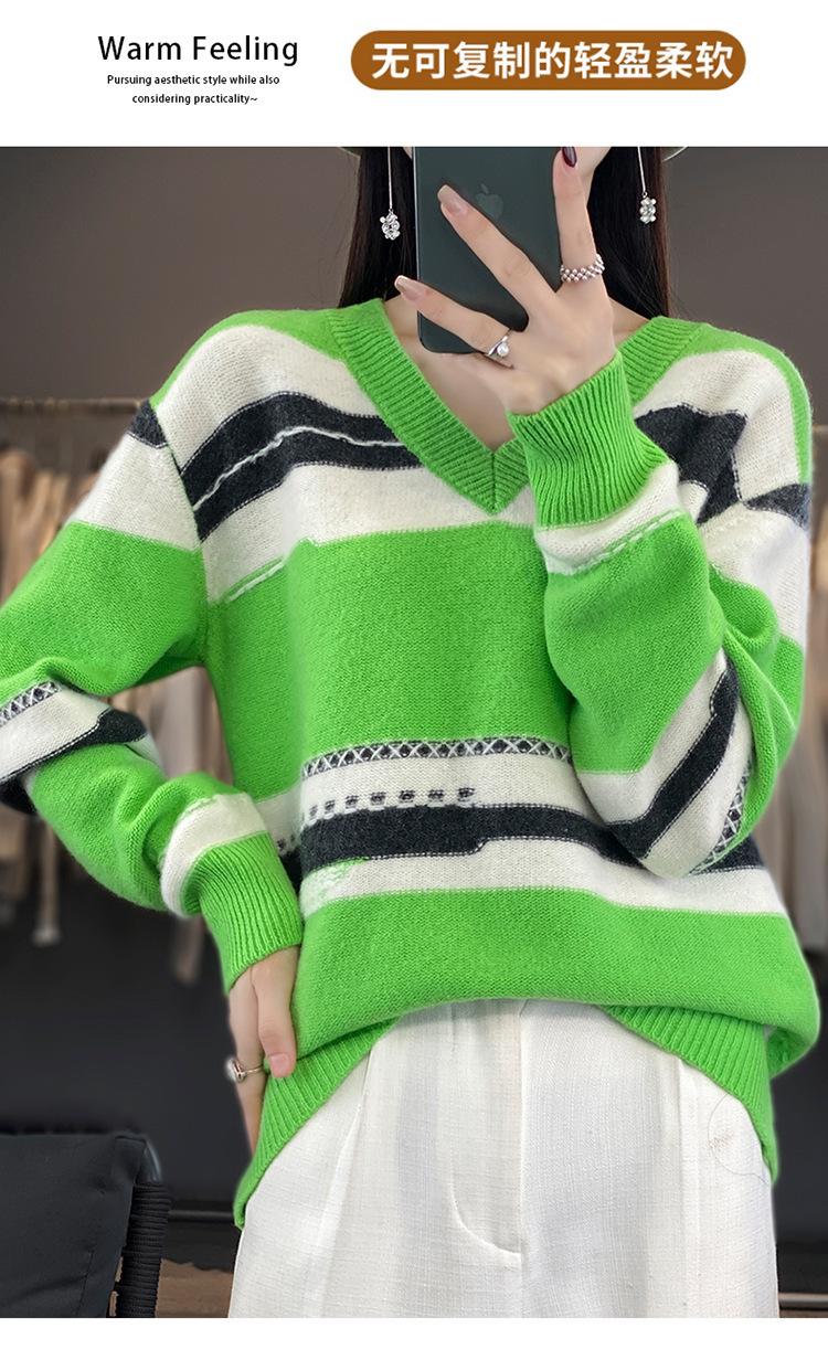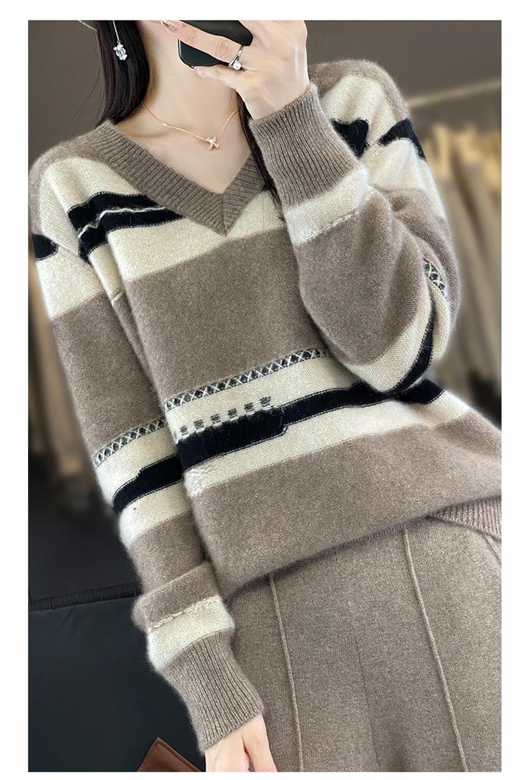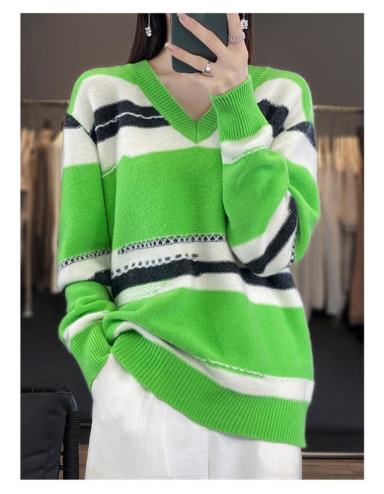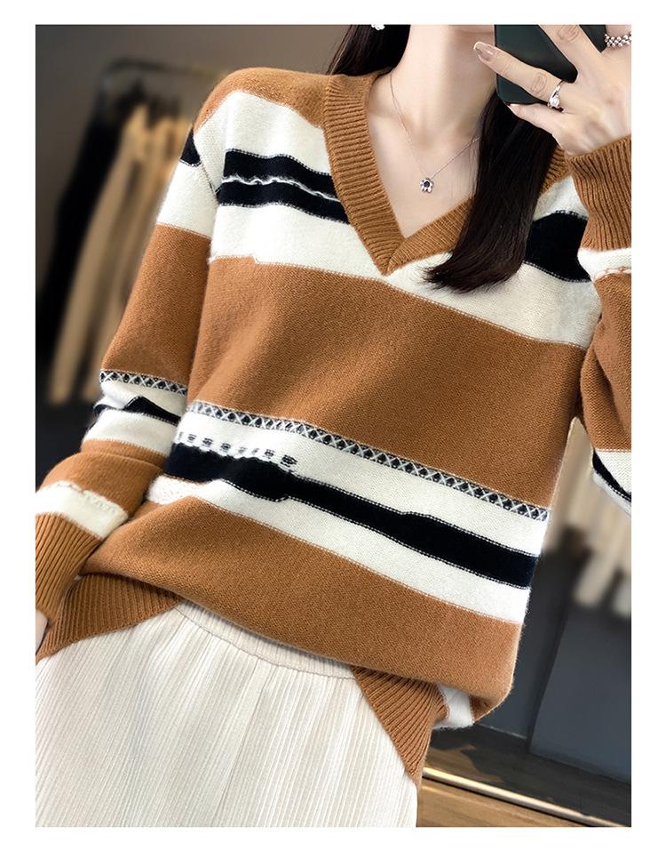 Camisa de lana a rayas de colores contrastantes para otoño e invierno, suéter holgado de manga larga, top de punto ajustado y a juego.
