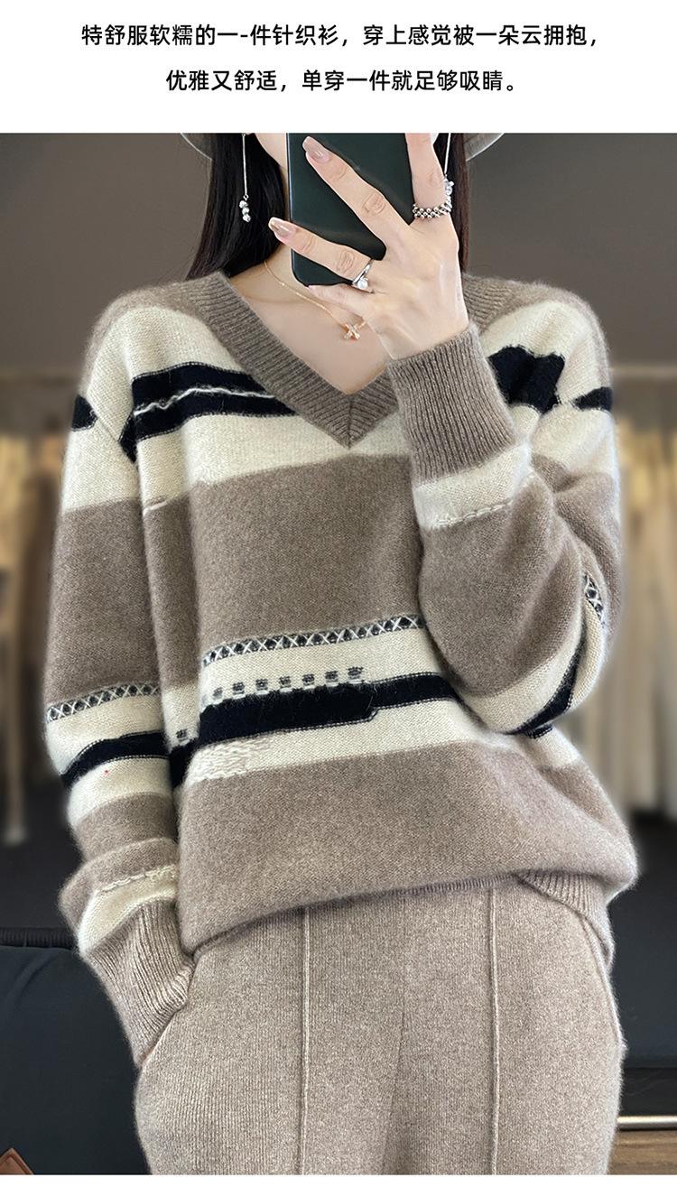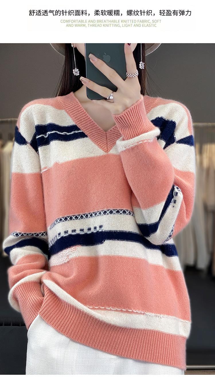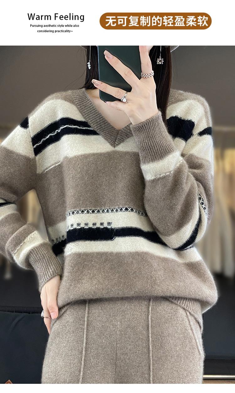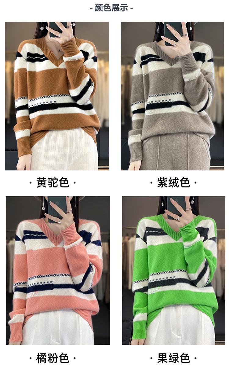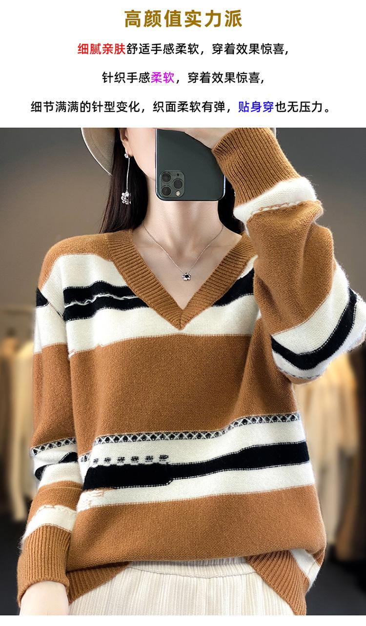 Camisa de lana a rayas de colores contrastantes para otoño e invierno, suéter holgado de manga larga, top de punto ajustado y a juego.