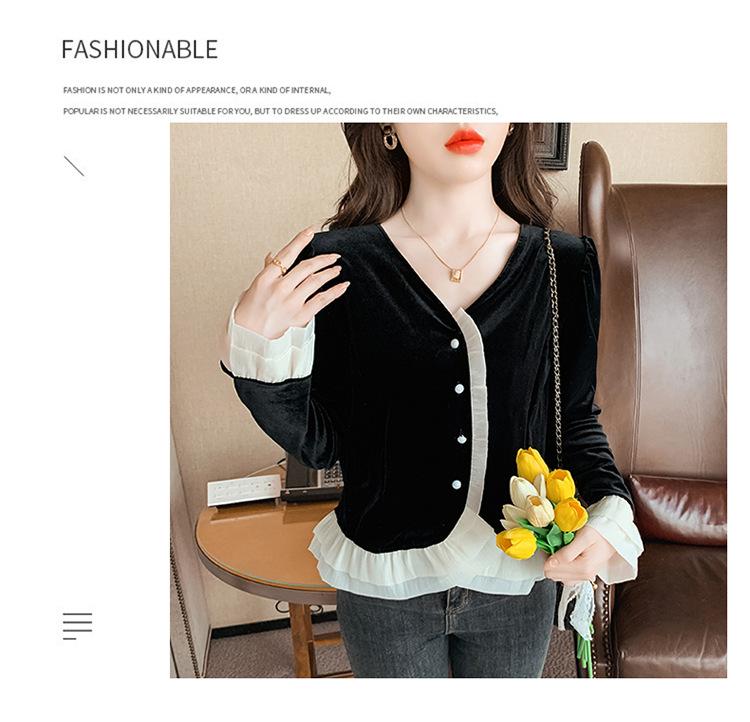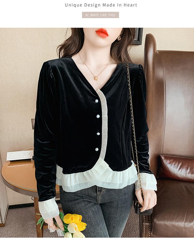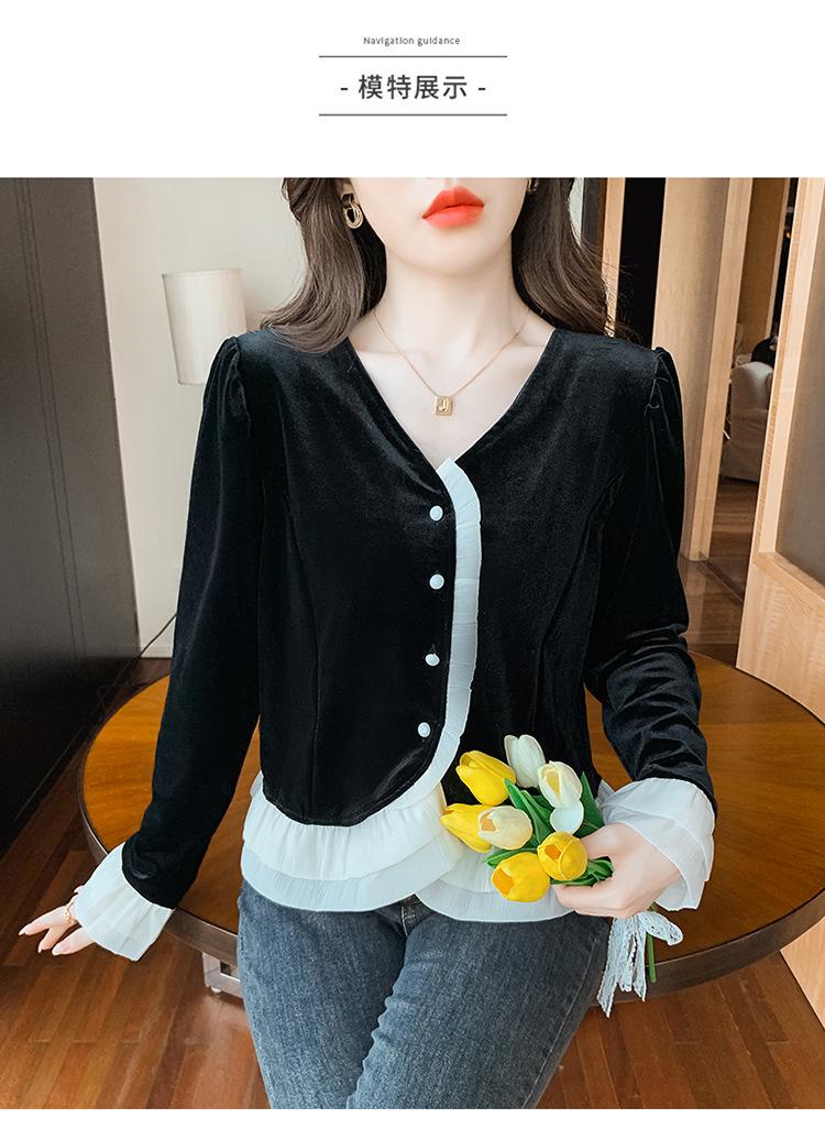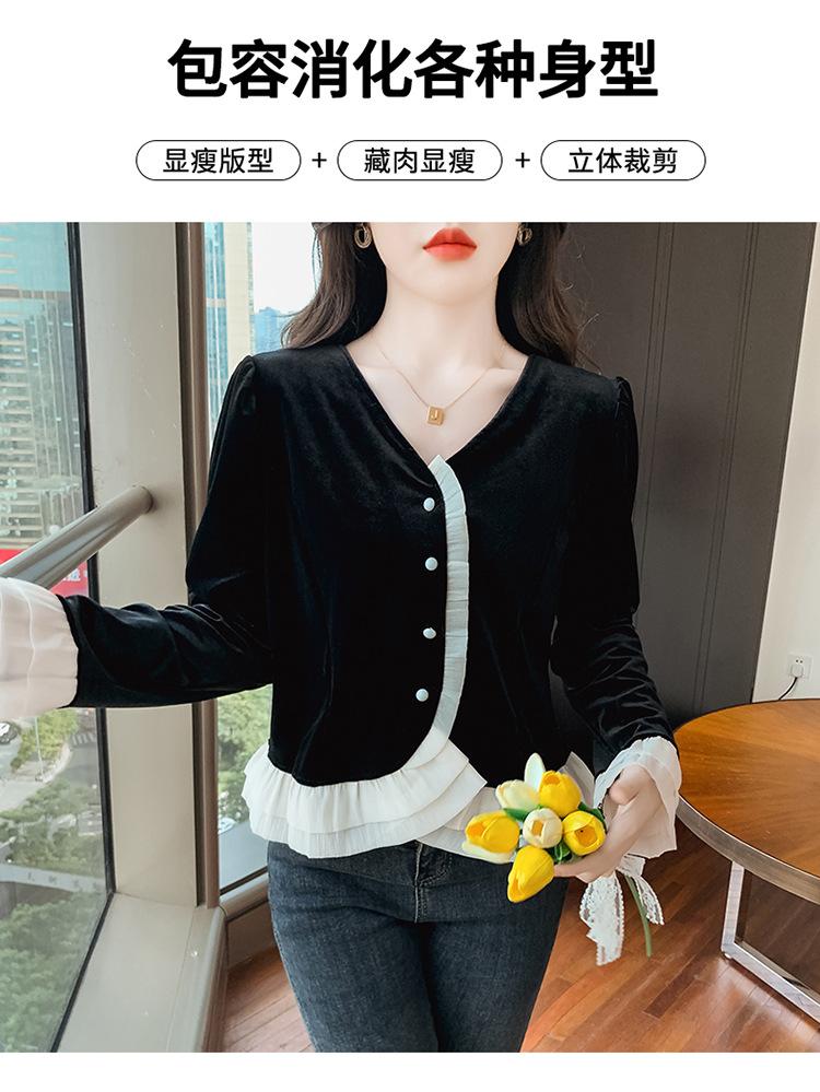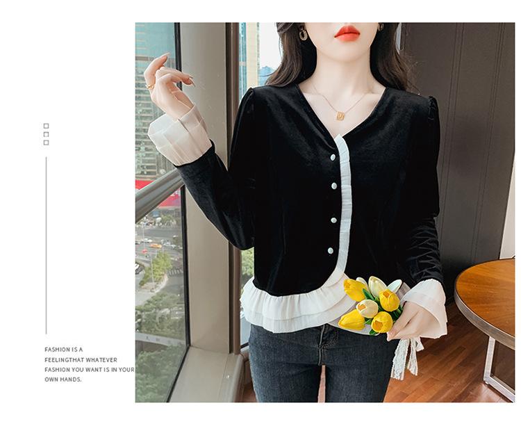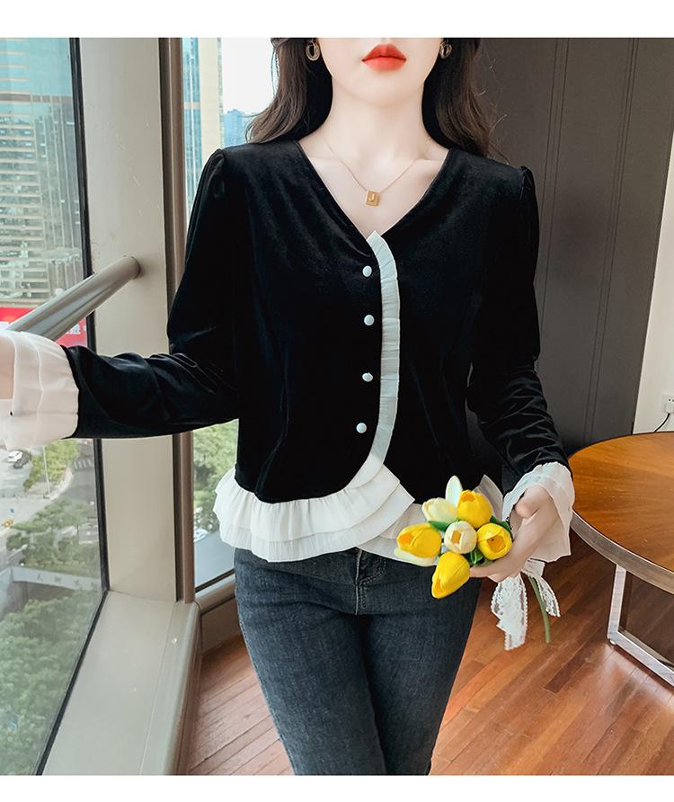Camisa de encaje de terciopelo dorado estilo chino para mujer, nueva moda de otoño 2023, blusa negra elegante retro
