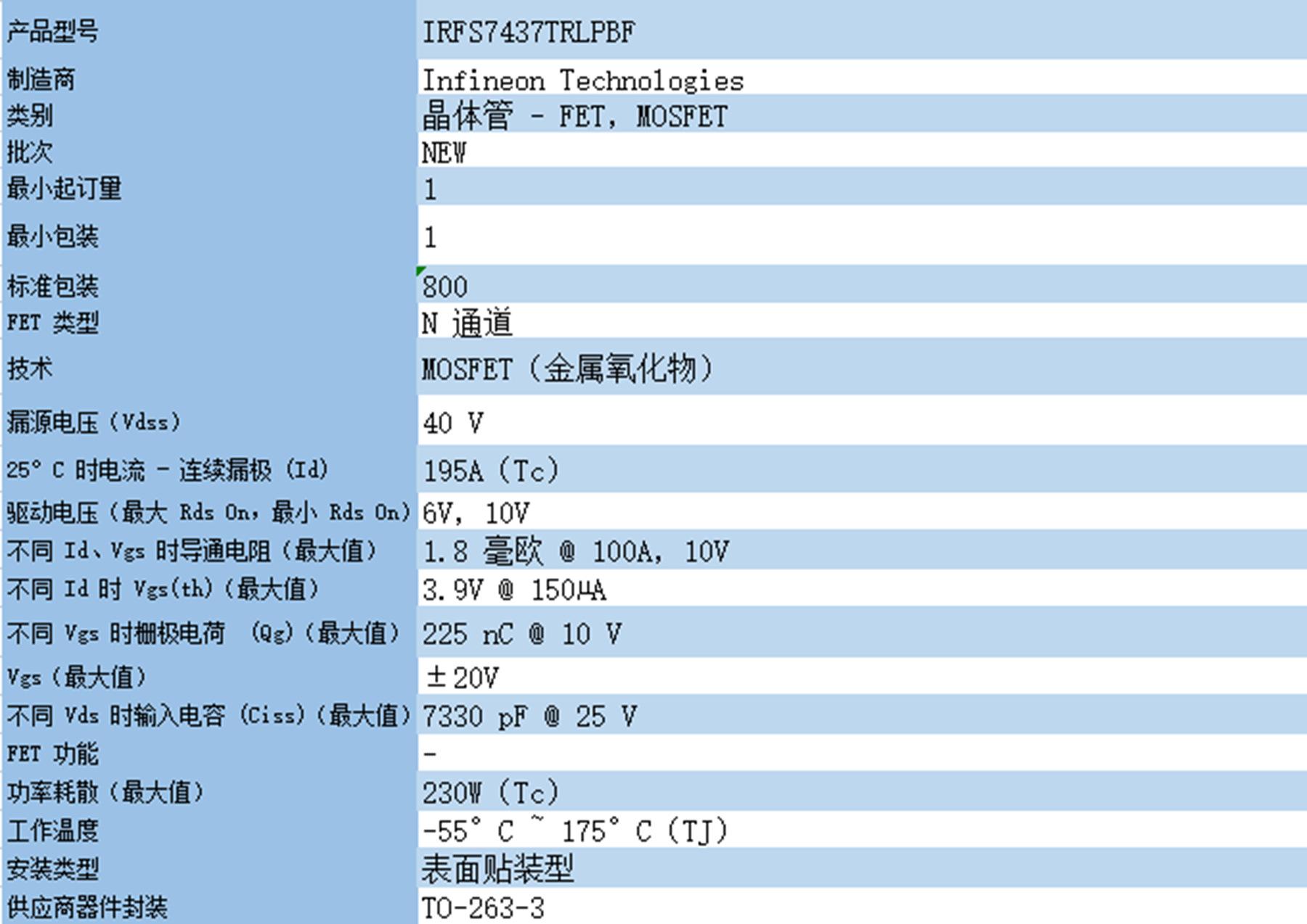 Transistor de efecto de campo de canal N IRFS7437TRLPBF, 40 V, 195 A, 230 W, parche TO263