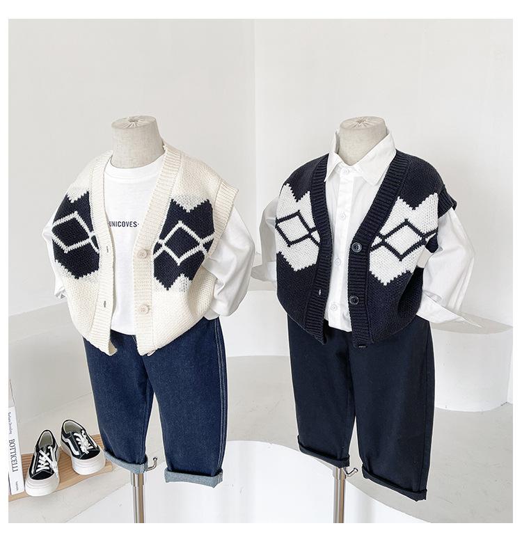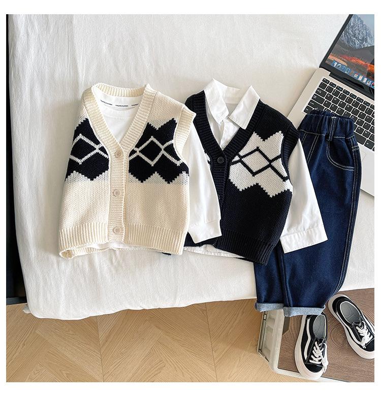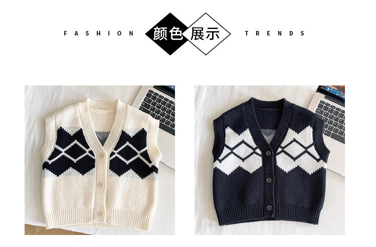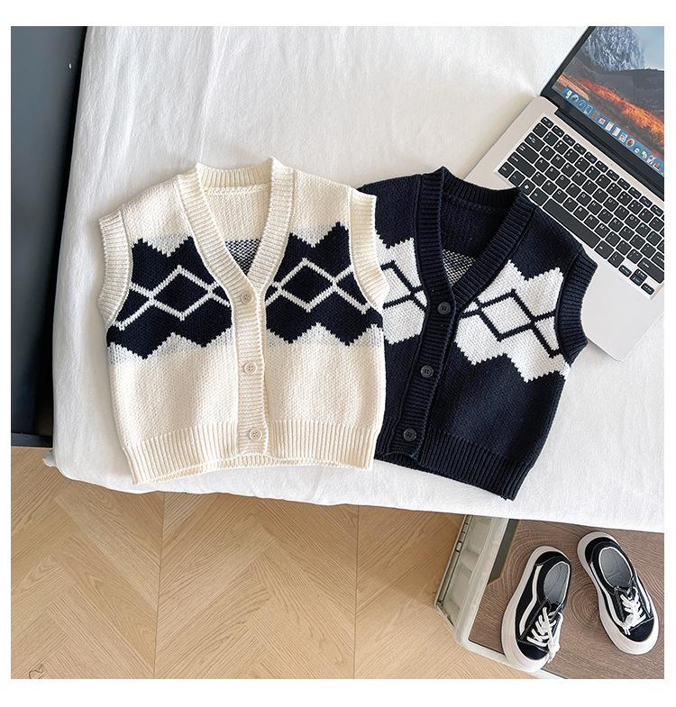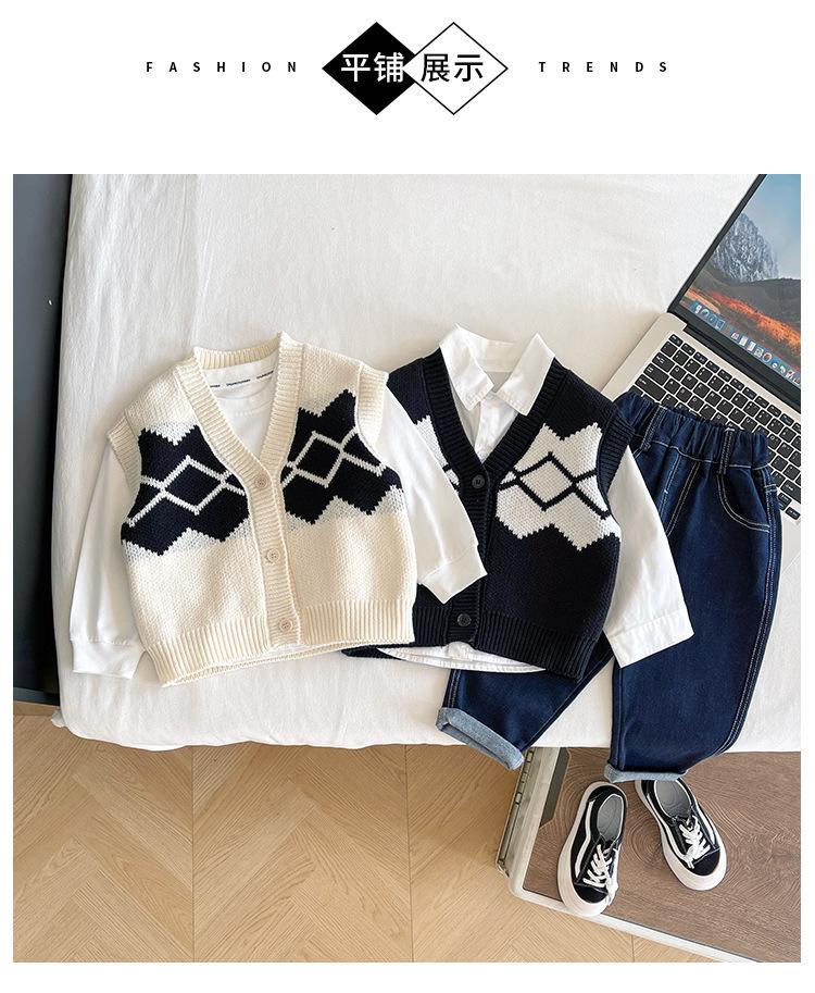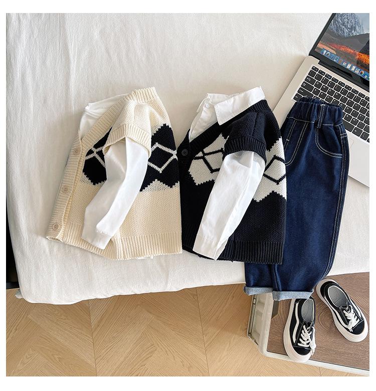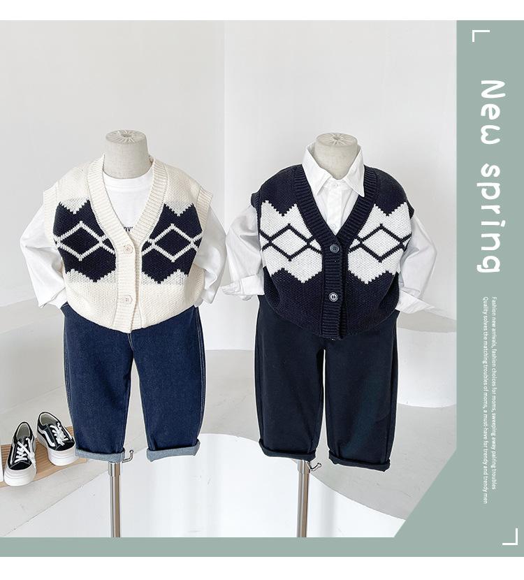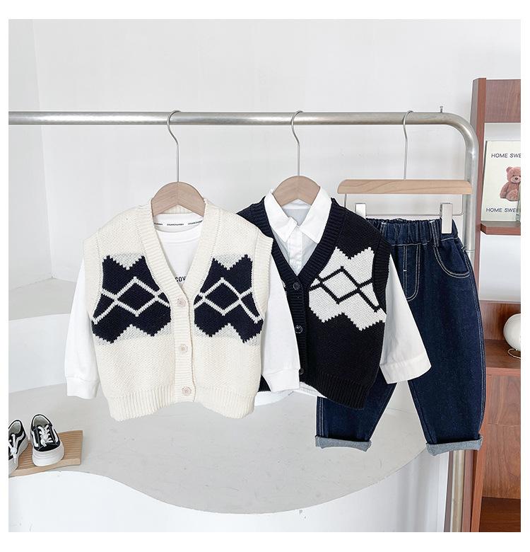 Fengzhigu 2024 principios de primavera nueva ropa para niños estilo universitario coreano chaleco de punto Jacquard cárdigan de todo fósforo para niños