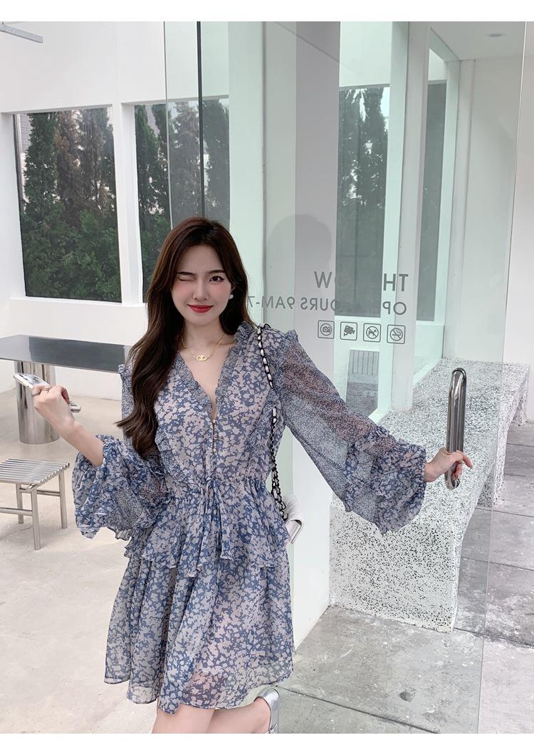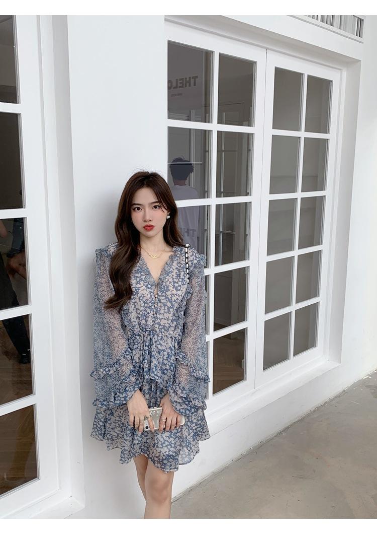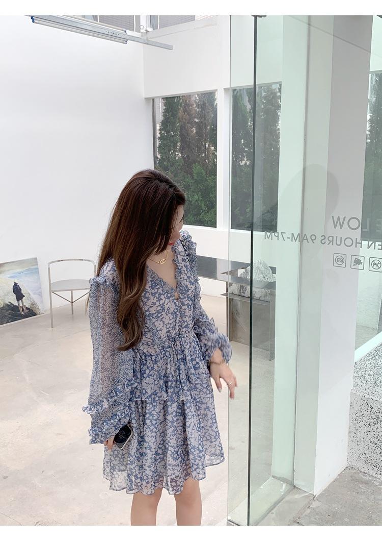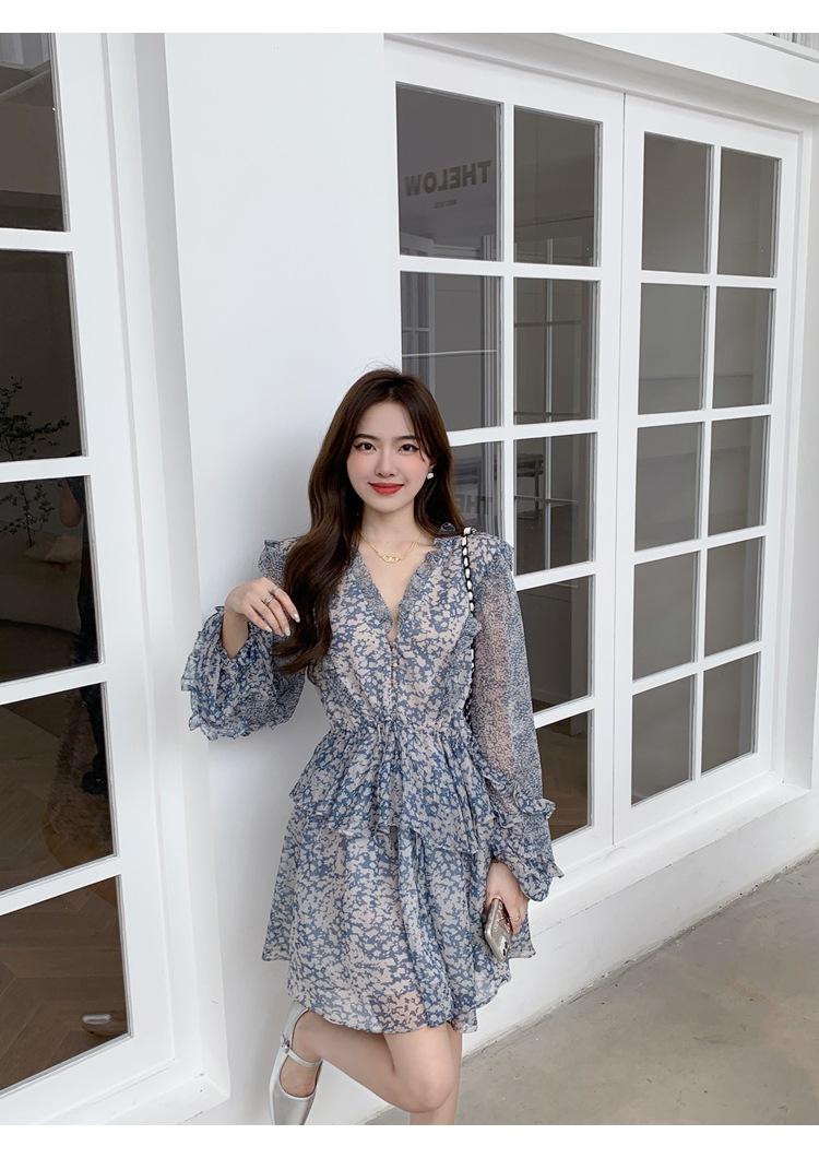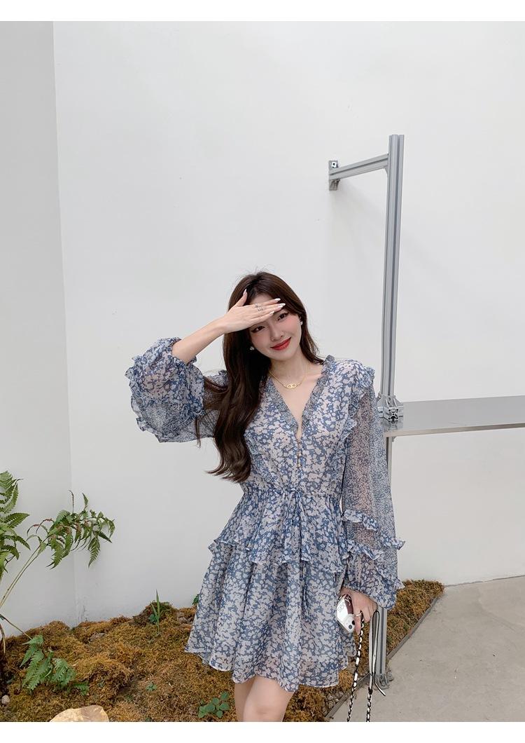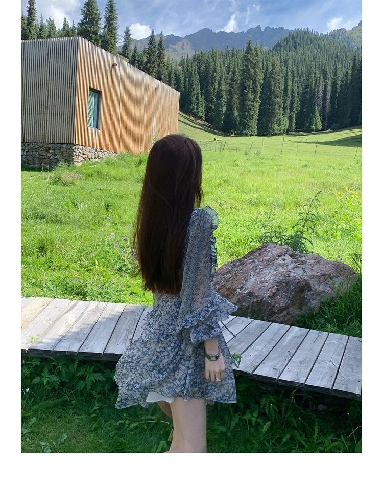 Los volantes dobles del escote se prolongan en el dobladillo y tienen un diseño de borde rizado.