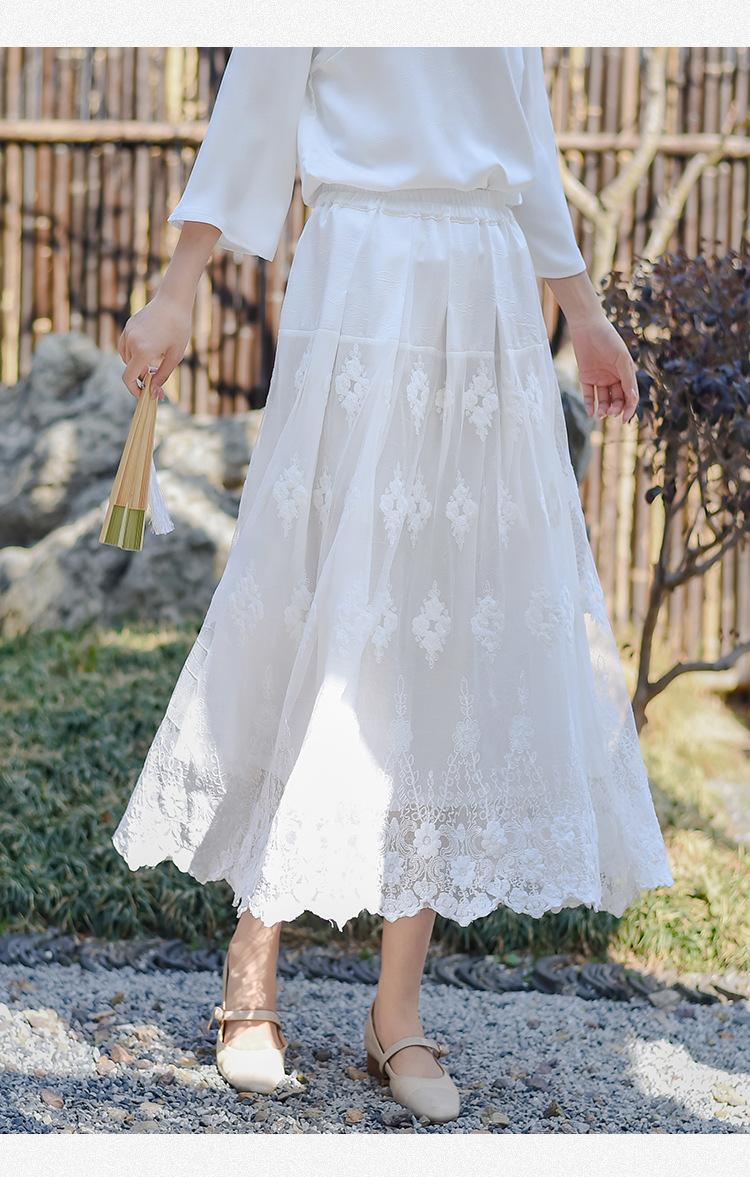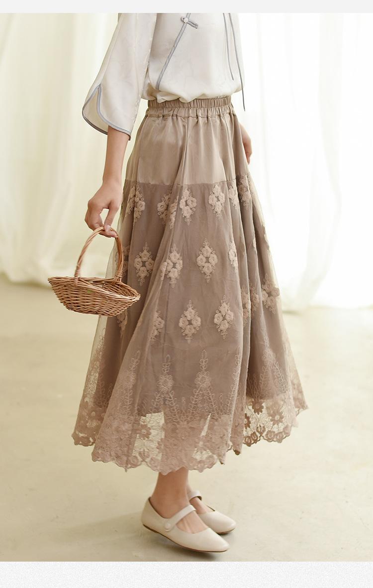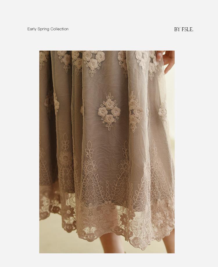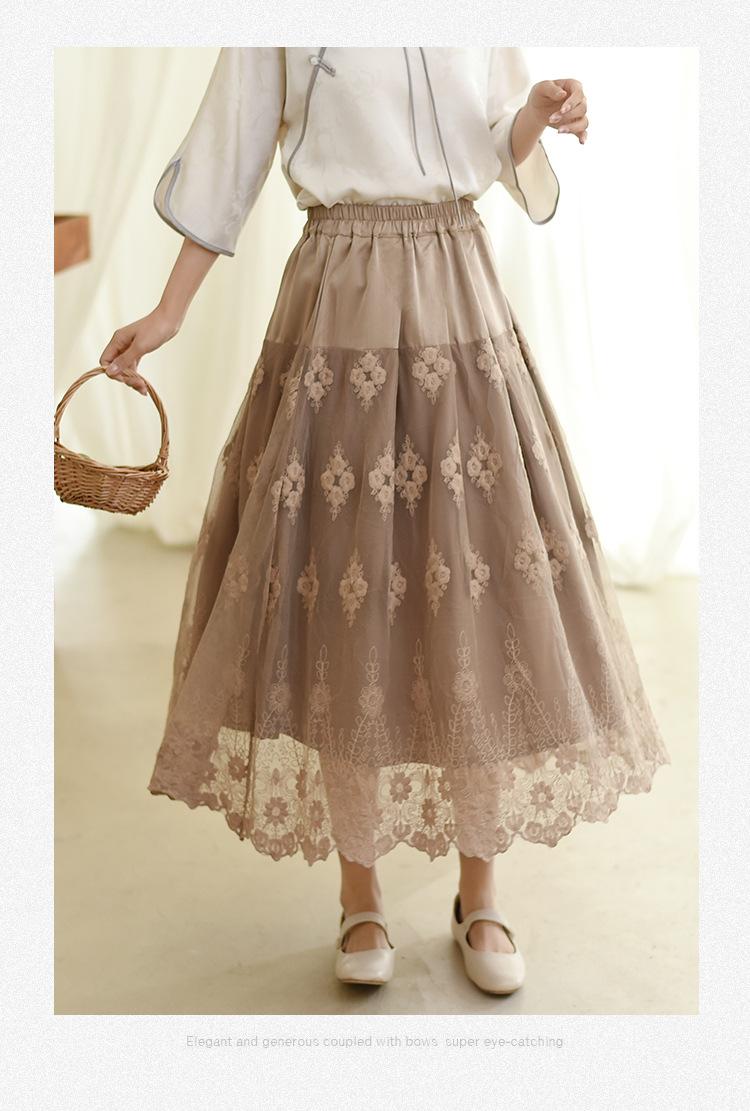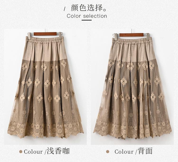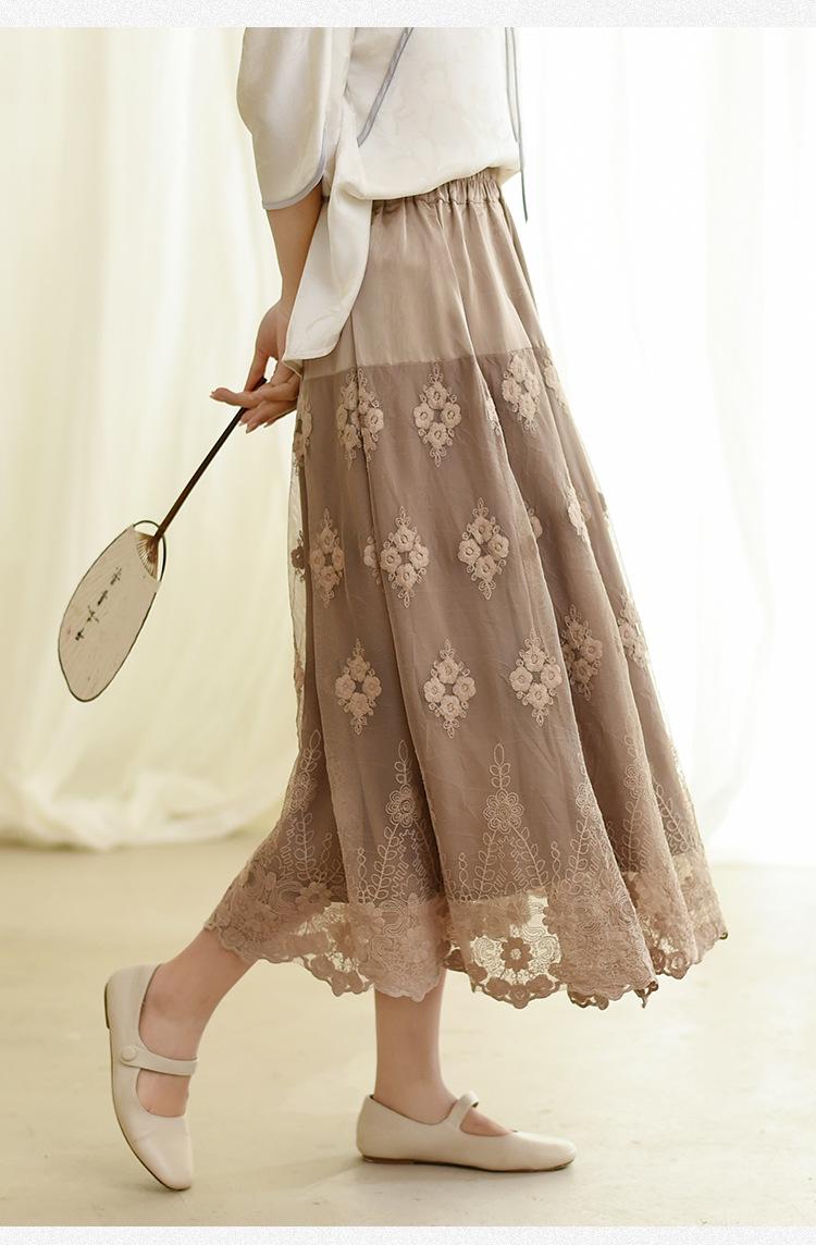 Falda nueva retro para mujer primavera y verano falda de línea A bordada de malla de alta gama falda ajustada de cintura alta venta al por mayor
