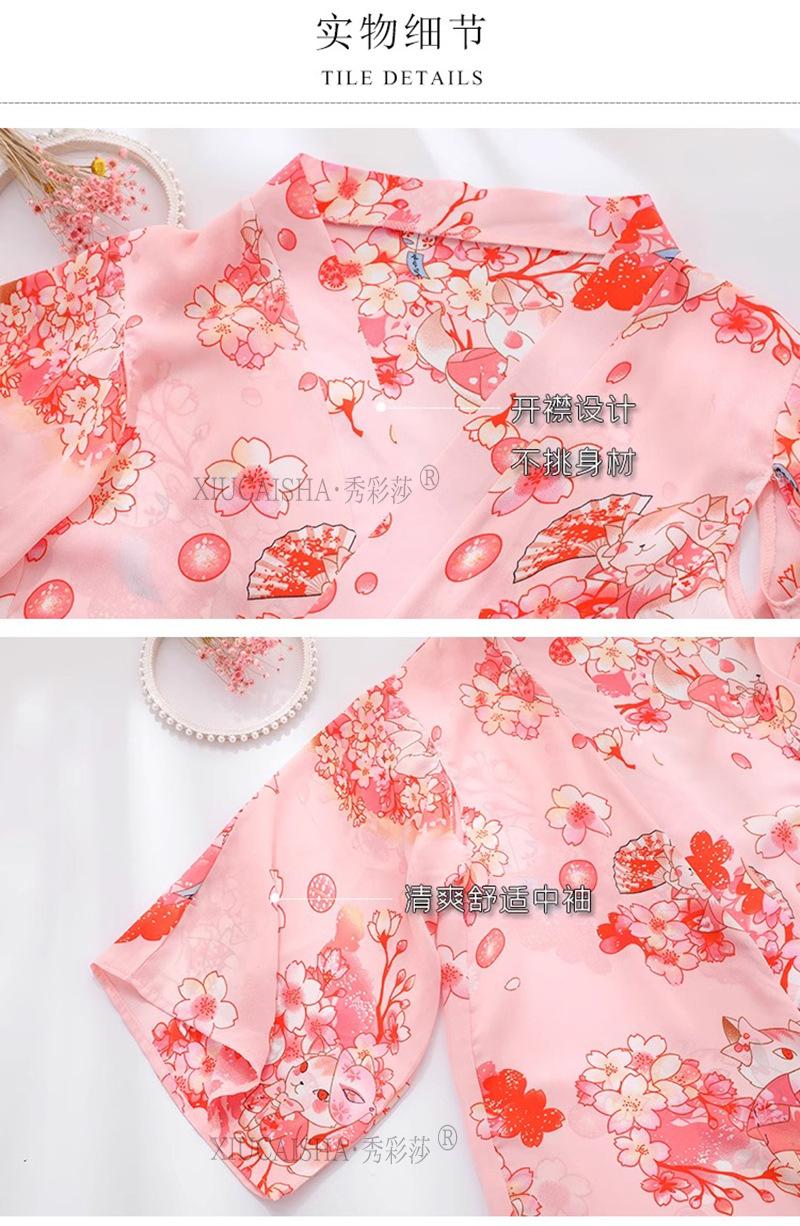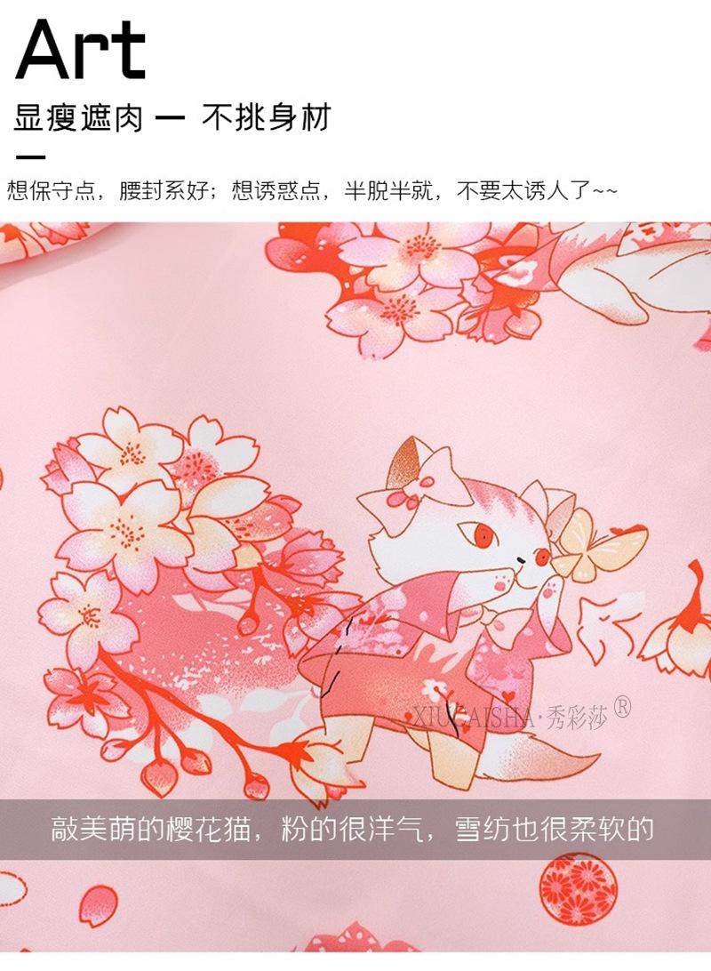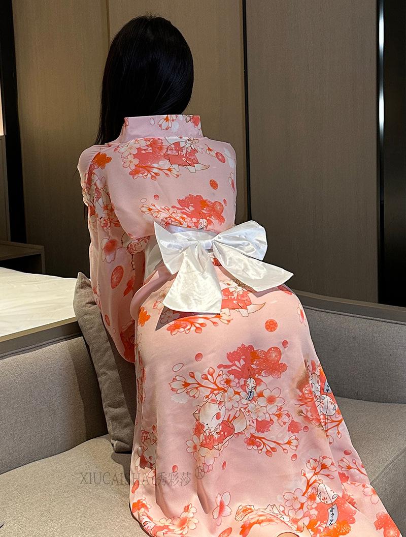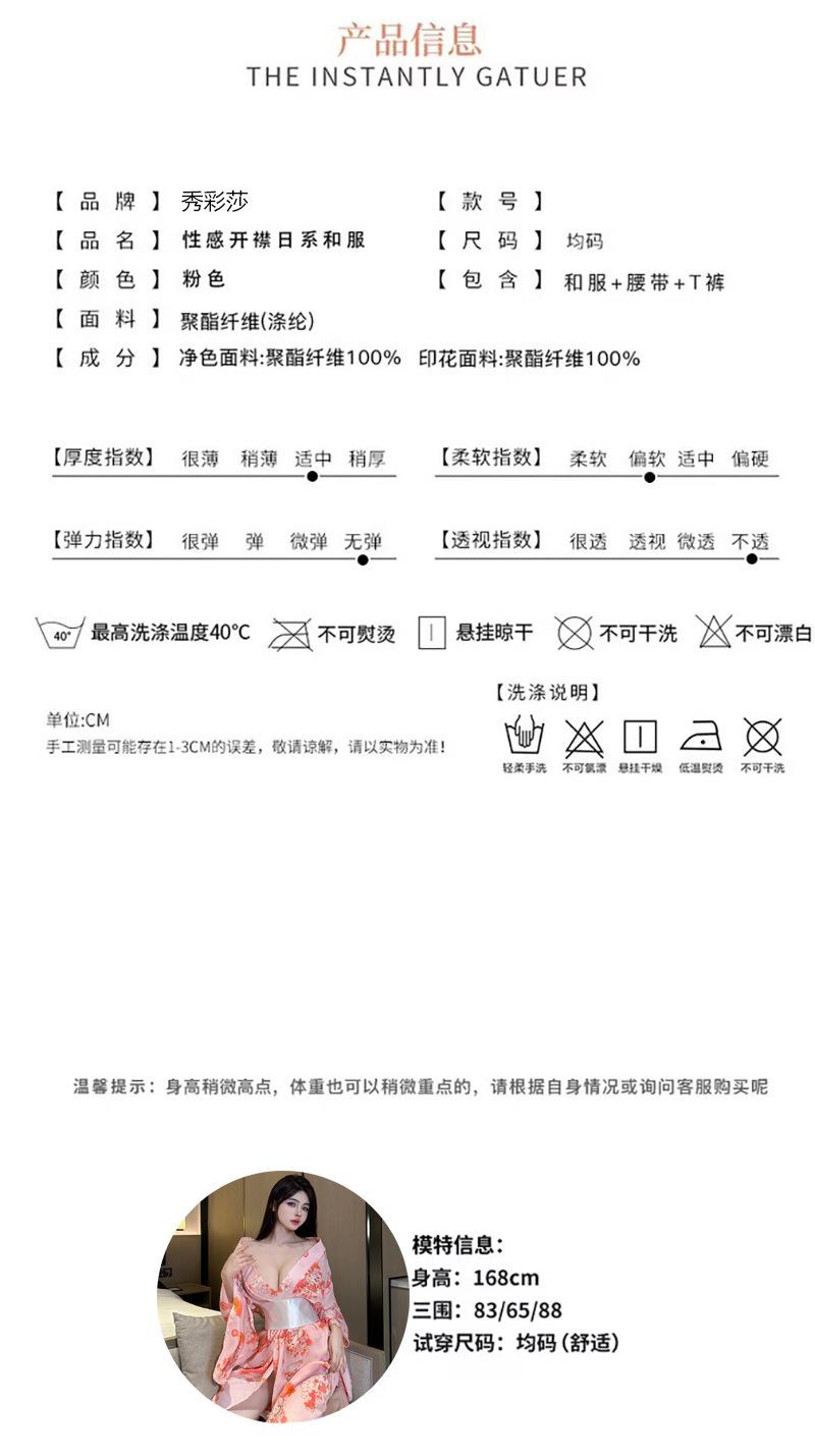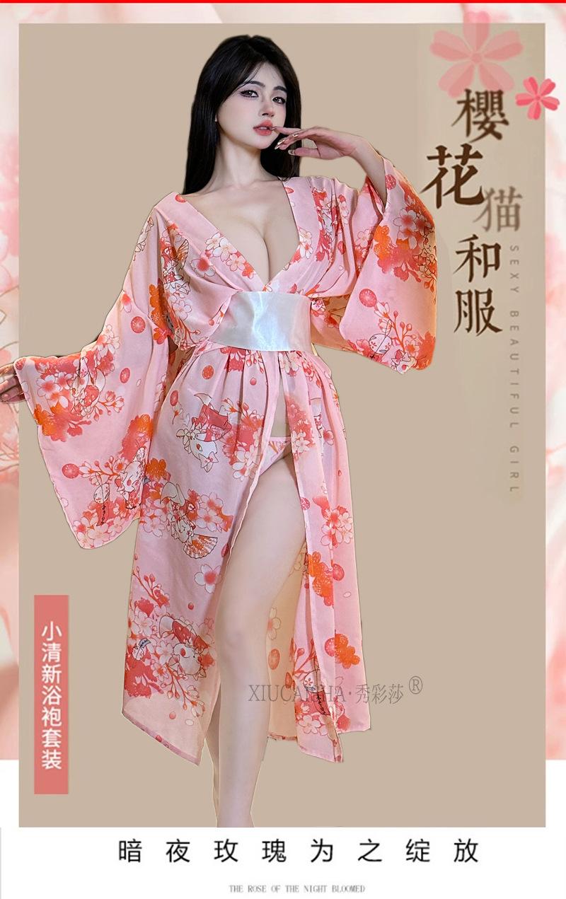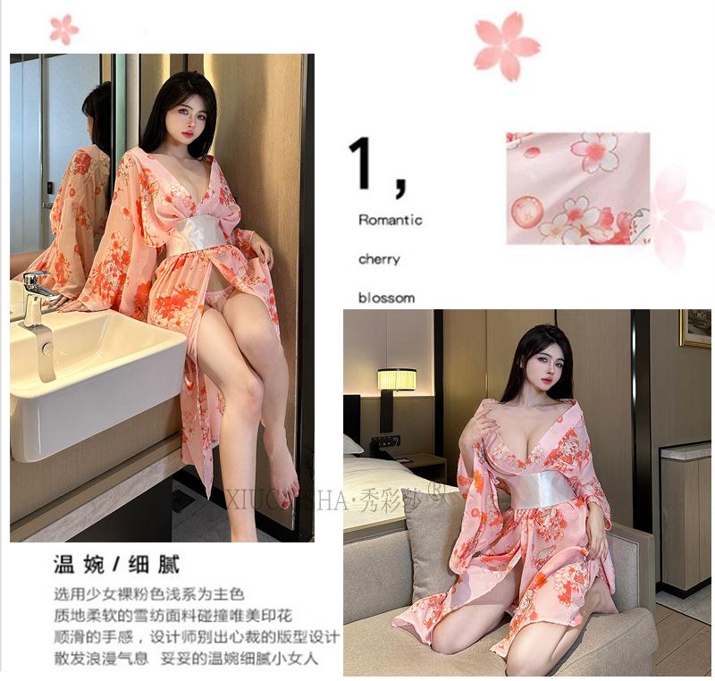 Ropa Interior Sexy Pijama Rosa Flor de Cerezo Camisón de Gasa Kimono Japonés Estampado Uniforme Tentación Hueco Bata Traje