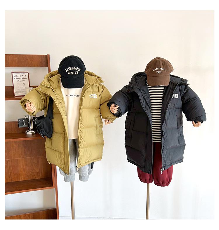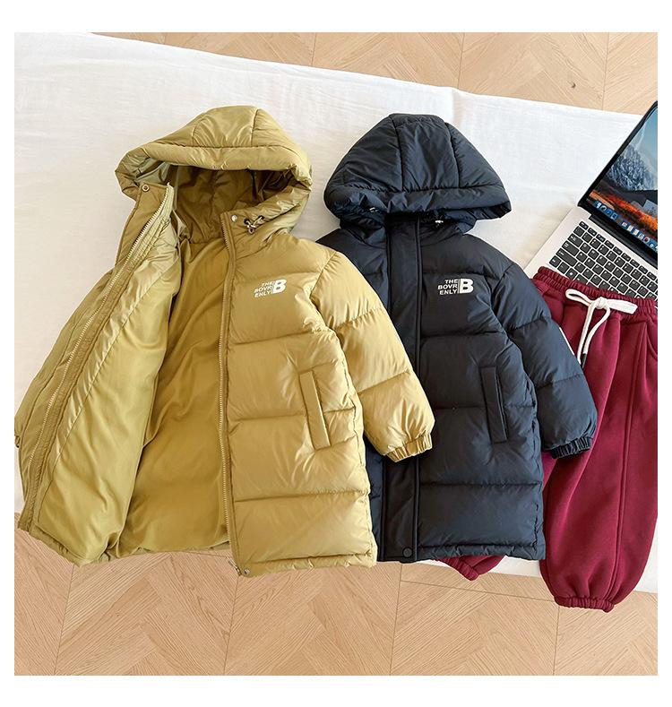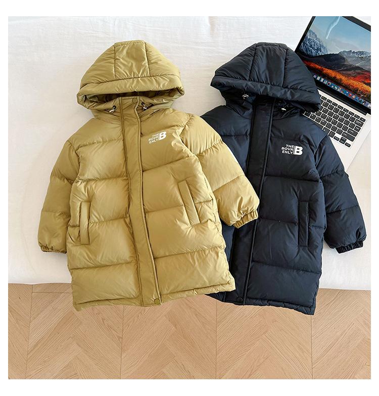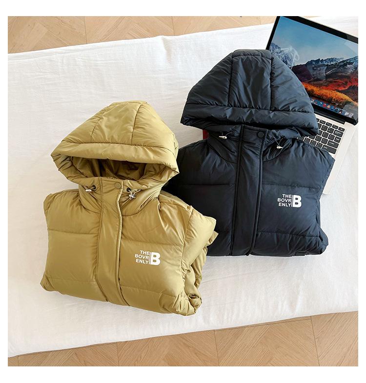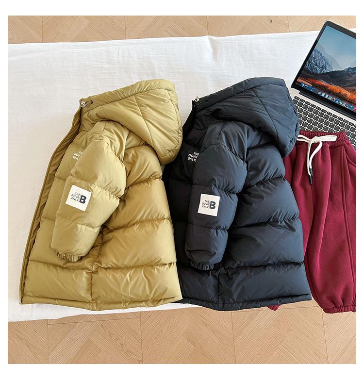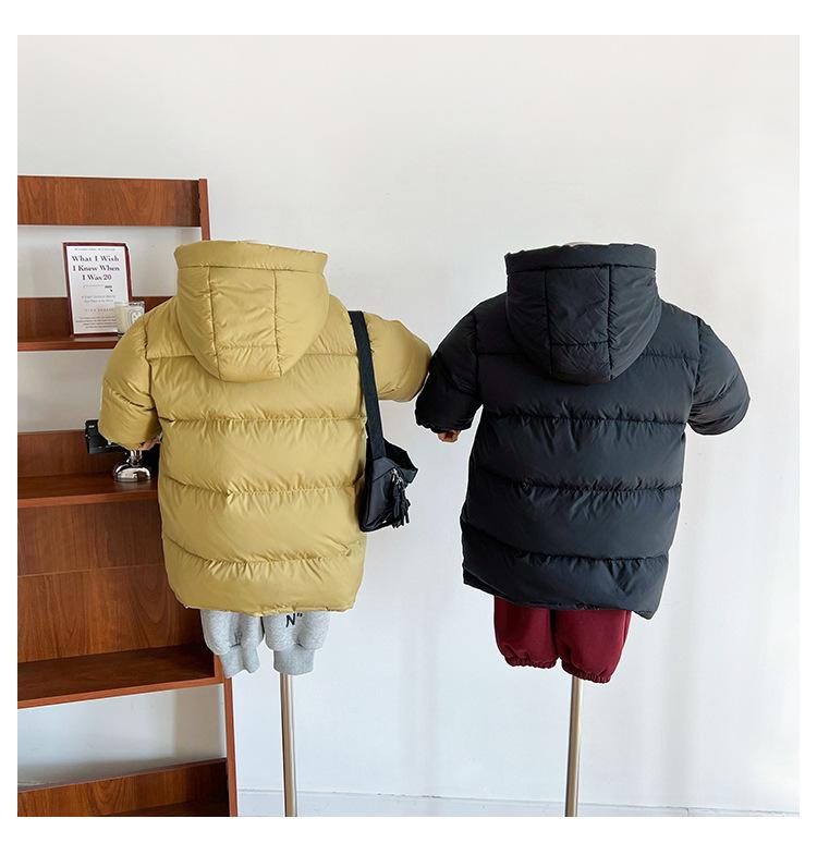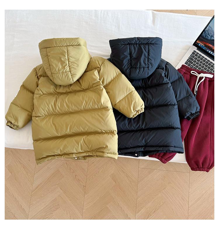 Fengzhigu 2023 Invierno nuevo ropa para niños estilo coreano chaqueta de plumón con capucha de longitud media para niños etiquetado combinable