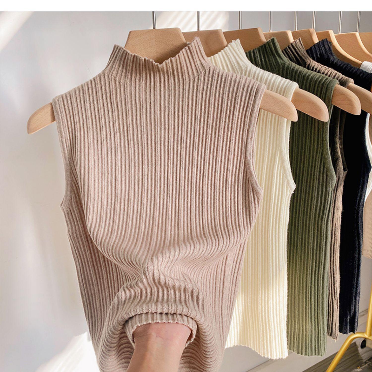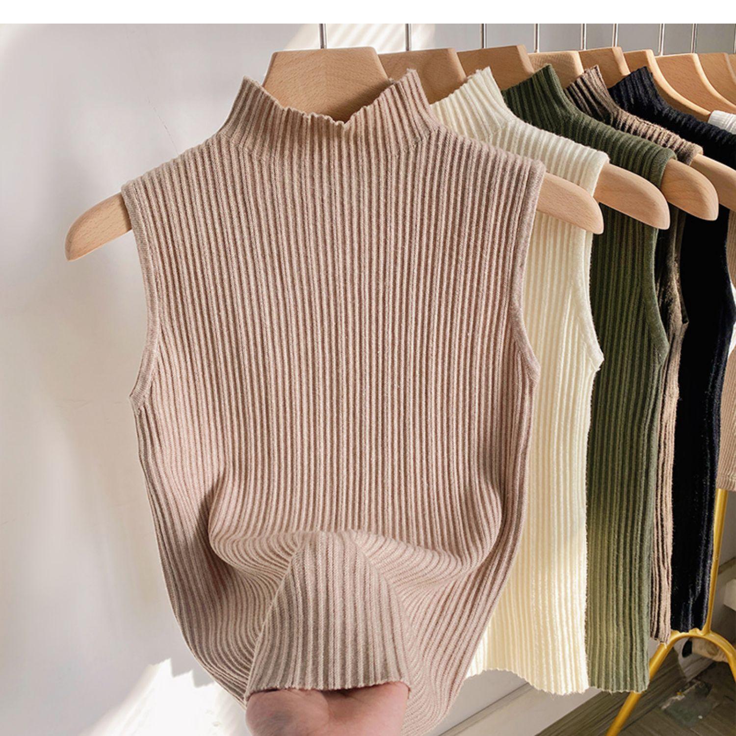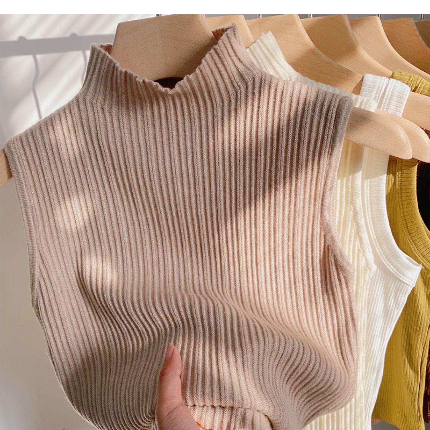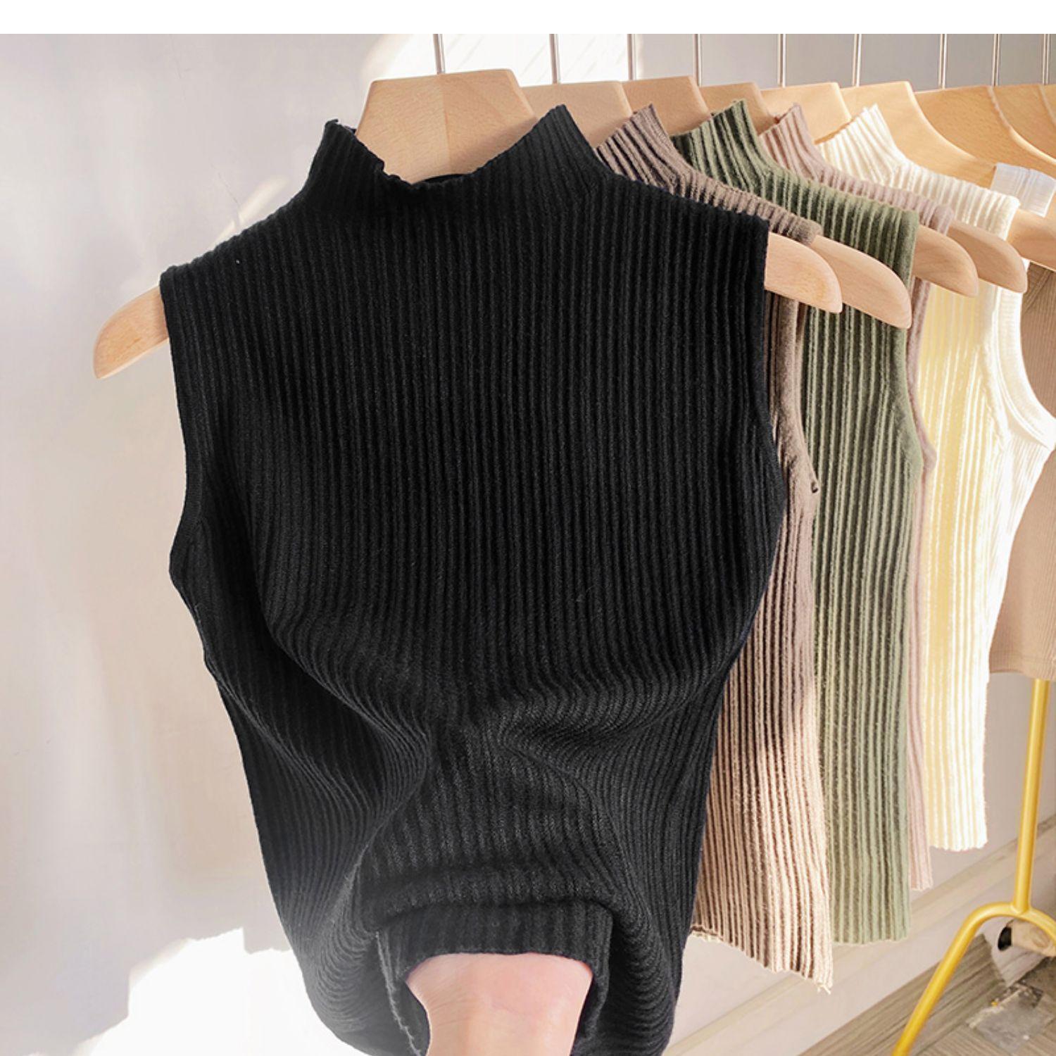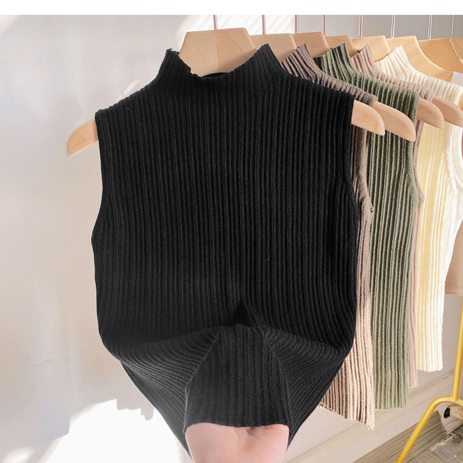 Chaleco Interior de Punto para Mujer para Primavera, Otoño e Invierno Nuevo Estilo Chaleco Corto de Medio Cuello Alto sin Mangas Ropa Exterior Camiseta Base Gruesa