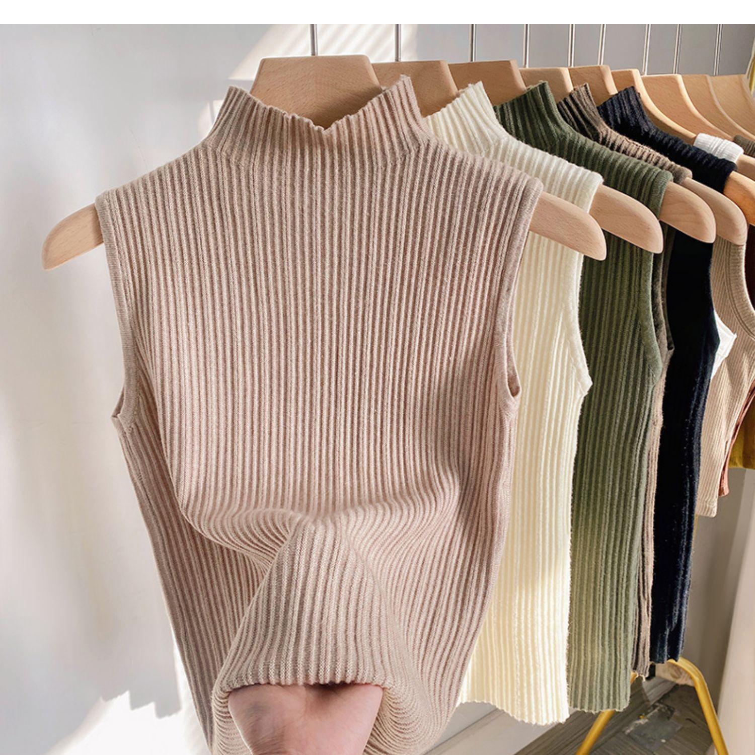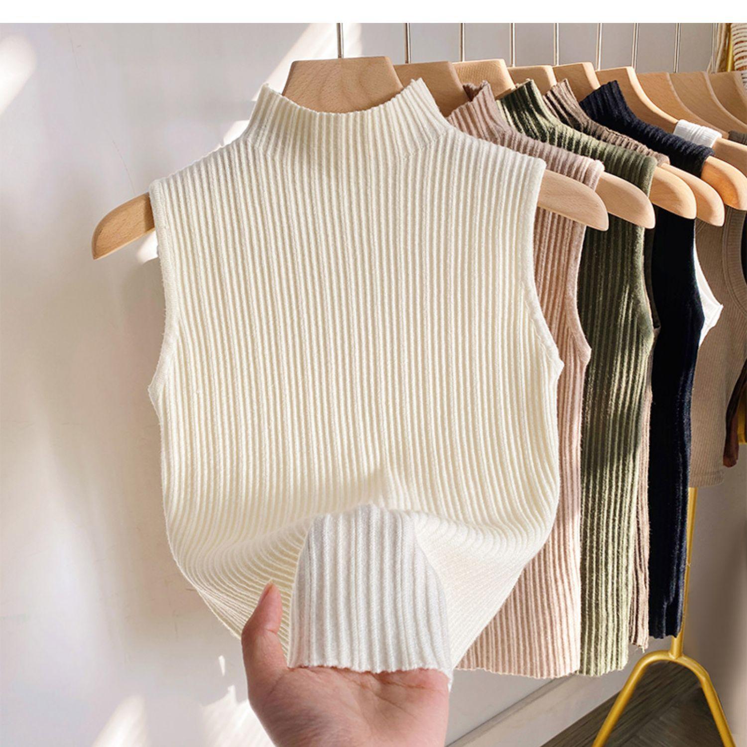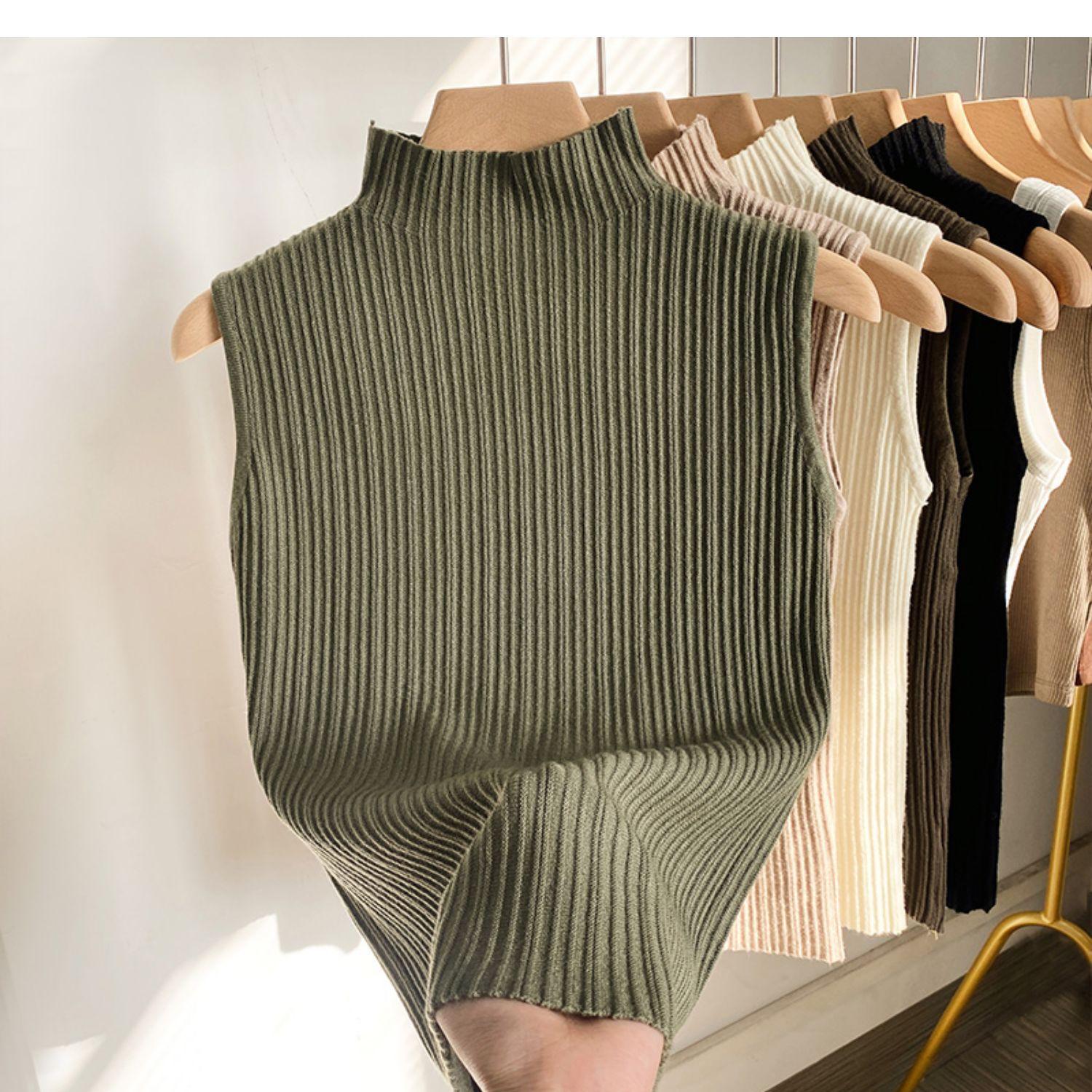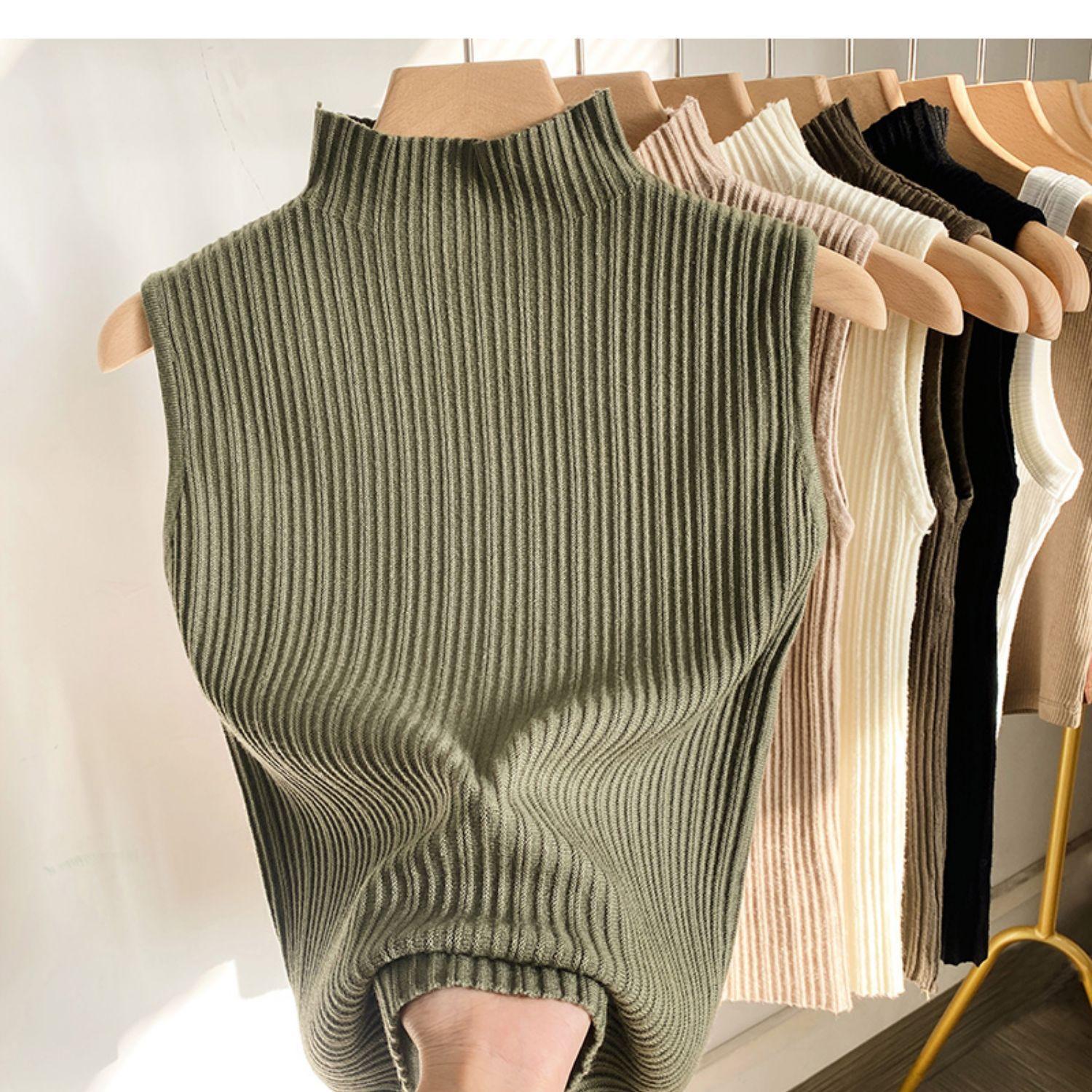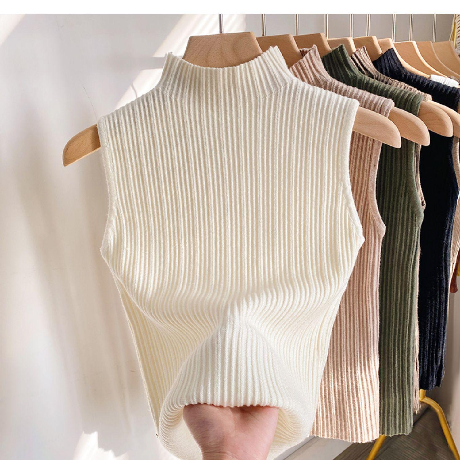 Chaleco Interior de Punto para Mujer para Primavera, Otoño e Invierno Nuevo Estilo Chaleco Corto de Medio Cuello Alto sin Mangas Ropa Exterior Camiseta Base Gruesa
