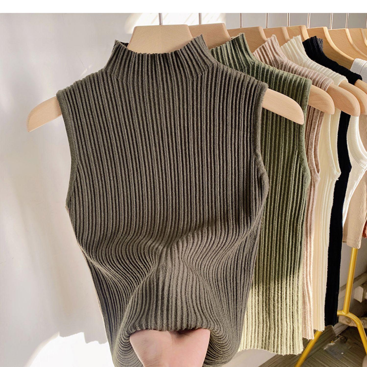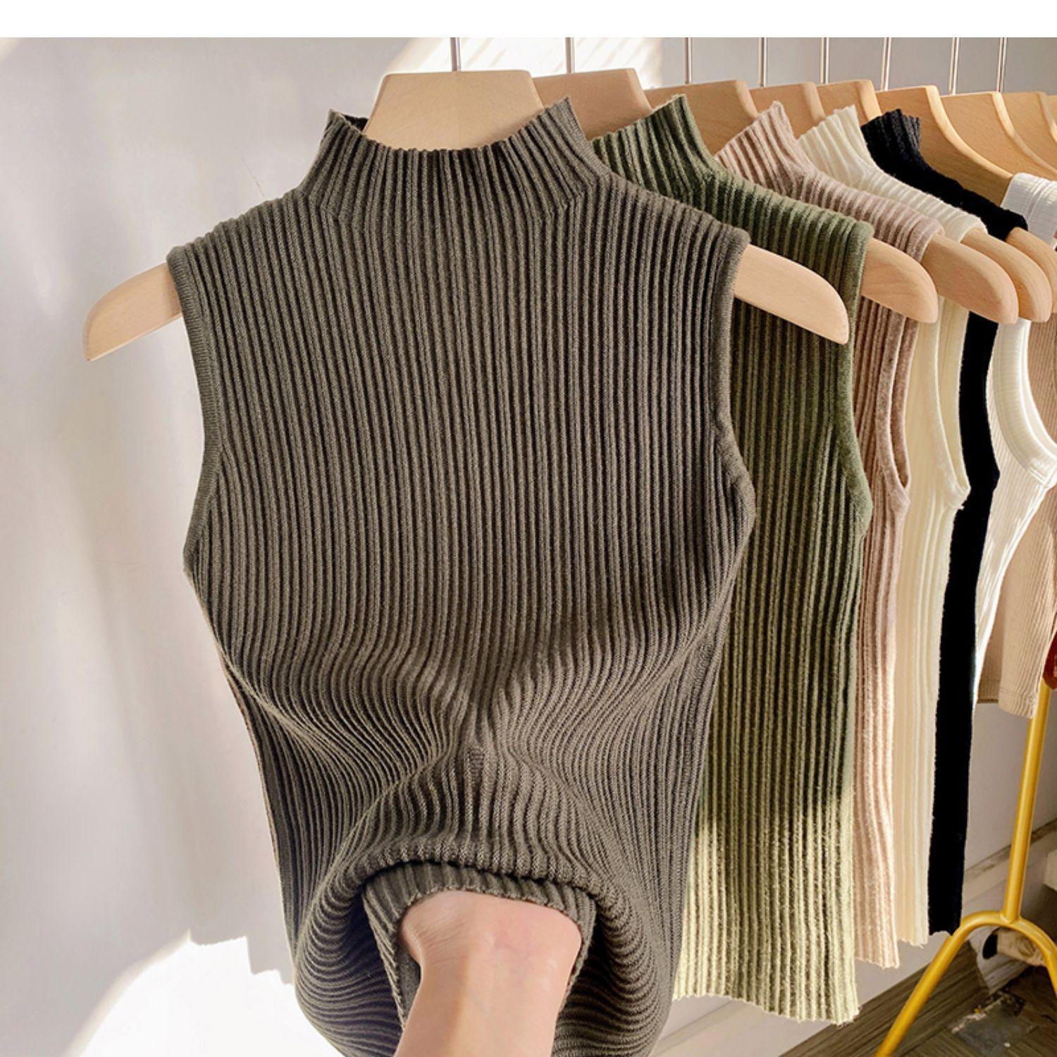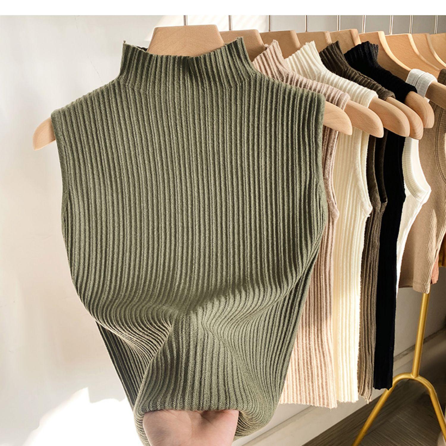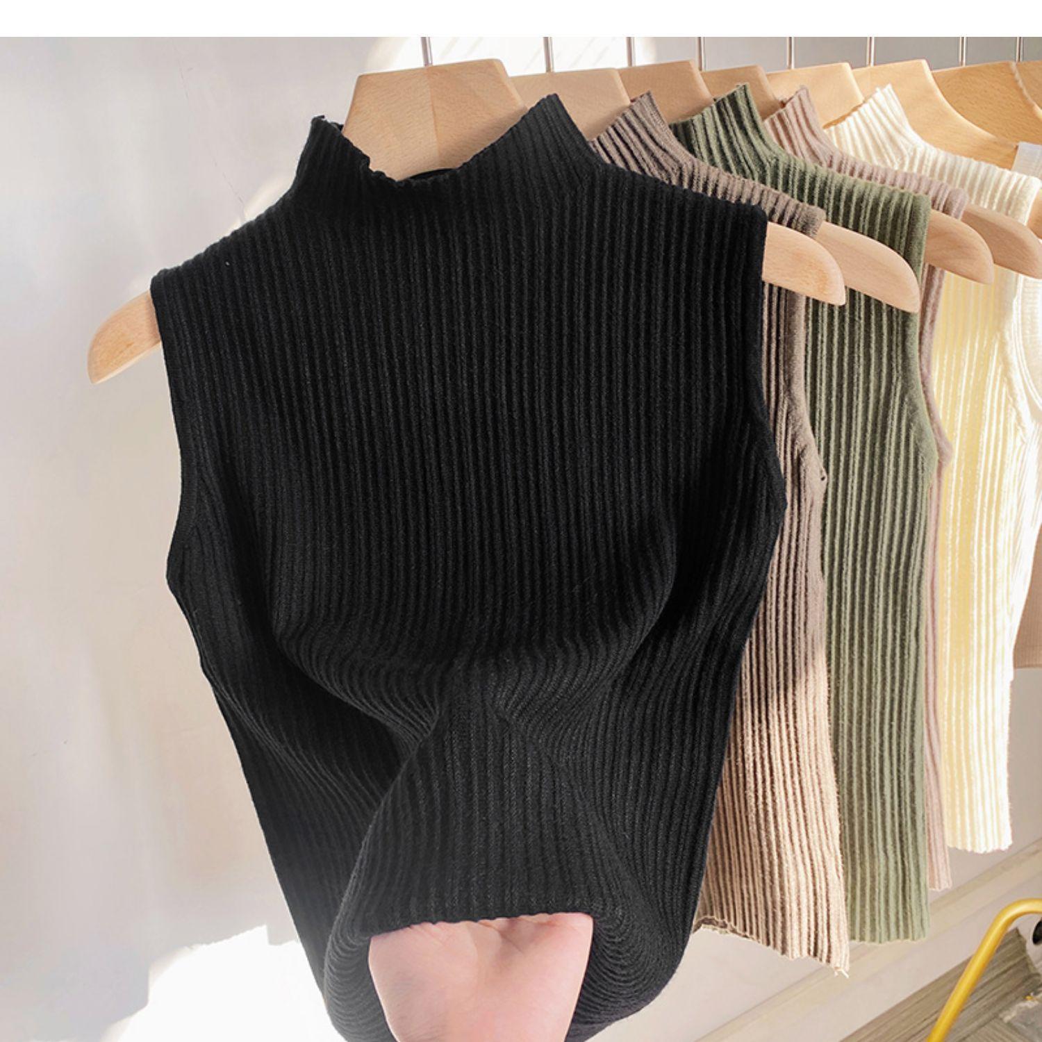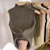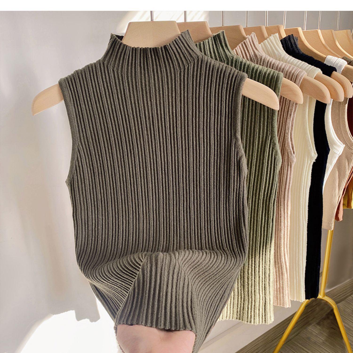 Chaleco Interior de Punto para Mujer para Primavera, Otoño e Invierno Nuevo Estilo Chaleco Corto de Medio Cuello Alto sin Mangas Ropa Exterior Camiseta Base Gruesa