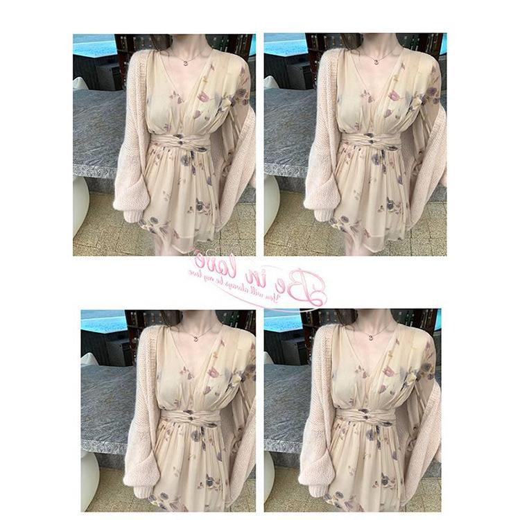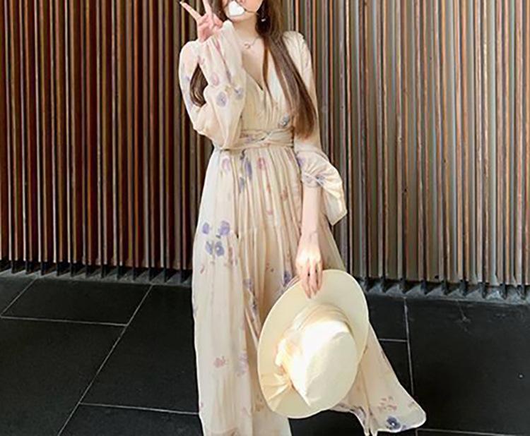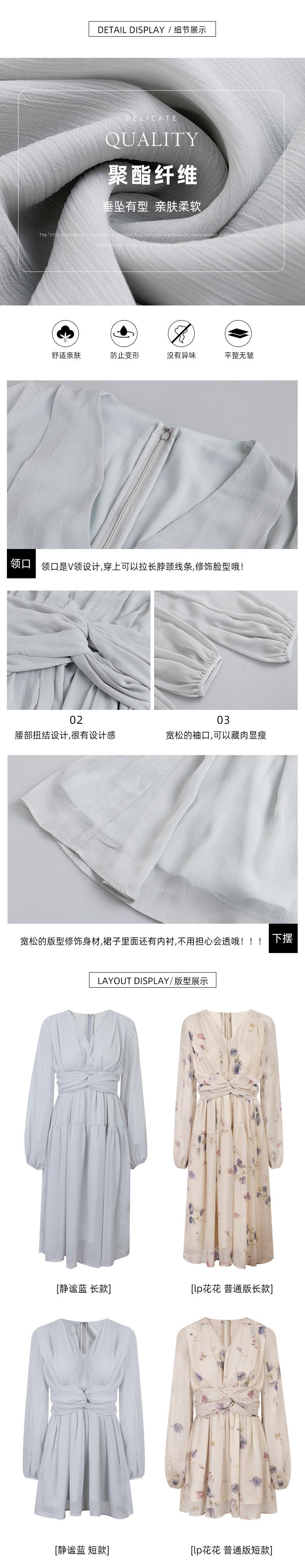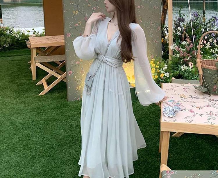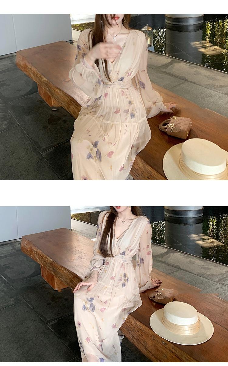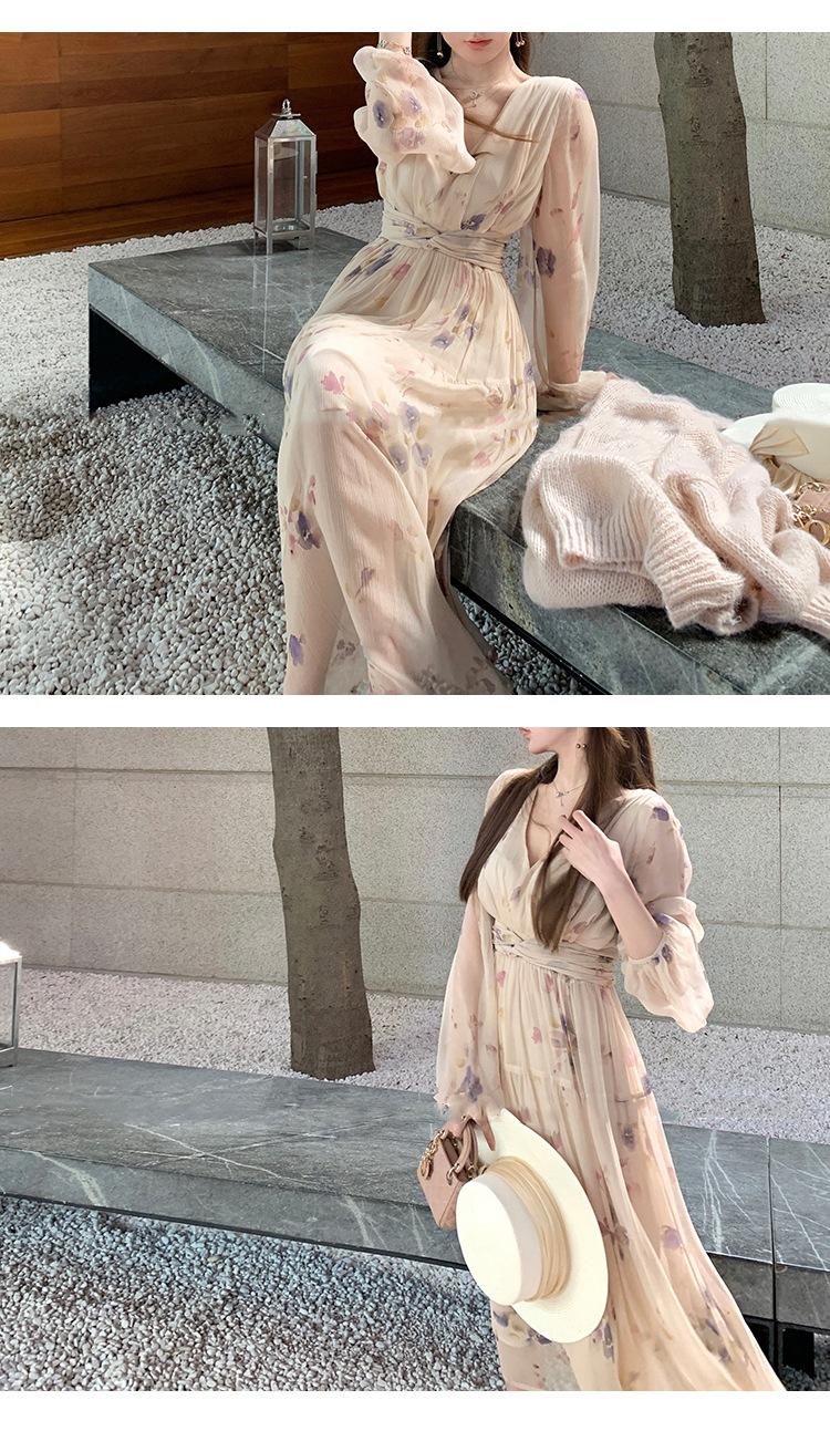 Vestido Estético de Primavera de 25 Años Chifón Falda Larga Francesa Seda de Morera Ajustado Delgado Cuello en V