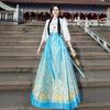 La parte inferior del cuerpo se combina con una falda larga en capas de diseño