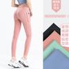Pantalones deportivos ajustados personalizados de licra, pantalones de yoga desnudos para mujer, cintura alta, bolsillo en la cadera, pantalones de fitness color melocotón, alta elasticidad