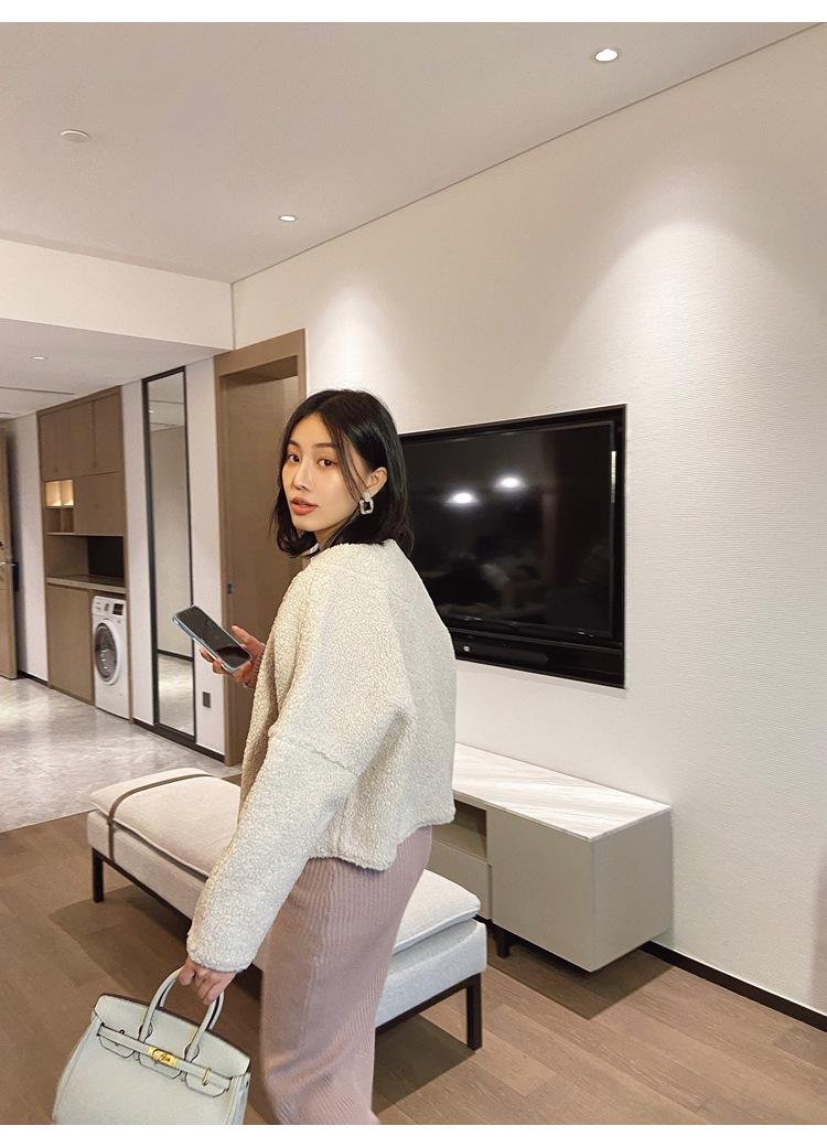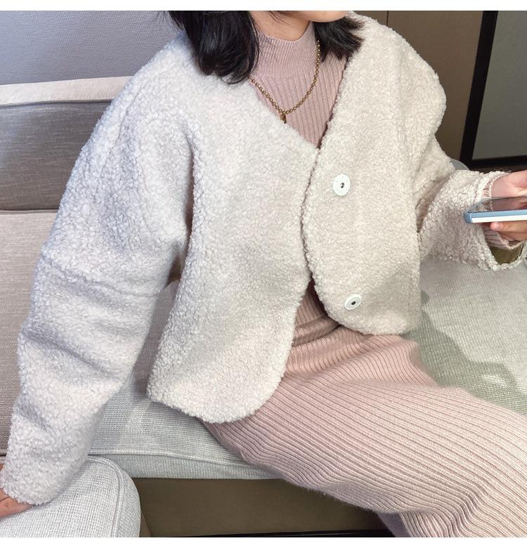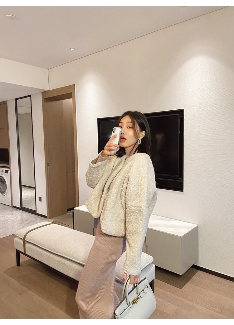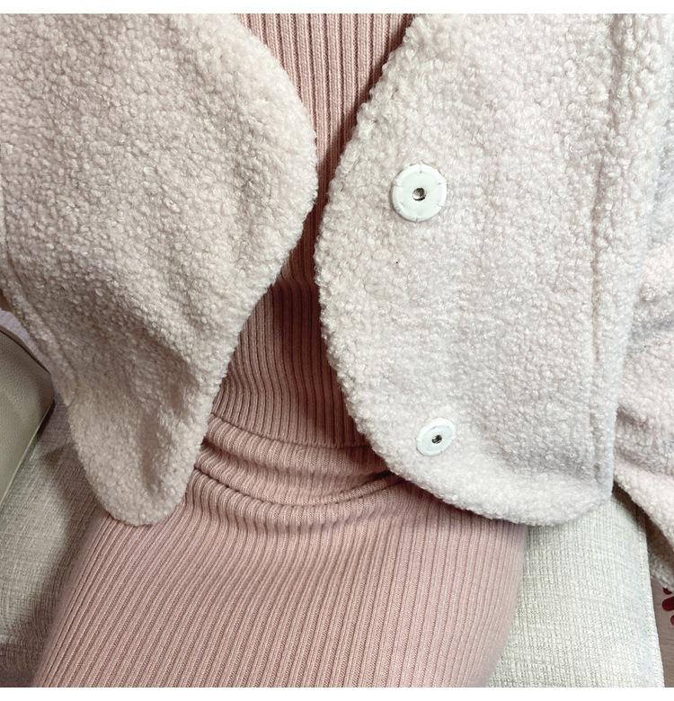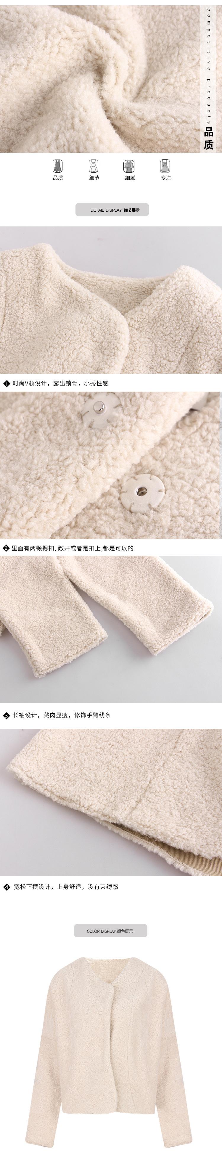 El estilo es bastante interesante. La silueta es ancha en la parte superior y estrecha en la parte inferior. Cuando está abotonado, parece un pequeño cuello redondo.