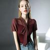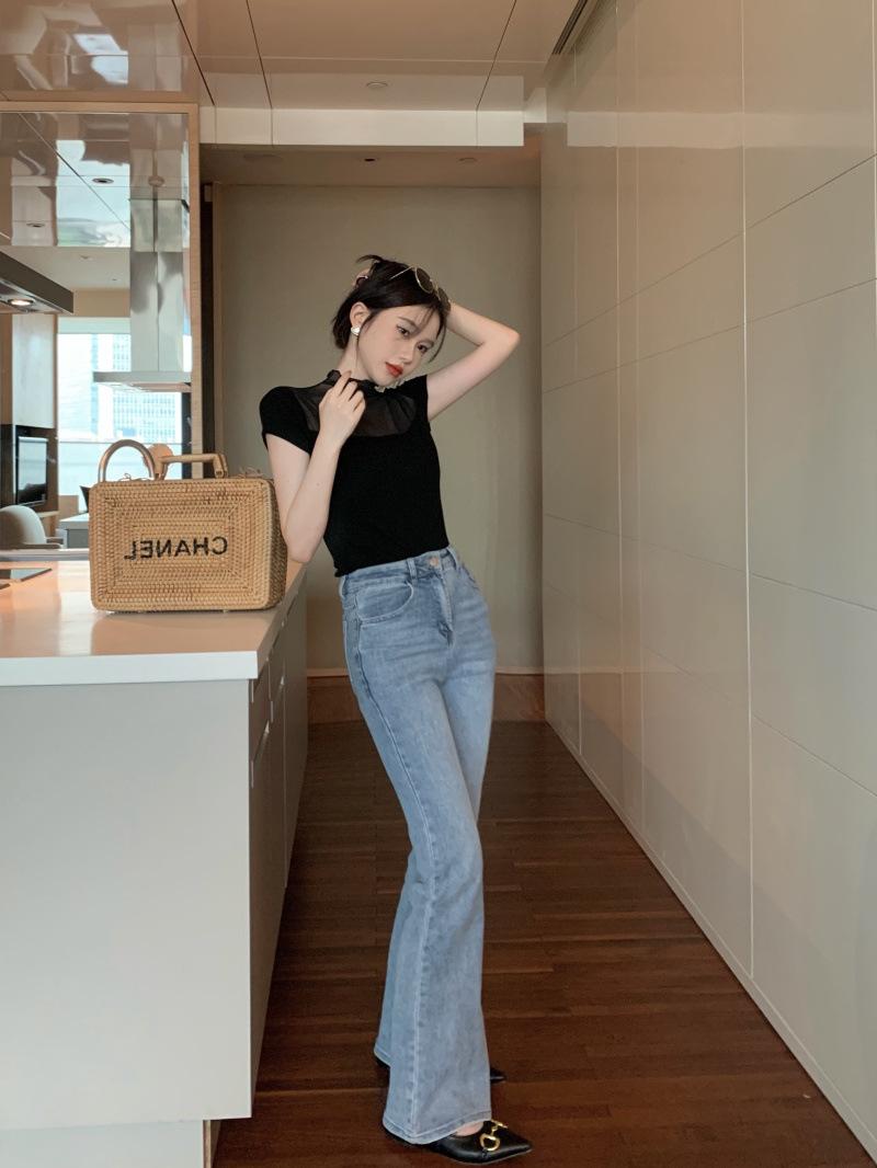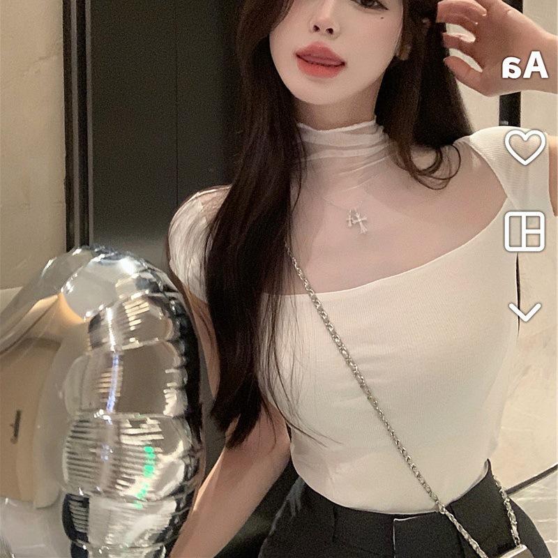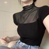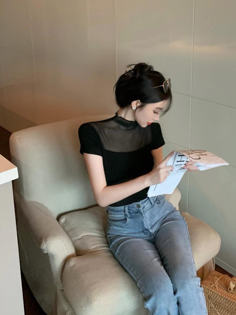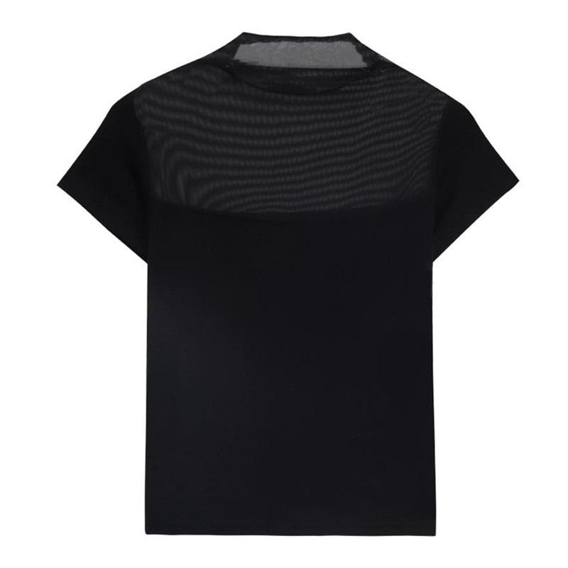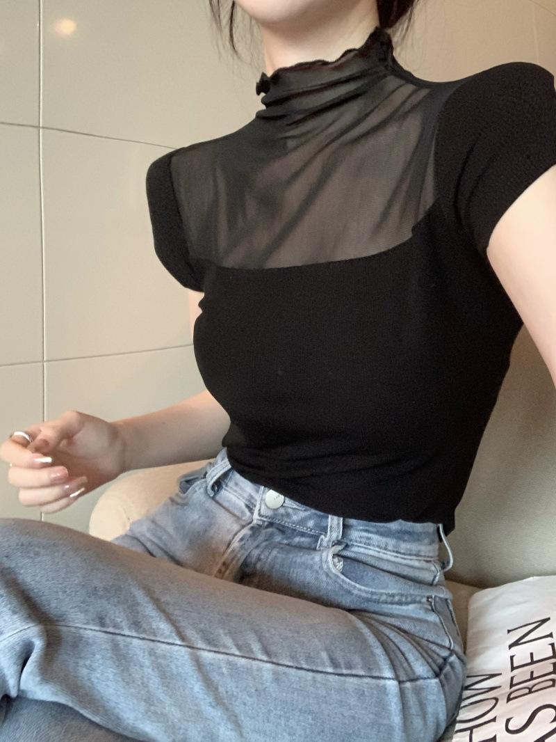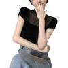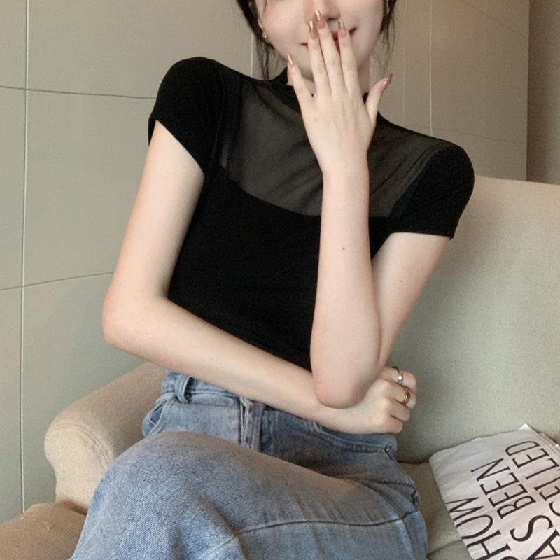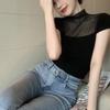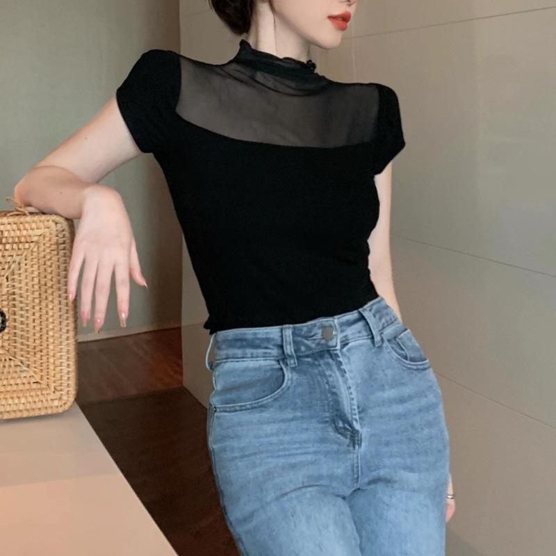 Camiseta de malla negra con microtransparente costuras de encaje, diseño Sense Summer, nueva y atractiva camiseta de manga corta ajustada para mujer.