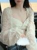 [Verano] Camisa Estampada con Bordado Pesado y Encaje Empalmado de Manga Larga Diseño Francés Delicado Mangas Largas