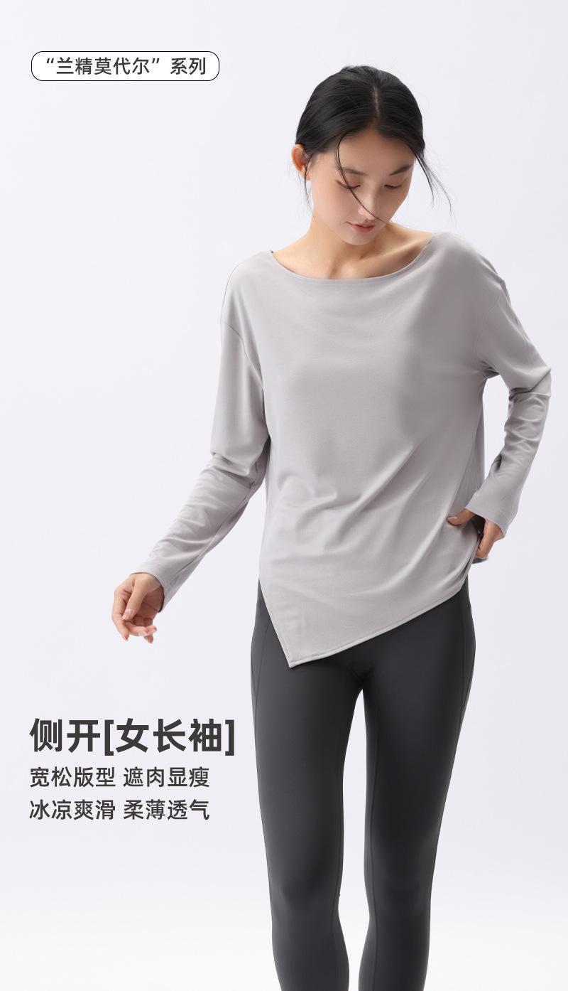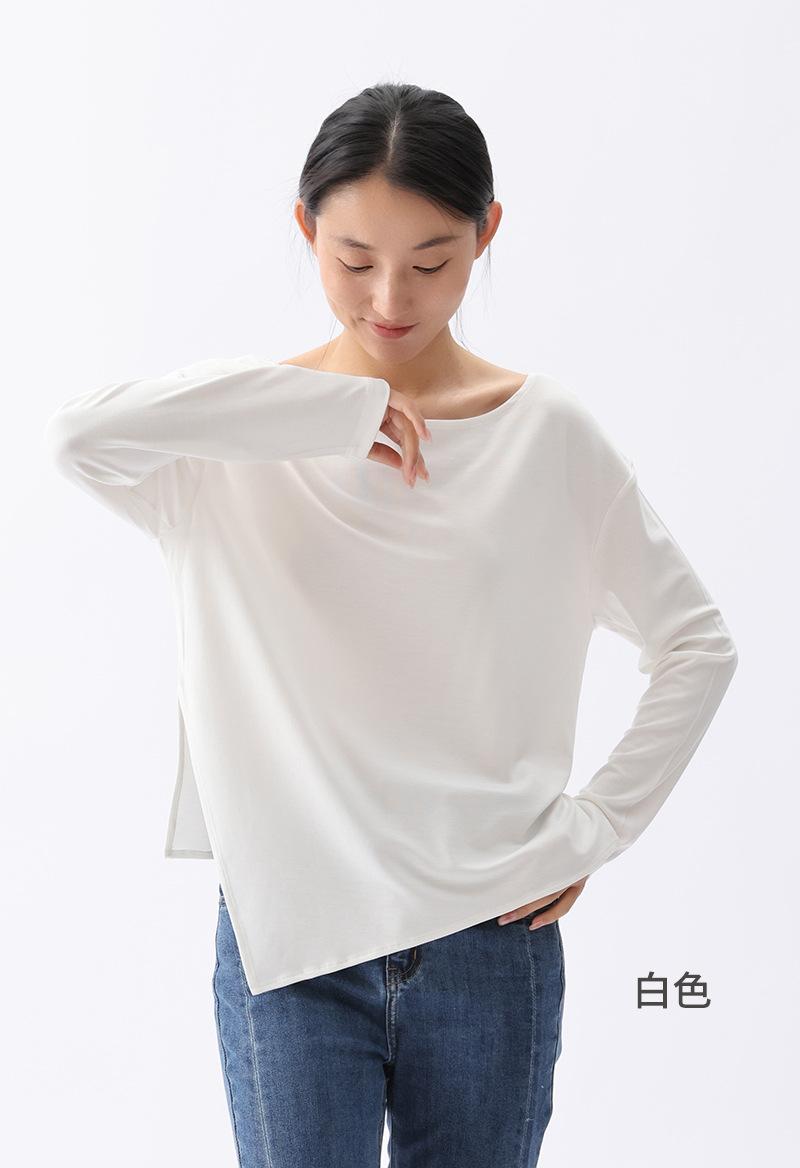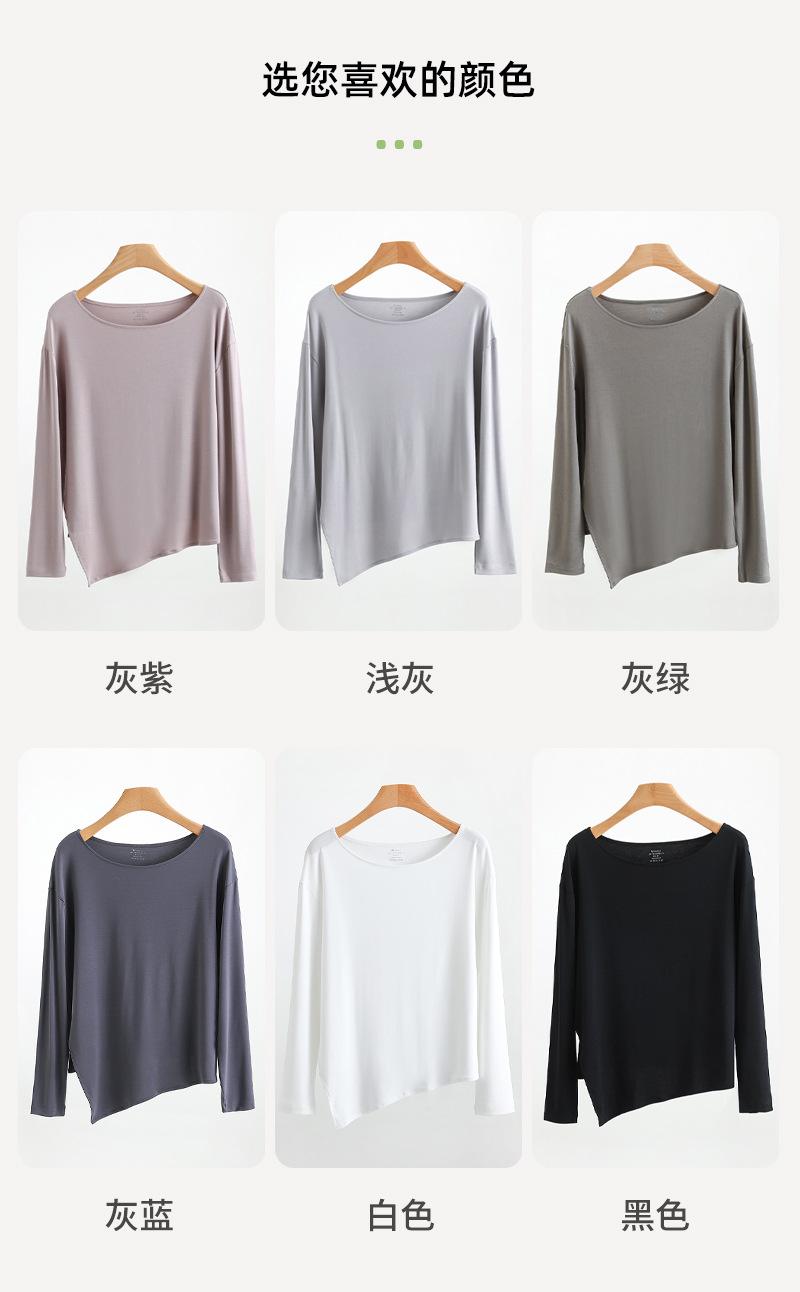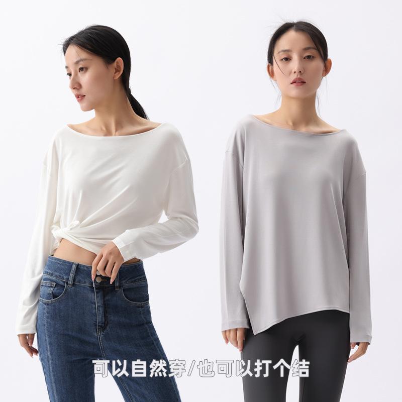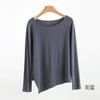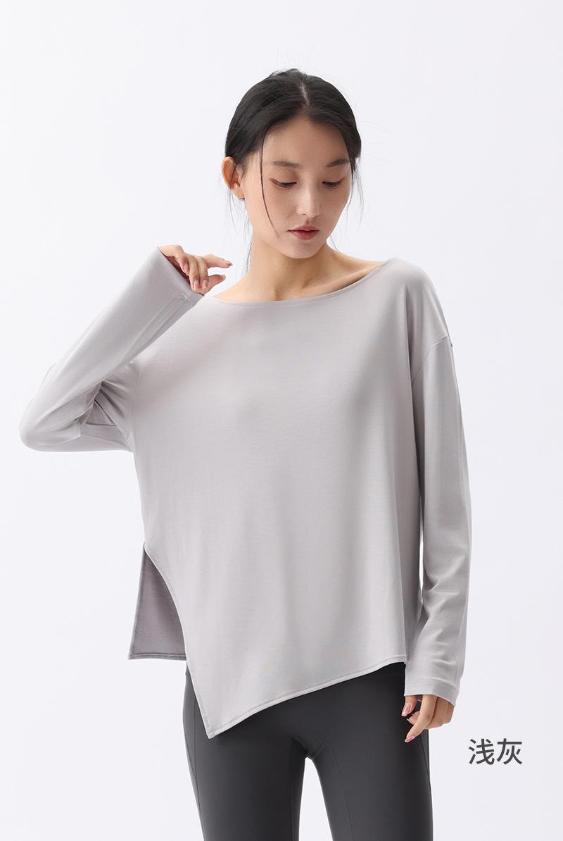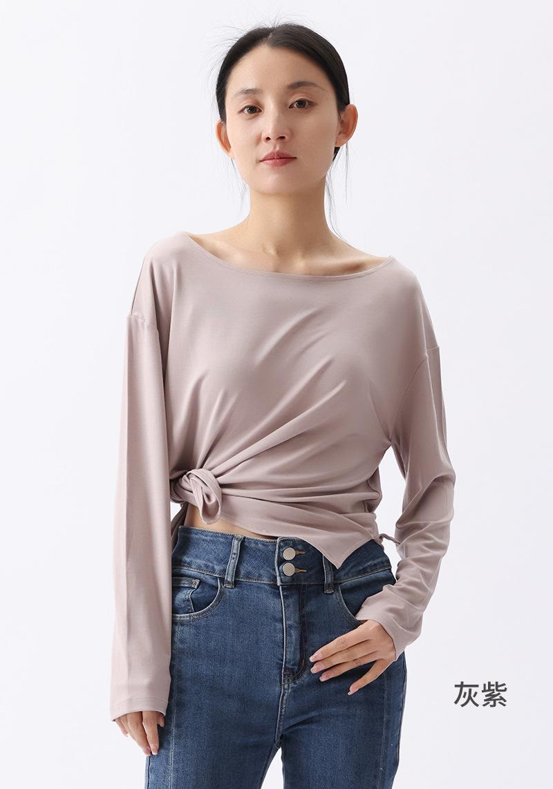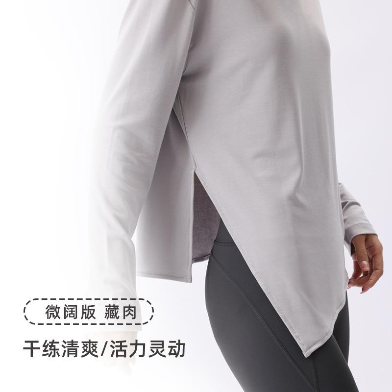 Esta es una camiseta casual de manga larga para mujer multi-escena con un diseño de abertura irregular en el dobladillo. Se ve intelectual y casual cuando se usa en momentos ordinarios, y se puede anudar al hacer ejercicio para hacerlo más deportivo.