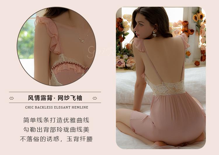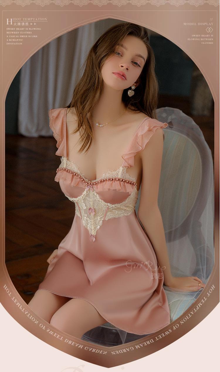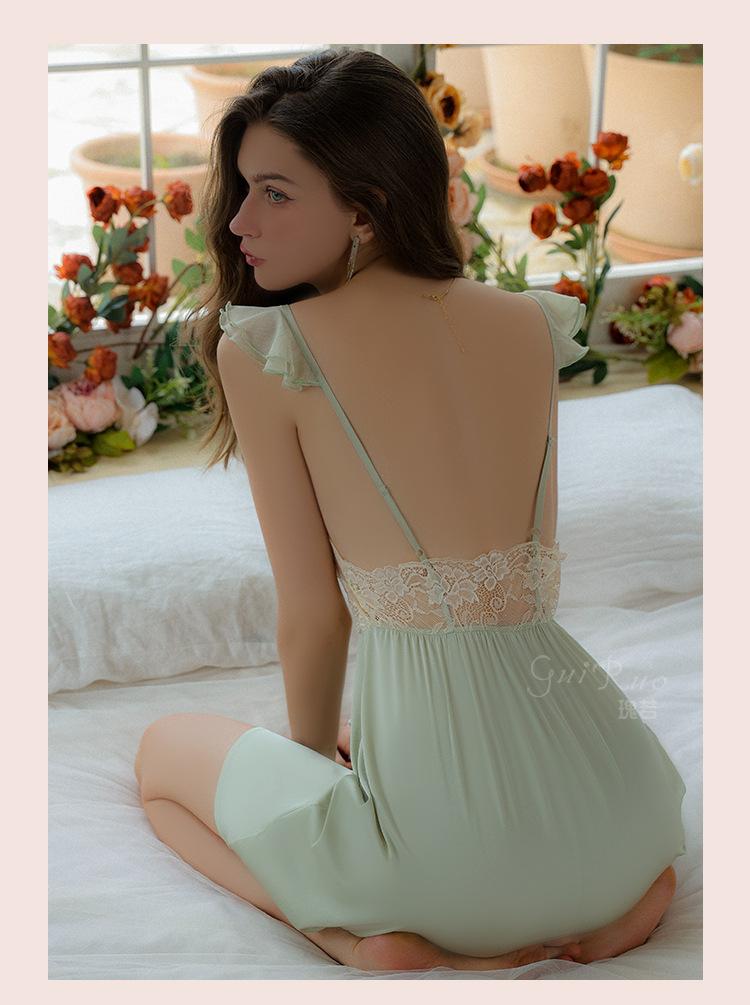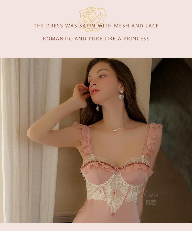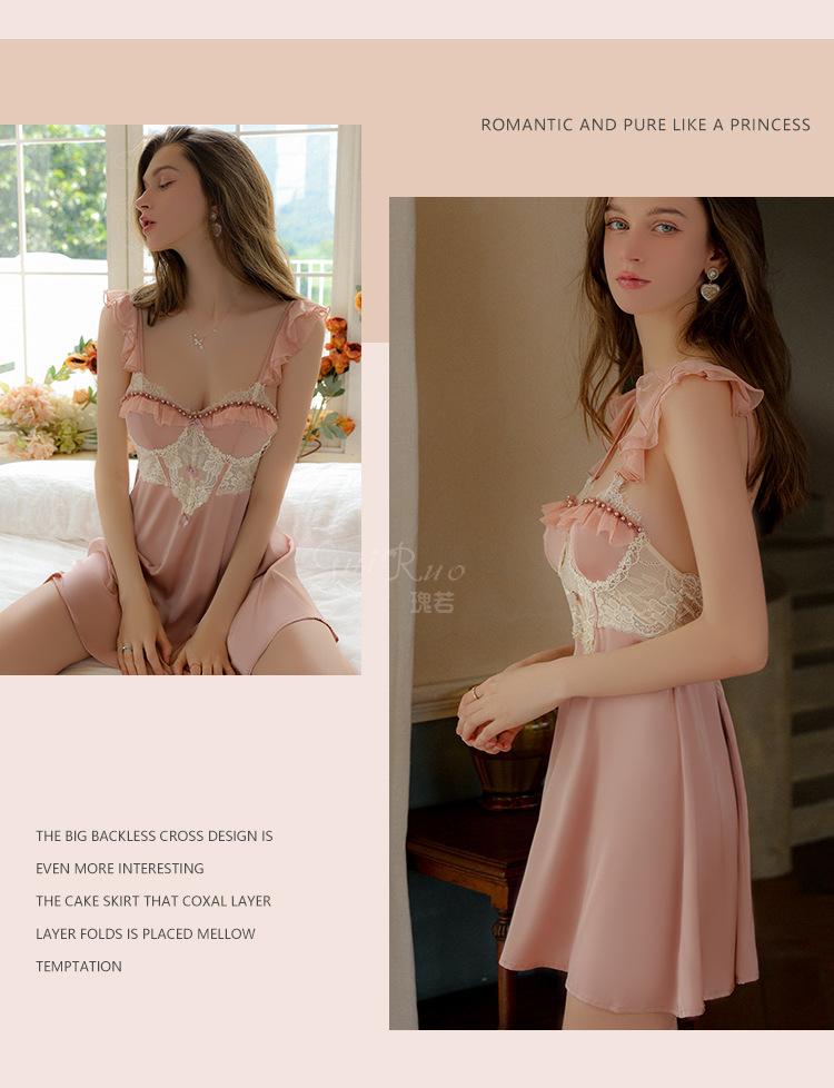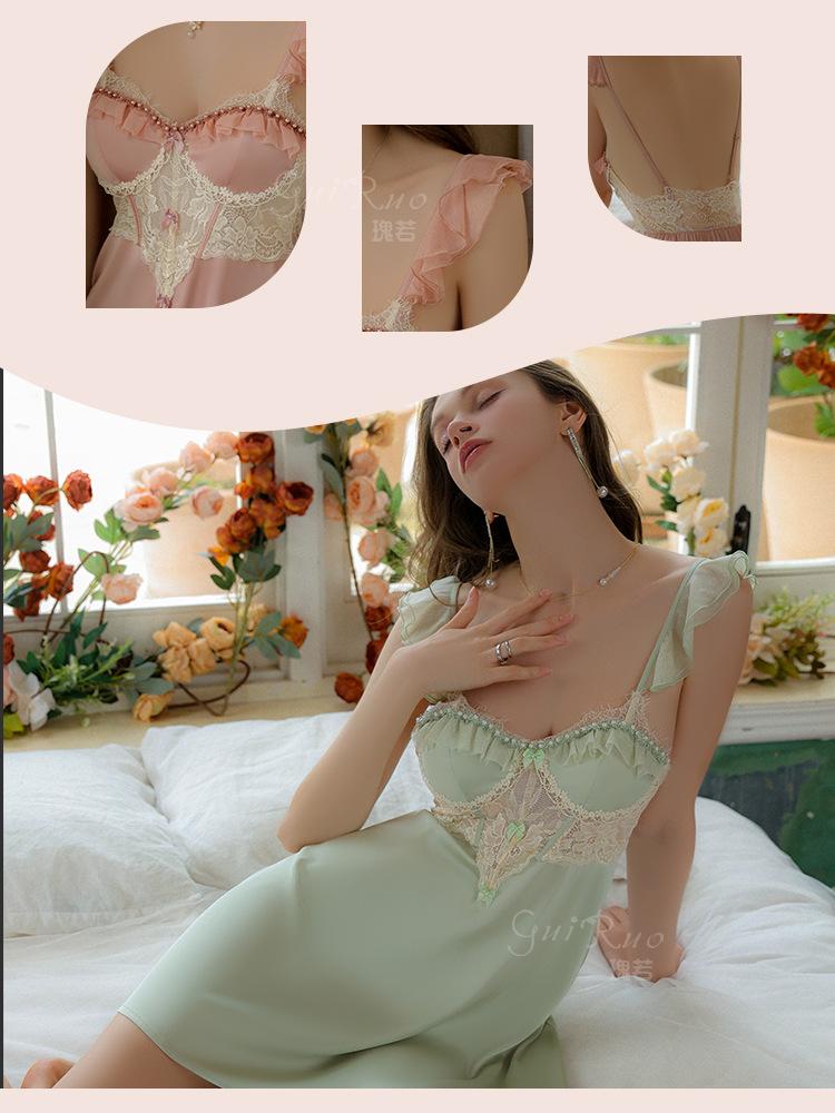 Ruoruo pijama sexy con almohadilla en el pecho manga volada de malla transparente espalda descubierta perla hielo seda tirantes camisón ropa de casa 3978