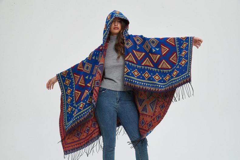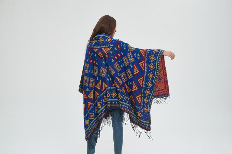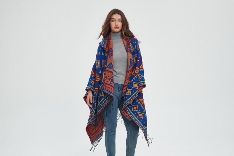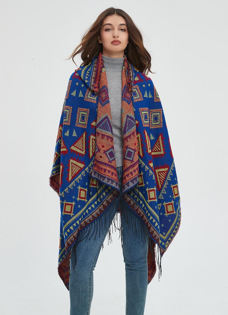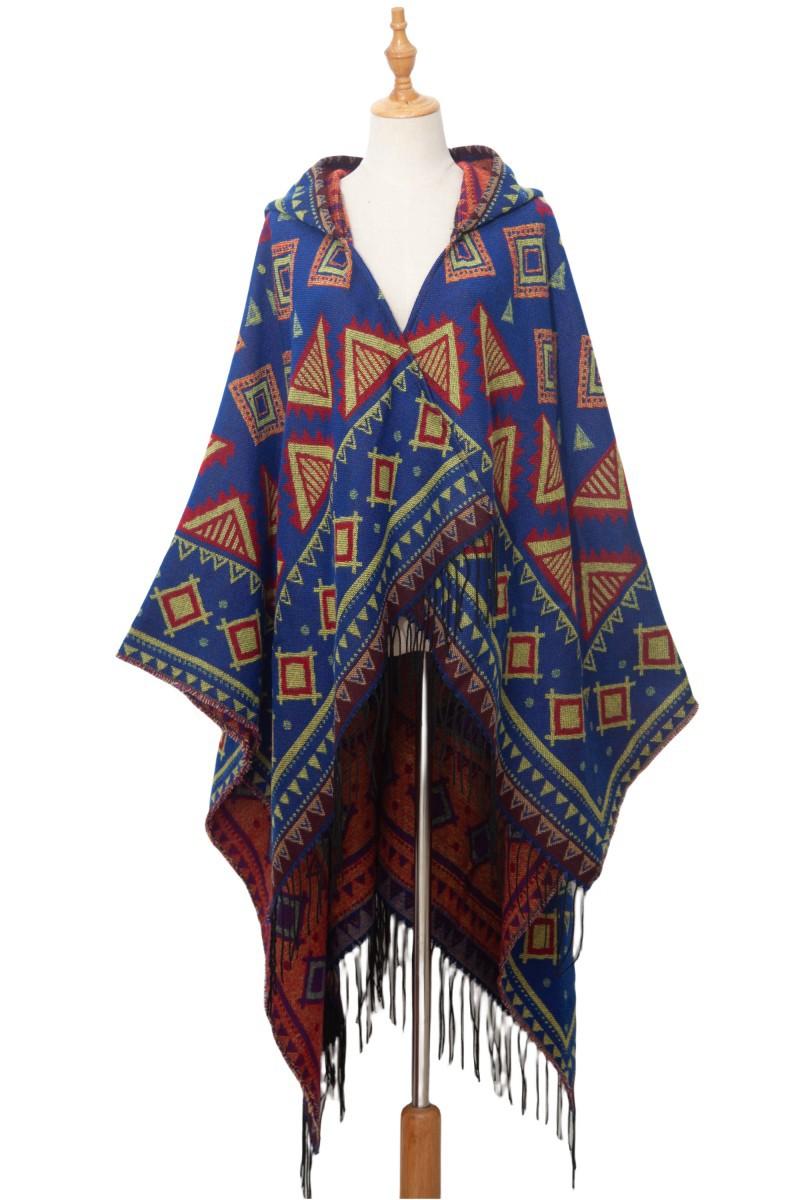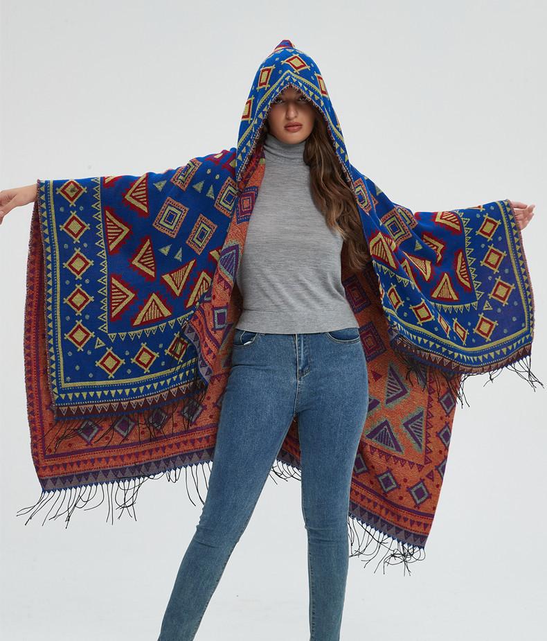 Capa con capucha y chal de cachemira sintética negra y azul con diseño de pavo real jacquard de primavera y otoño invierno de Europa y América de comercio exterior de Amazon 2023
