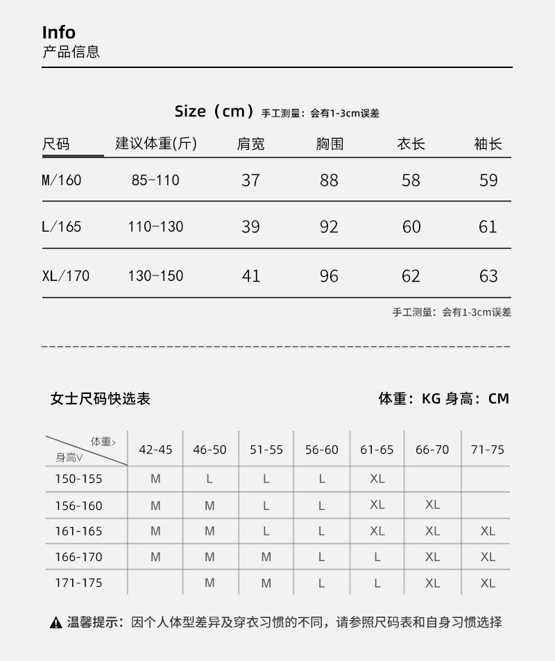 M/recommended weight 42.50 kg-55.00 kg, L/recommended weight 55.00 kg-65.00 kg, XL/recommended weight 65.00 kg-75.00 kg