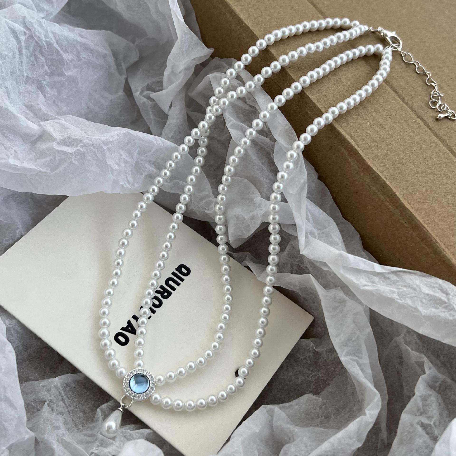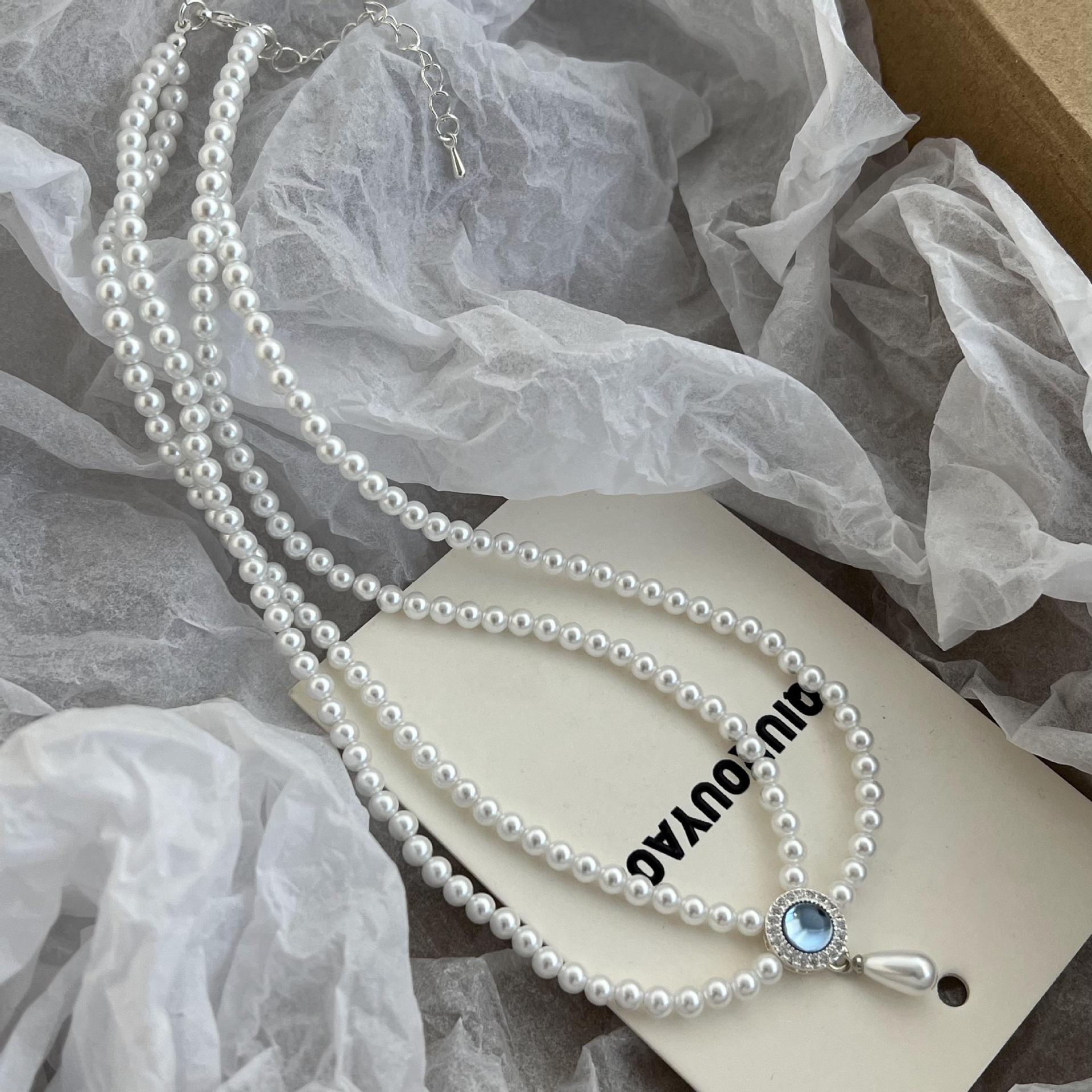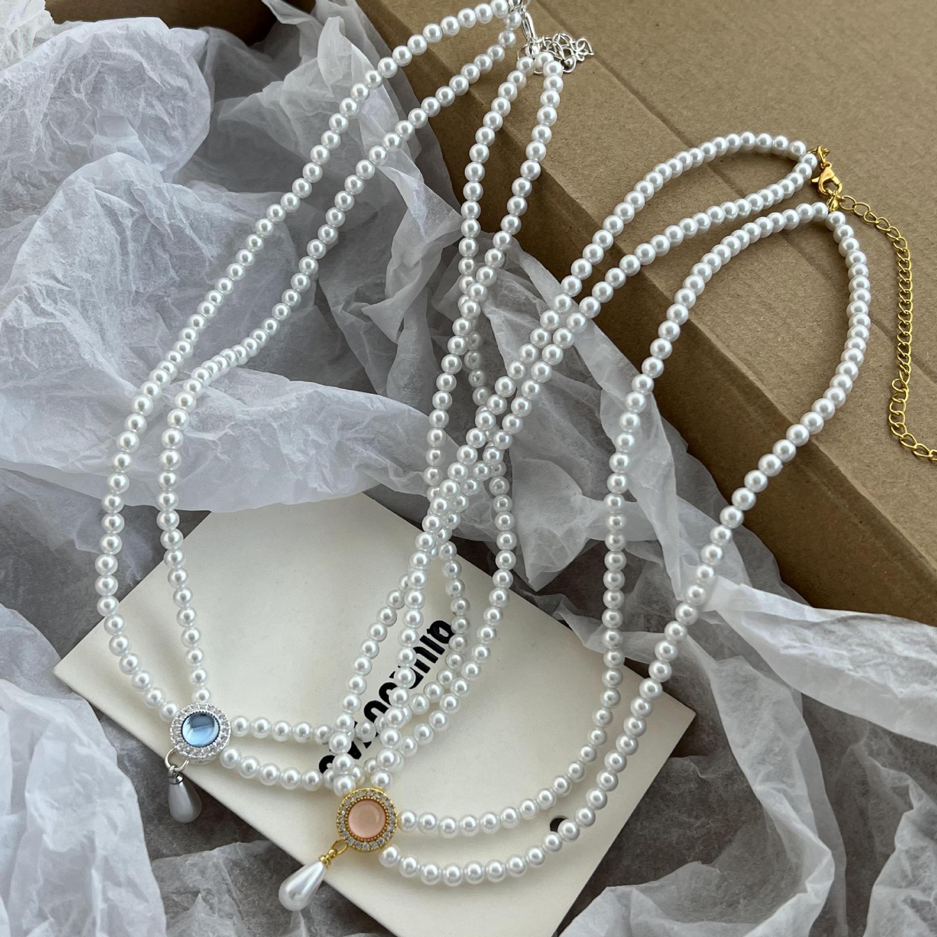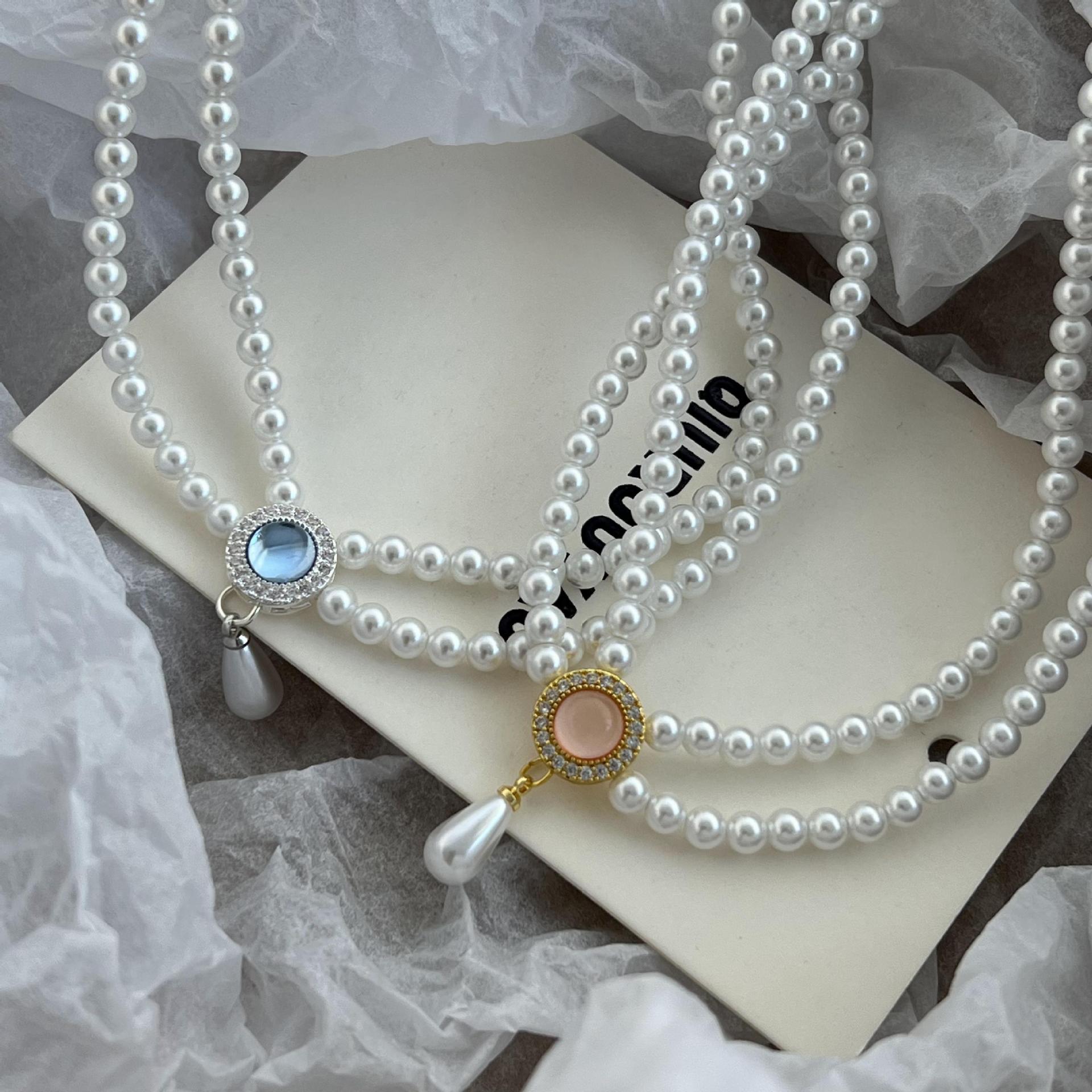 Pink chalcedony double-layer pearl necklace, Lake blue chalcedony double-layer pearl necklace