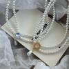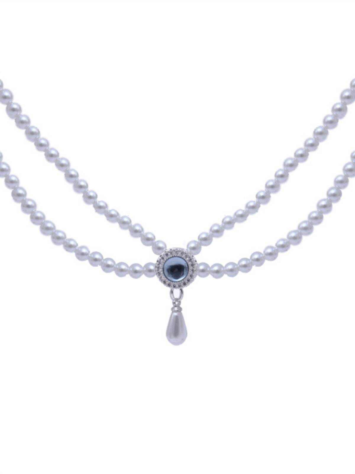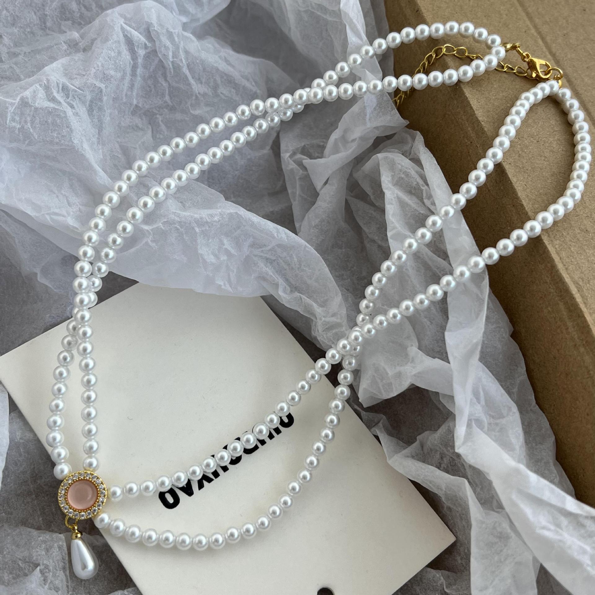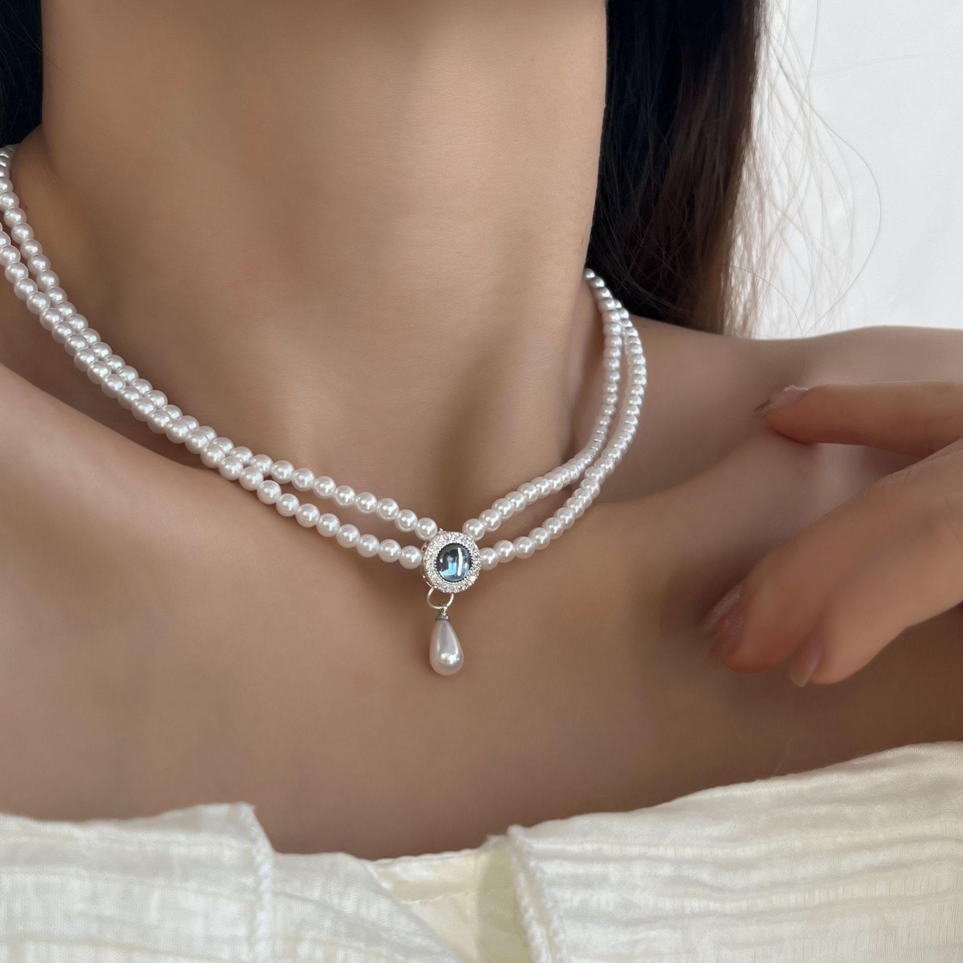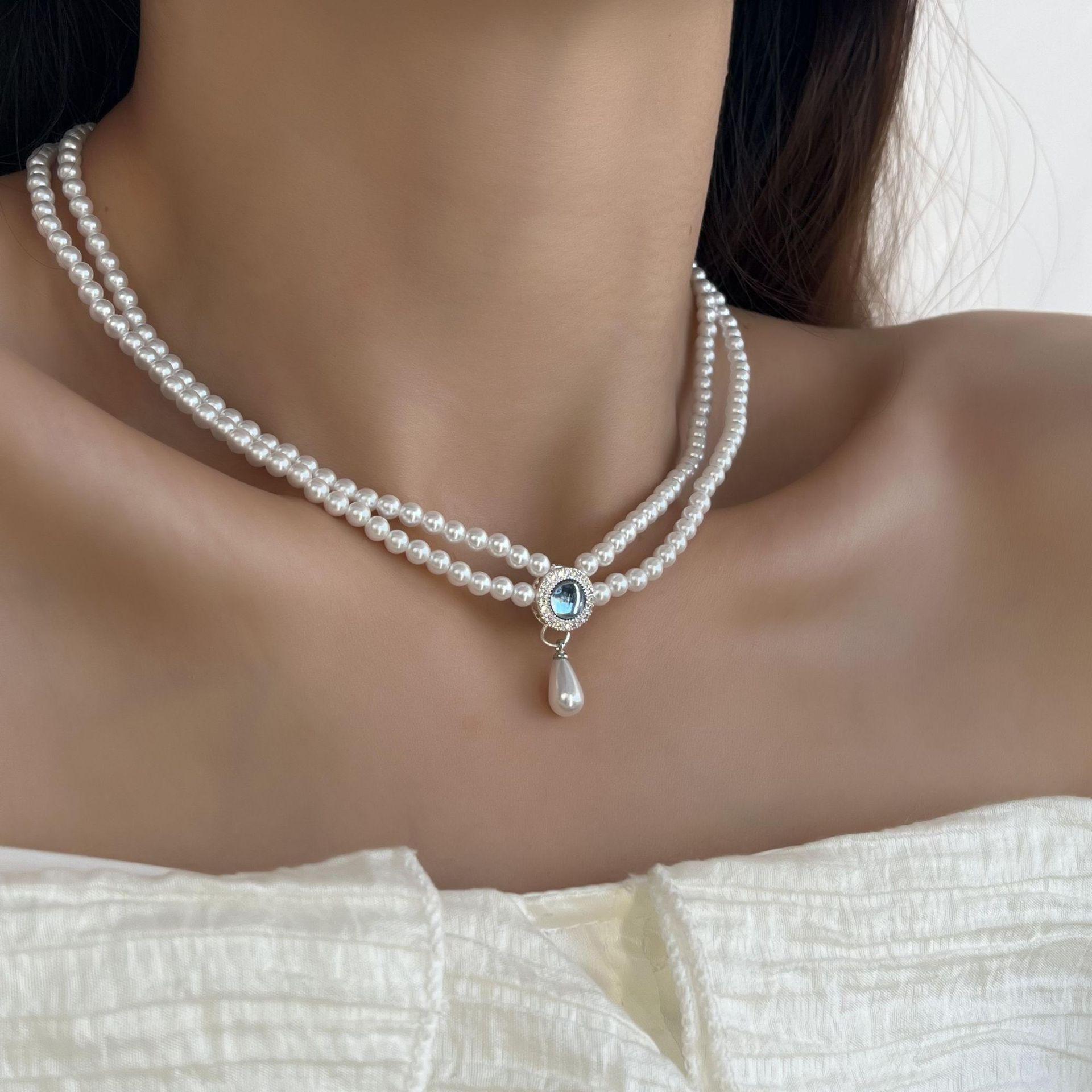 Pink chalcedony double-layer pearl necklace, Lake blue chalcedony double-layer pearl necklace