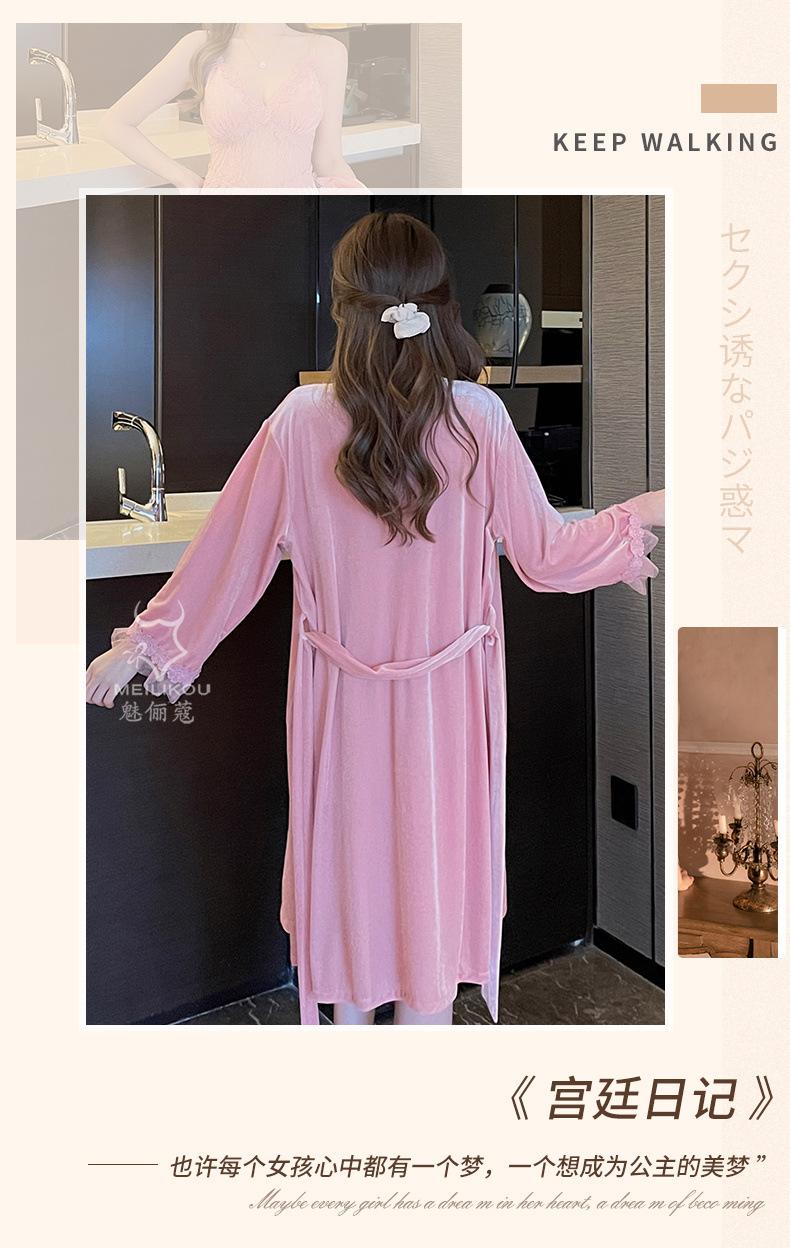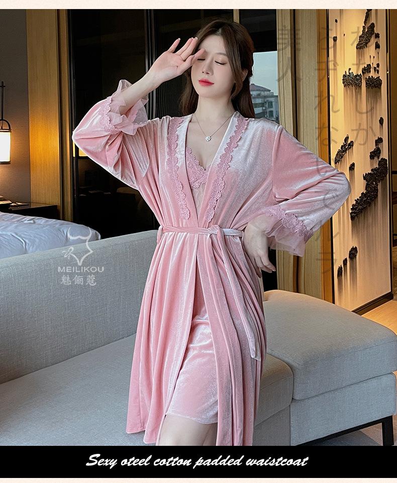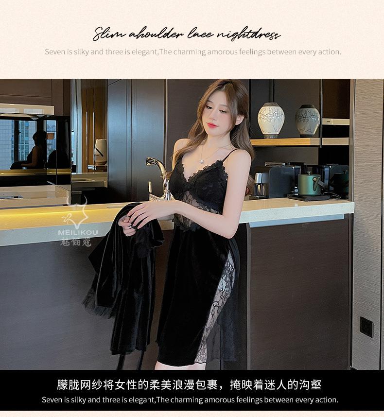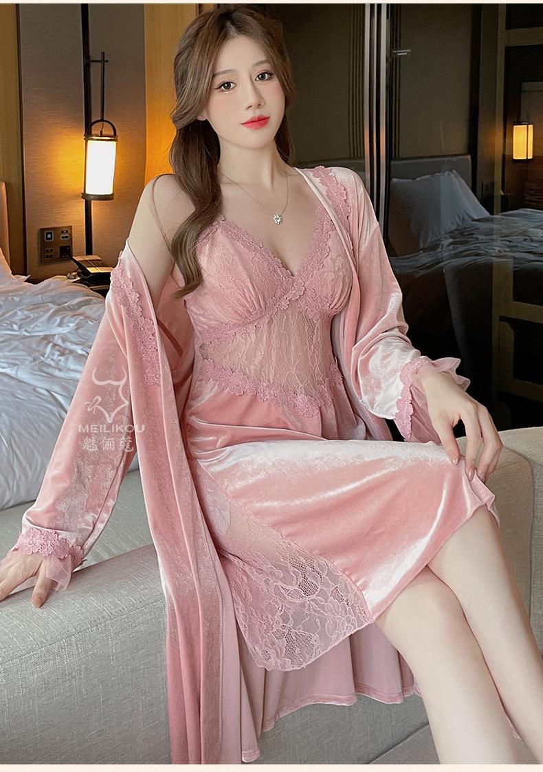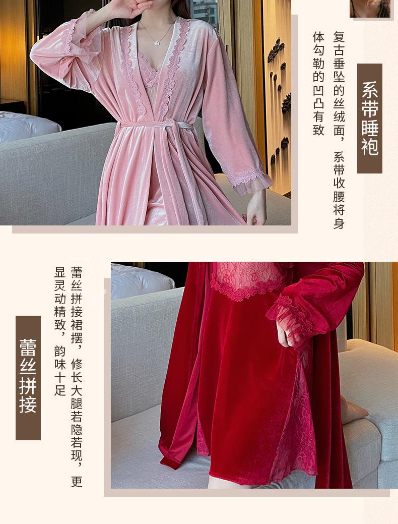 Pijama de otoño e invierno para mujer, camisón de terciopelo dorado de manga larga, cálido, con tirantes, sexy, de encaje, conjunto de camisón calado, 1908