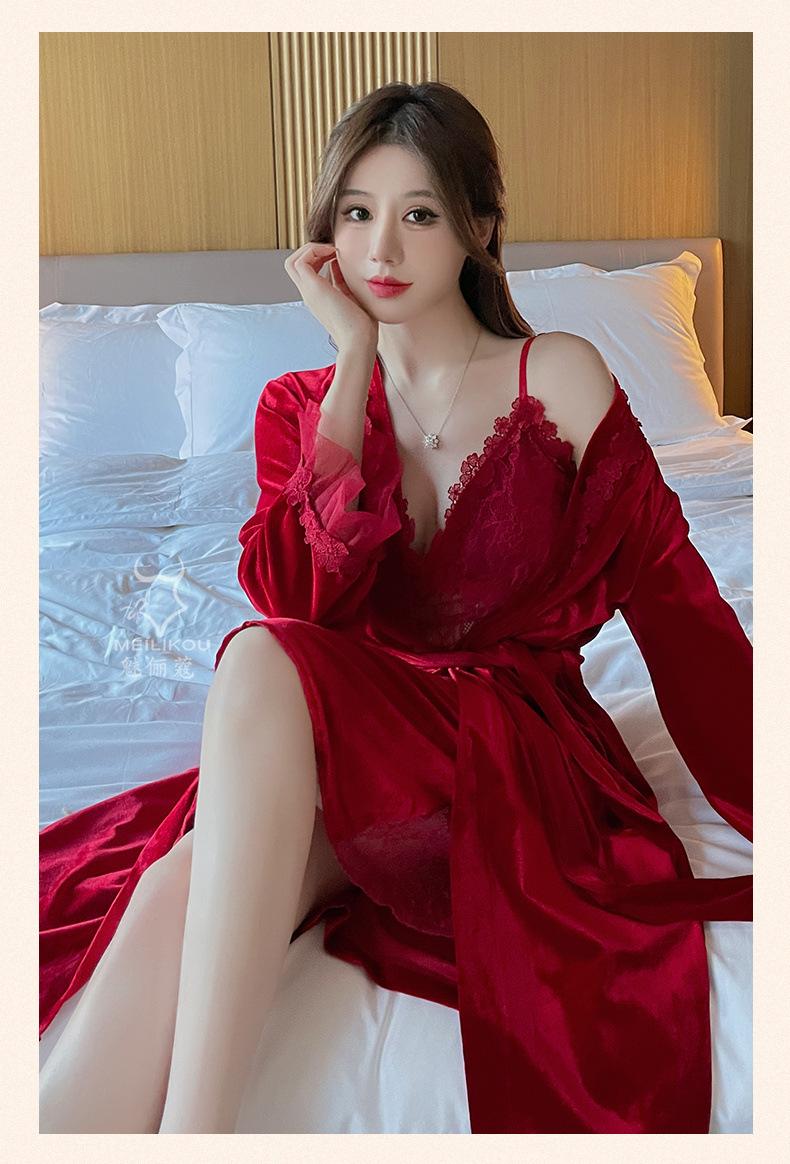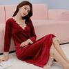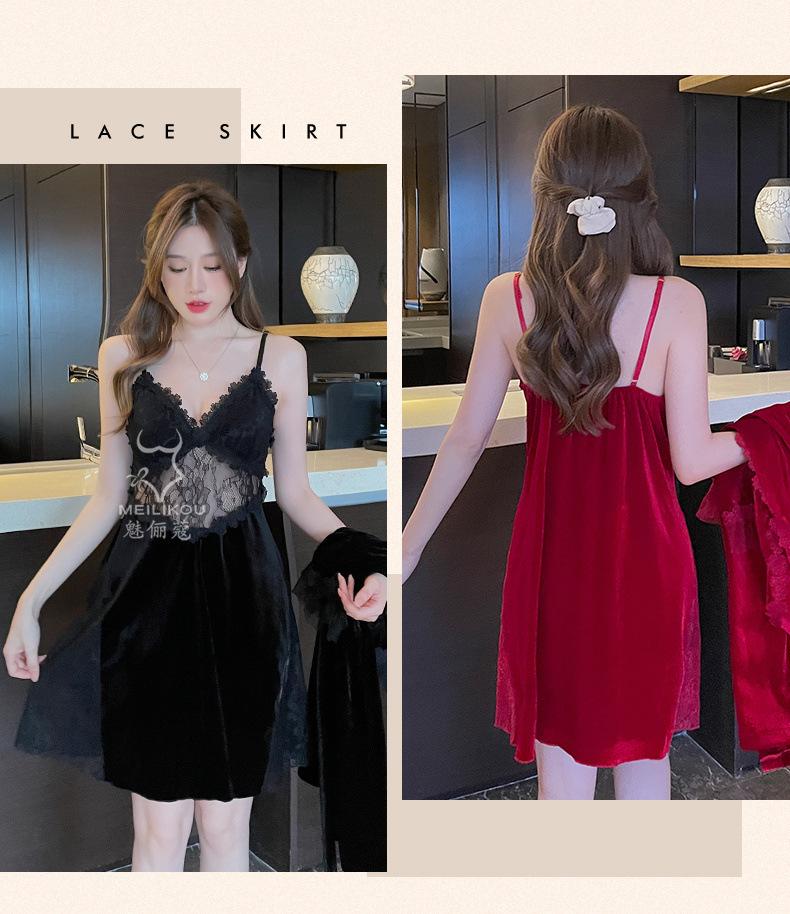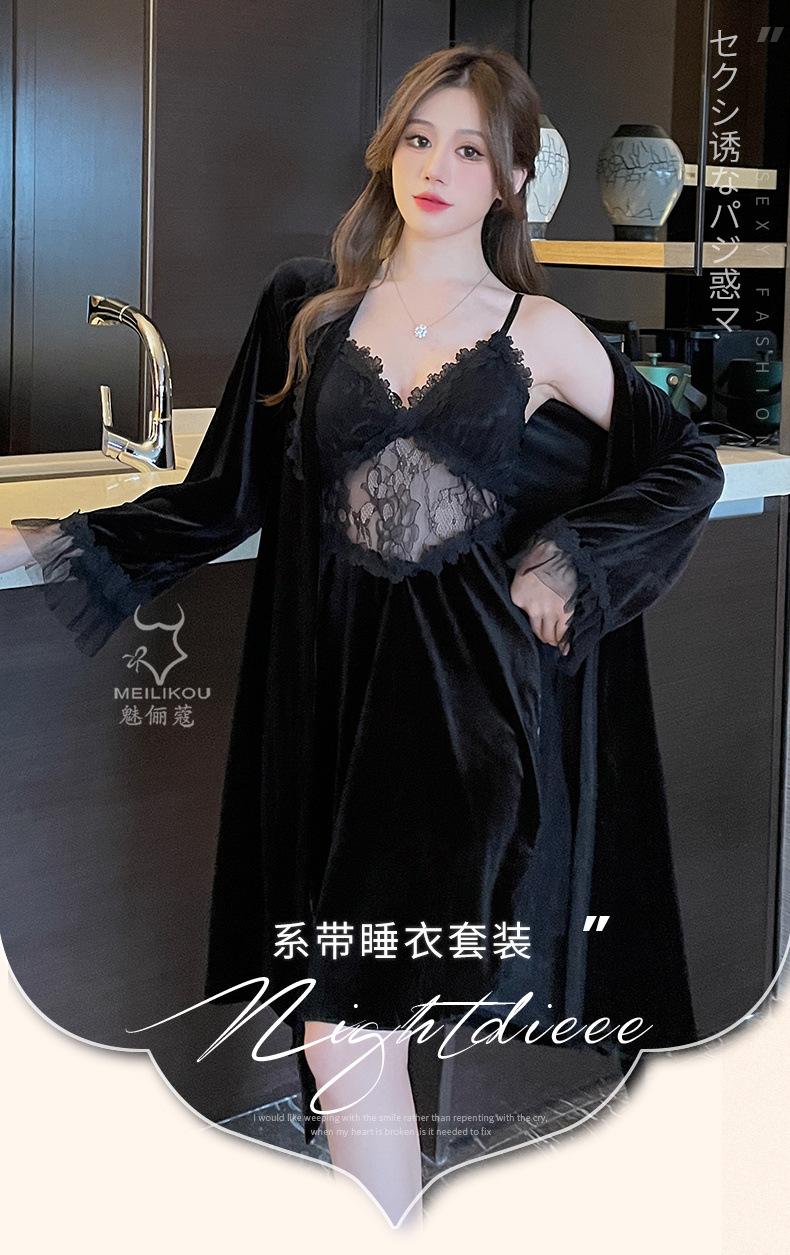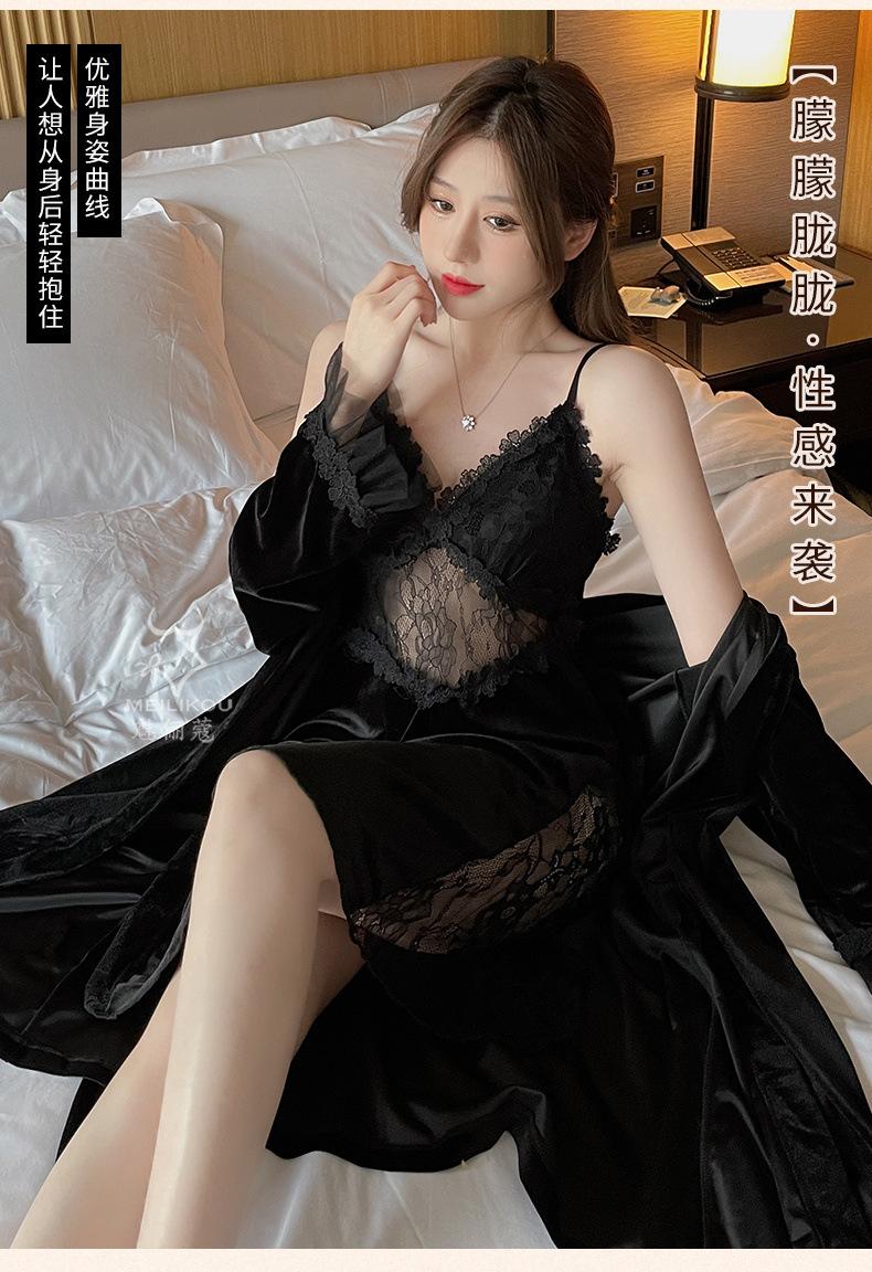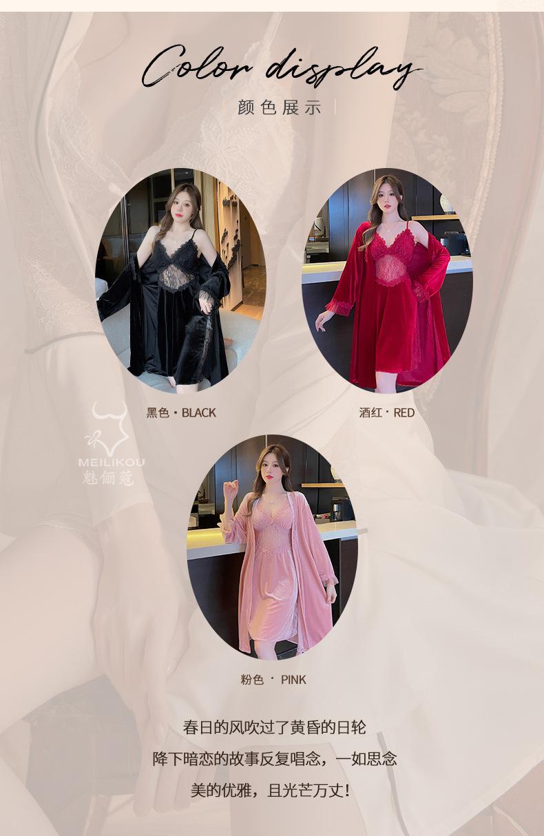 Pijama de otoño e invierno para mujer, camisón de terciopelo dorado de manga larga, cálido, con tirantes, sexy, de encaje, conjunto de camisón calado, 1908
