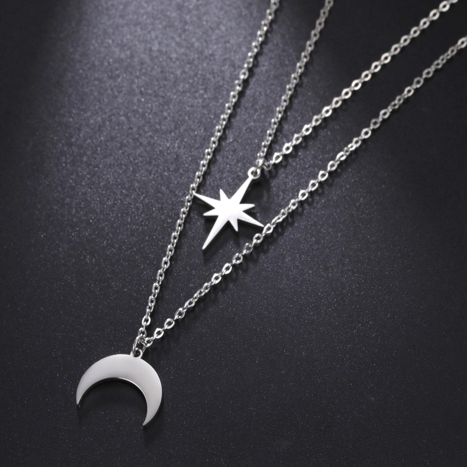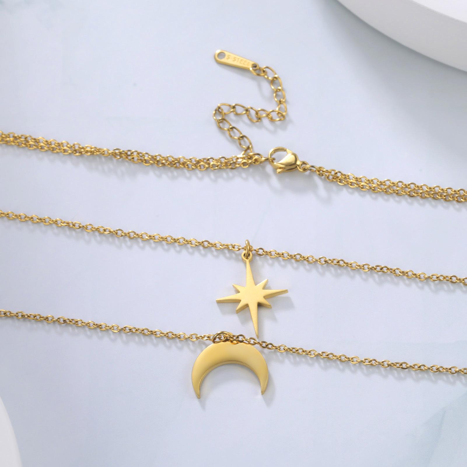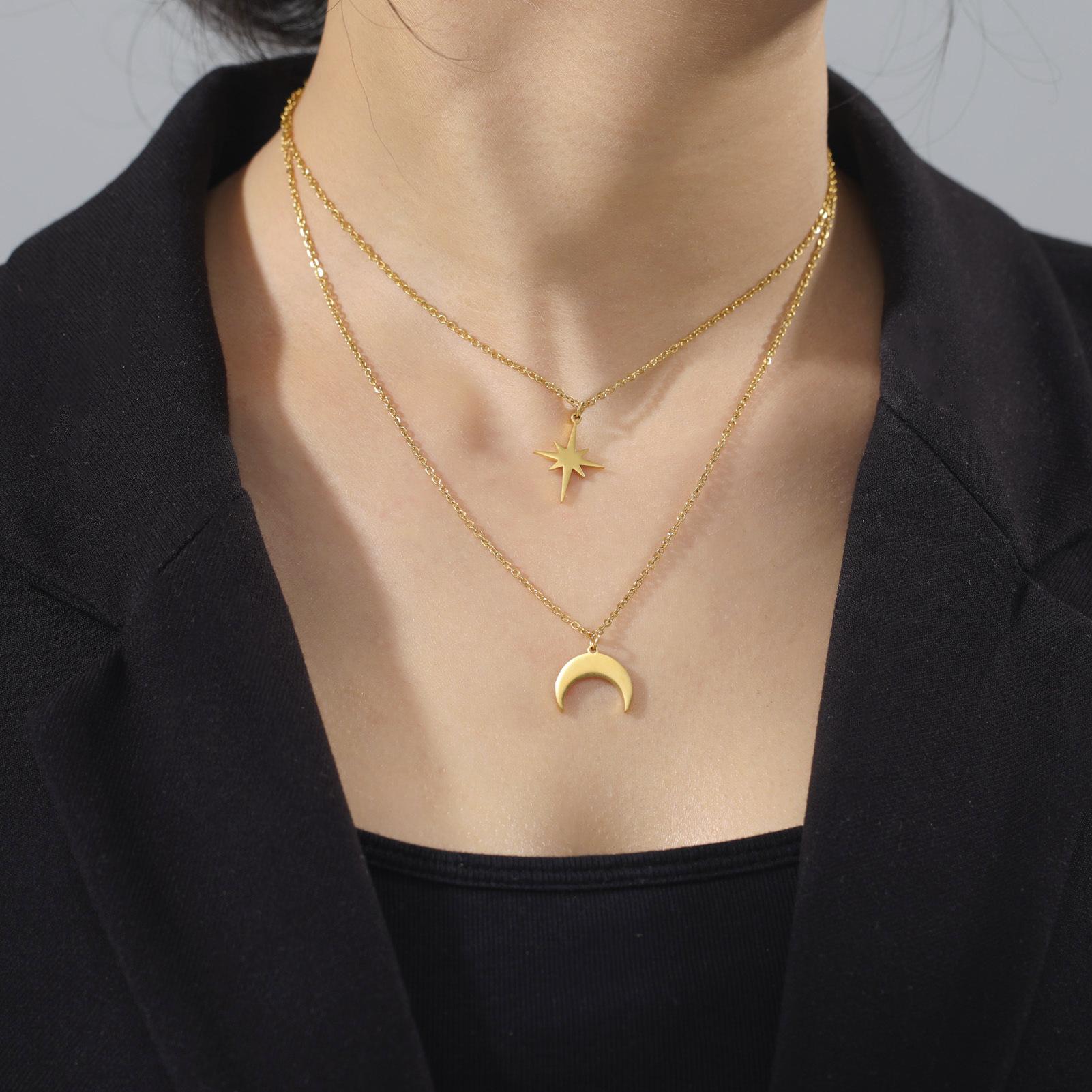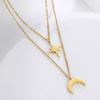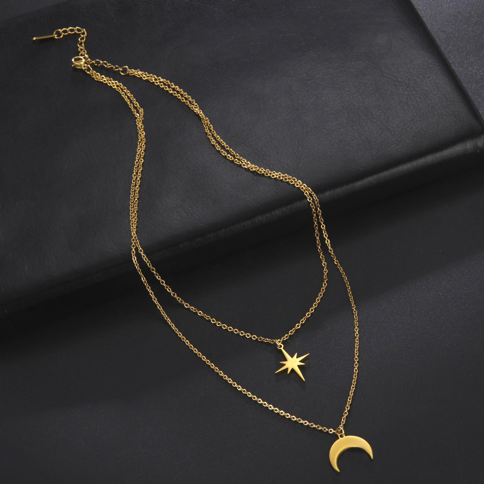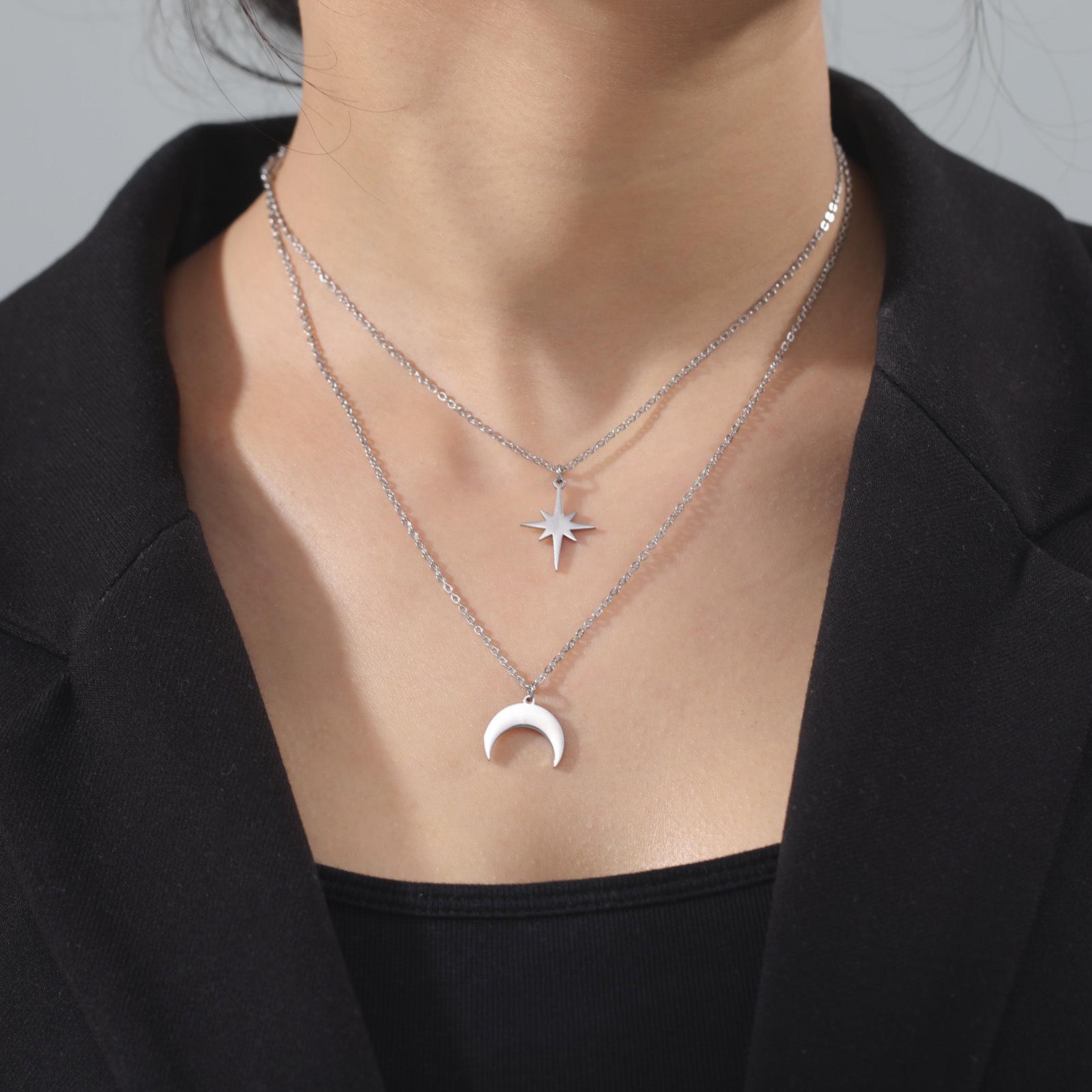 Collar de acero inoxidable con colgante de media luna superior, cadena doble, estilo coreano, simple y atmosférico, con luz de estrella de seis puntas y cadena cruzada.