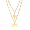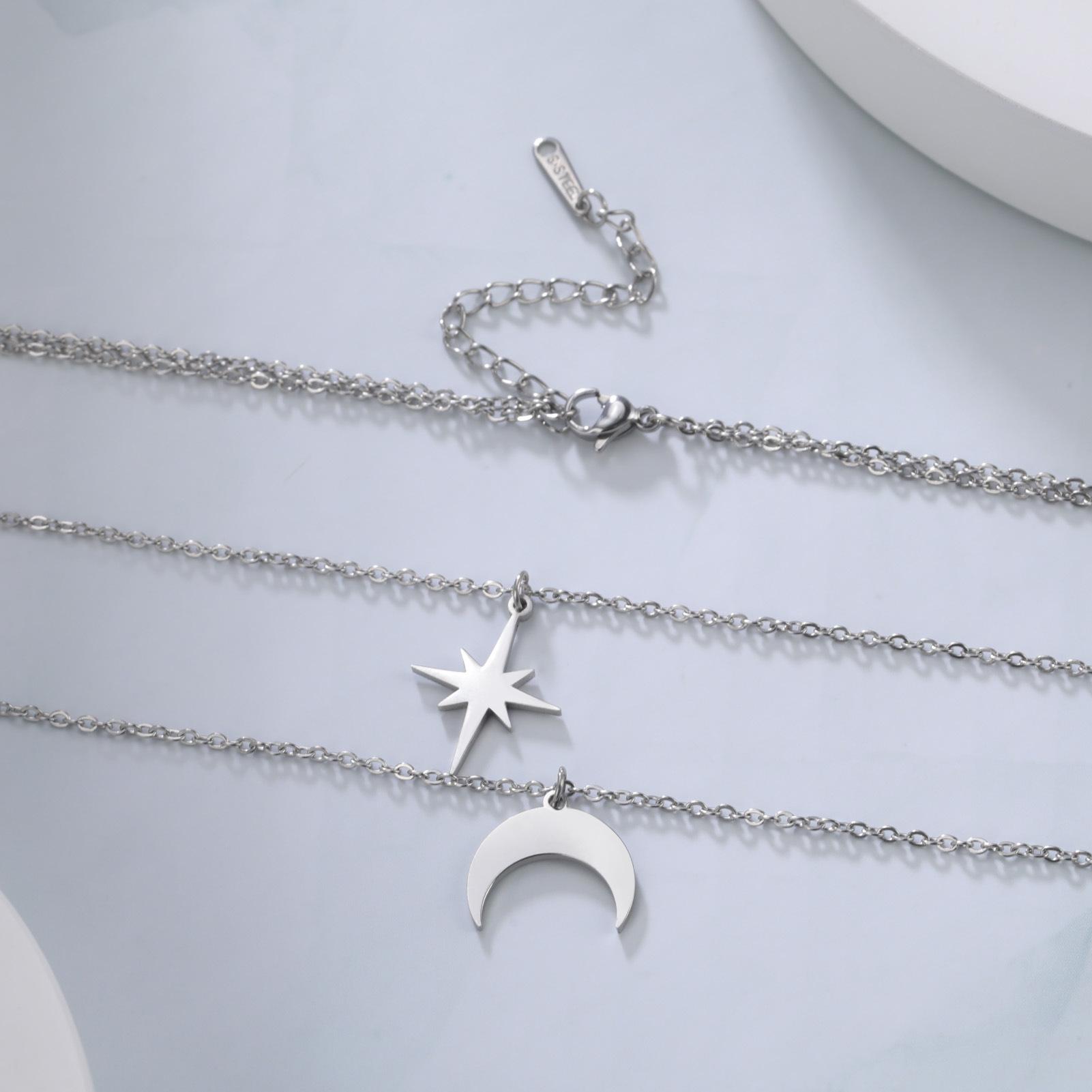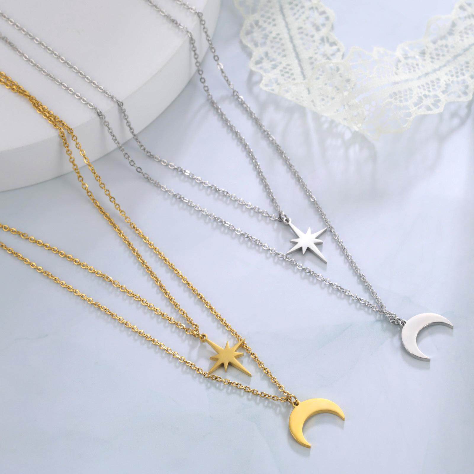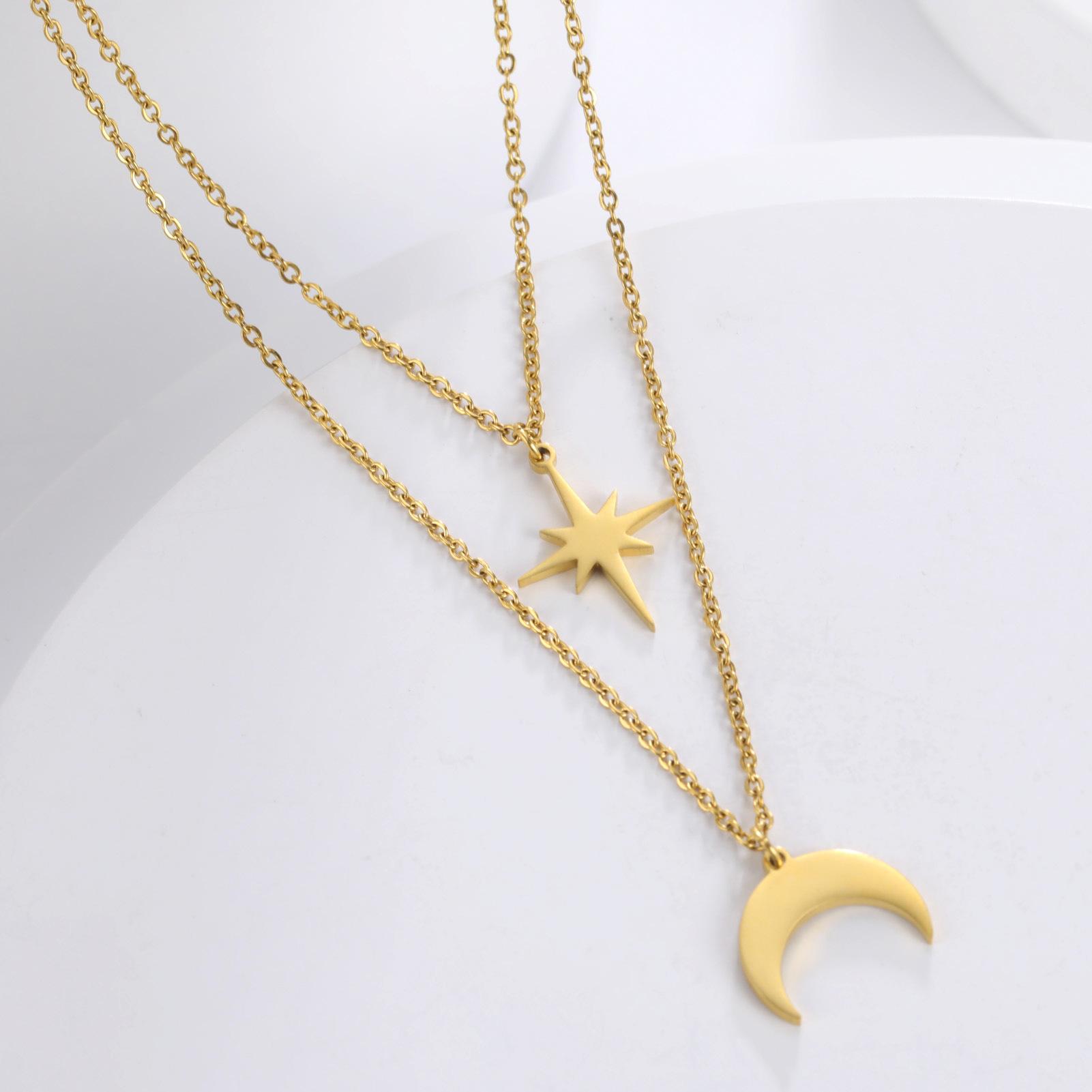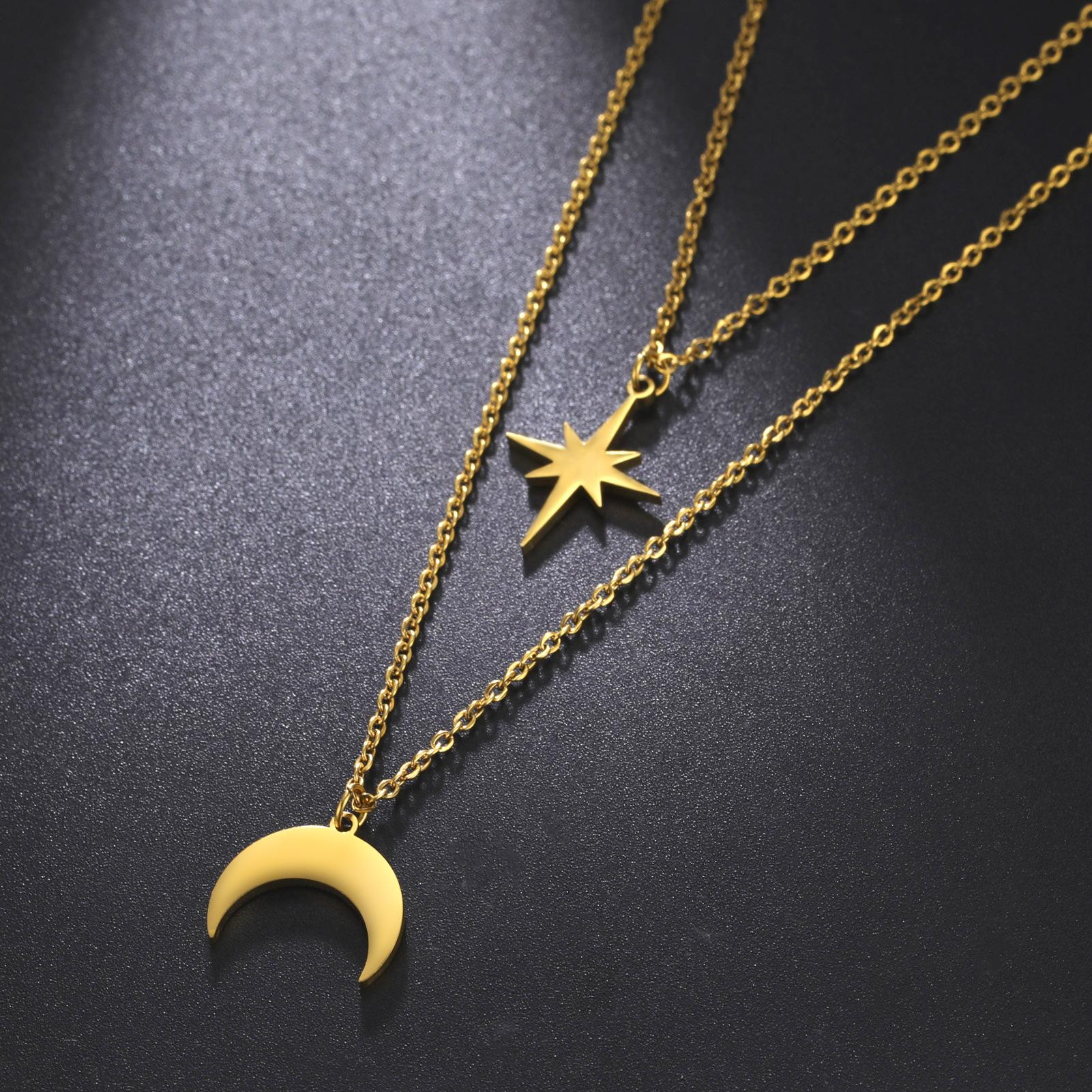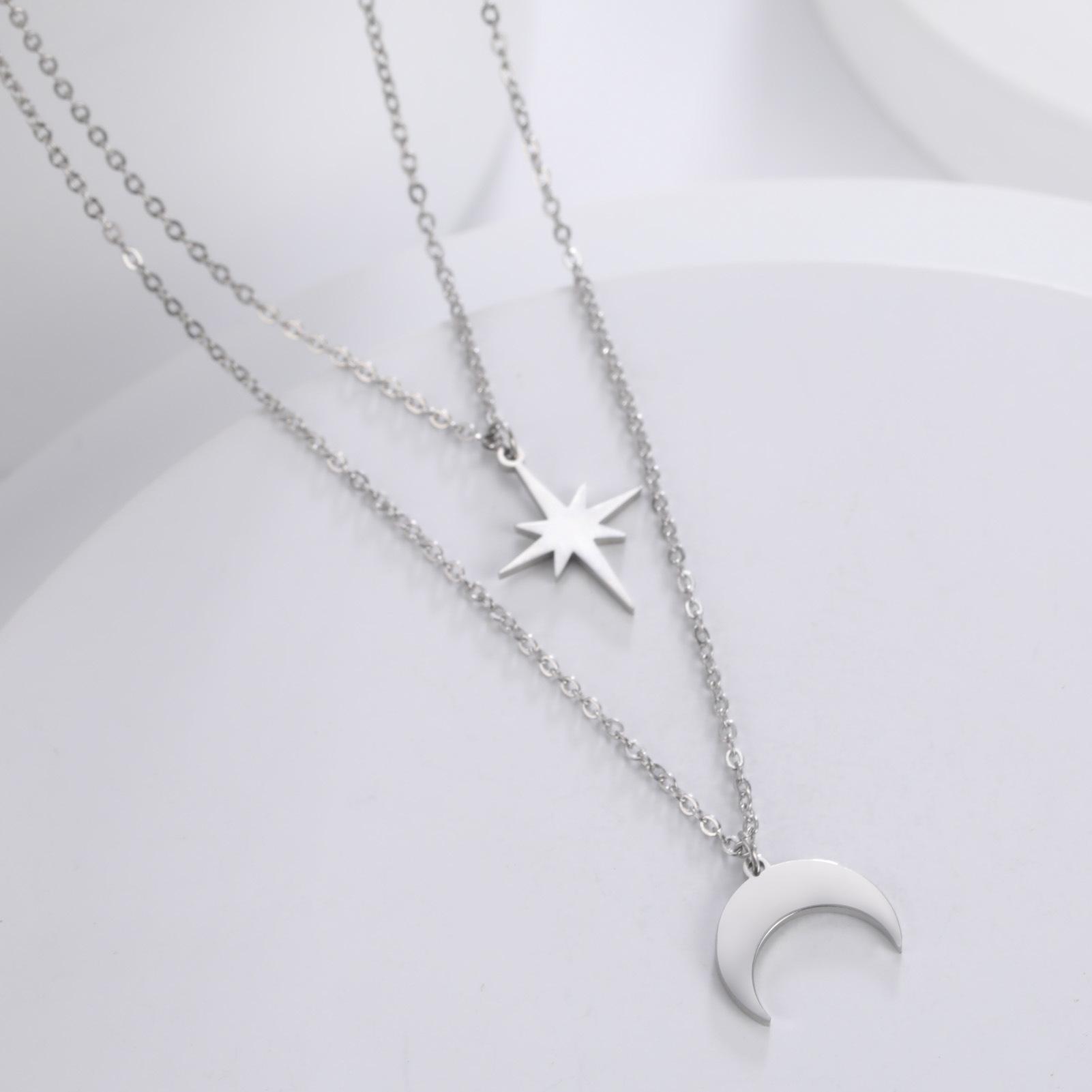 Collar de acero inoxidable con colgante de media luna superior, cadena doble, estilo coreano, simple y atmosférico, con luz de estrella de seis puntas y cadena cruzada.