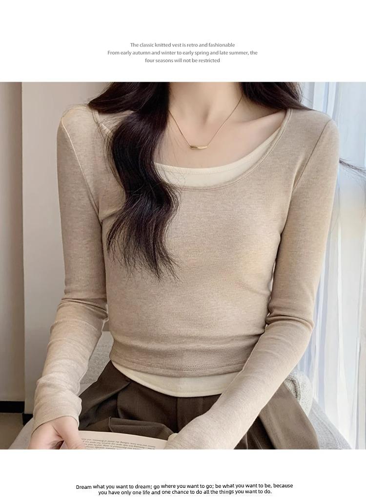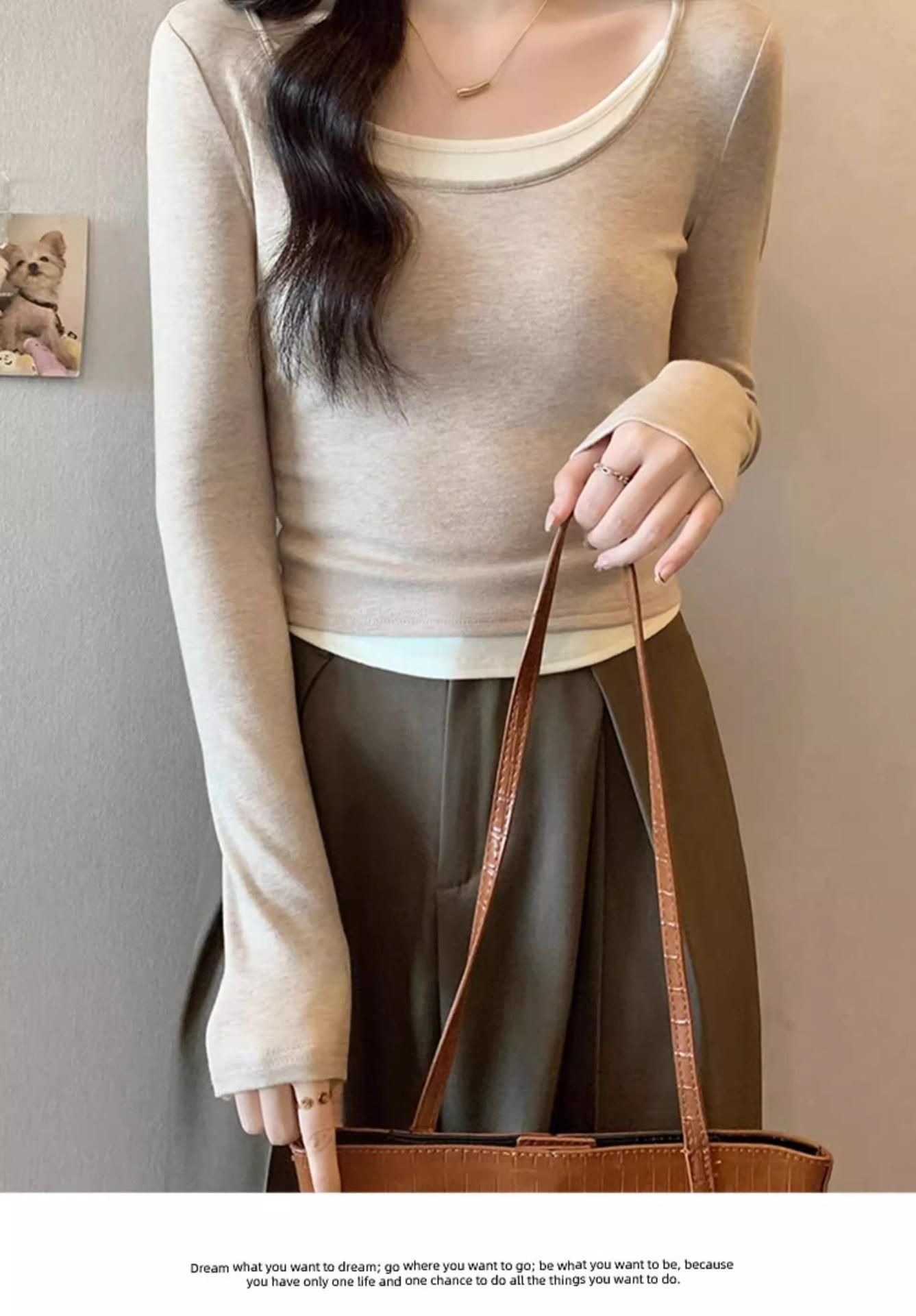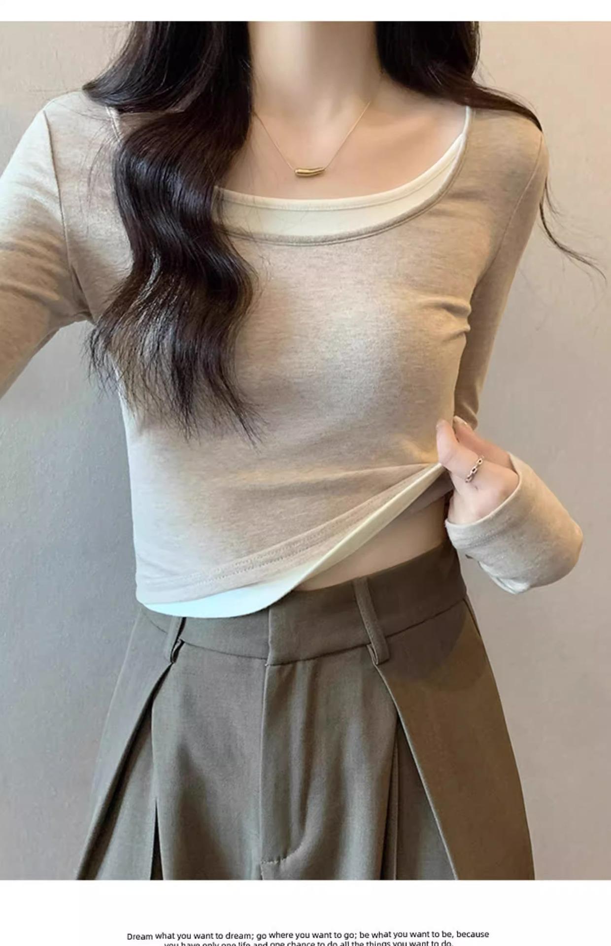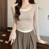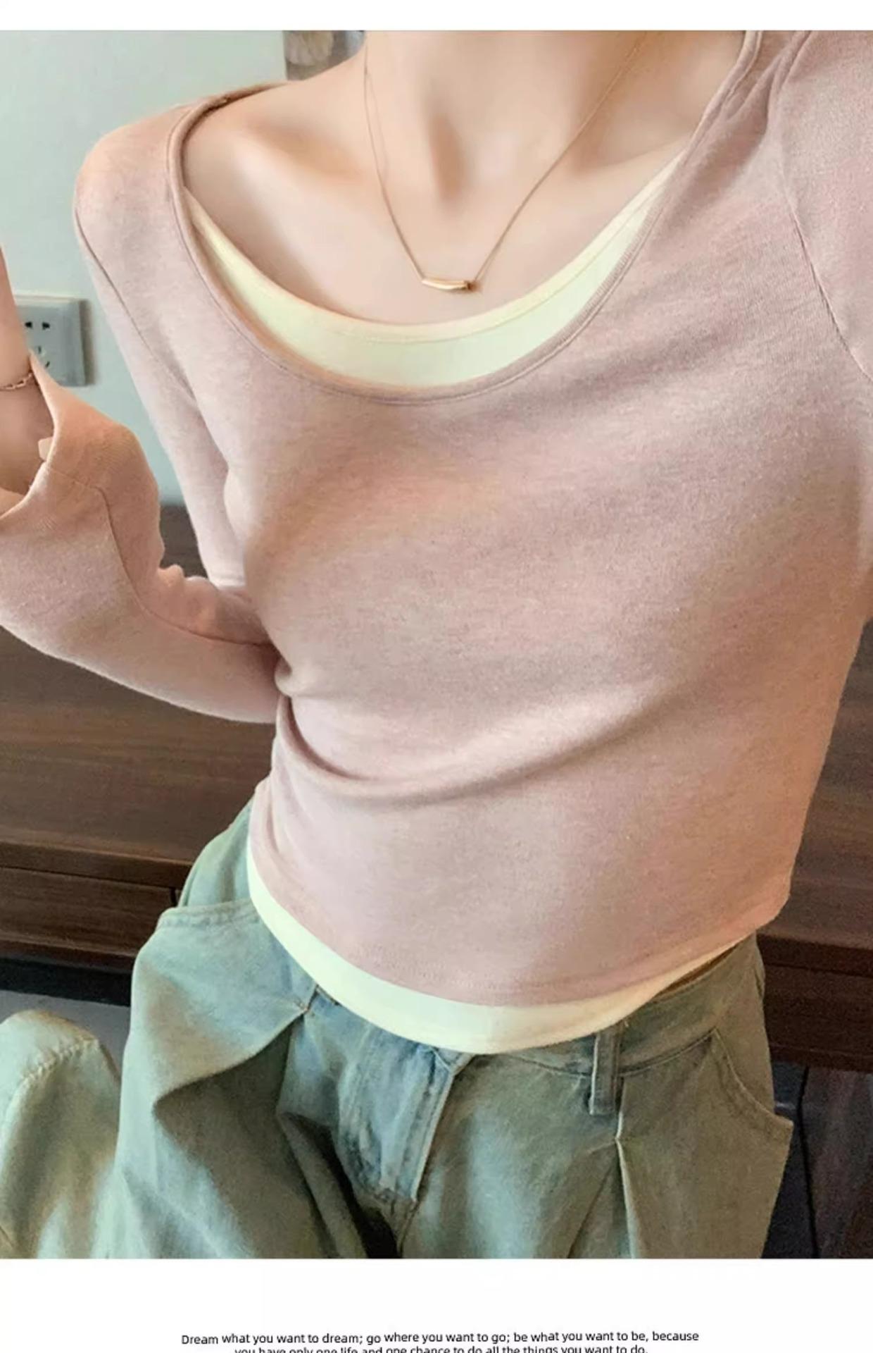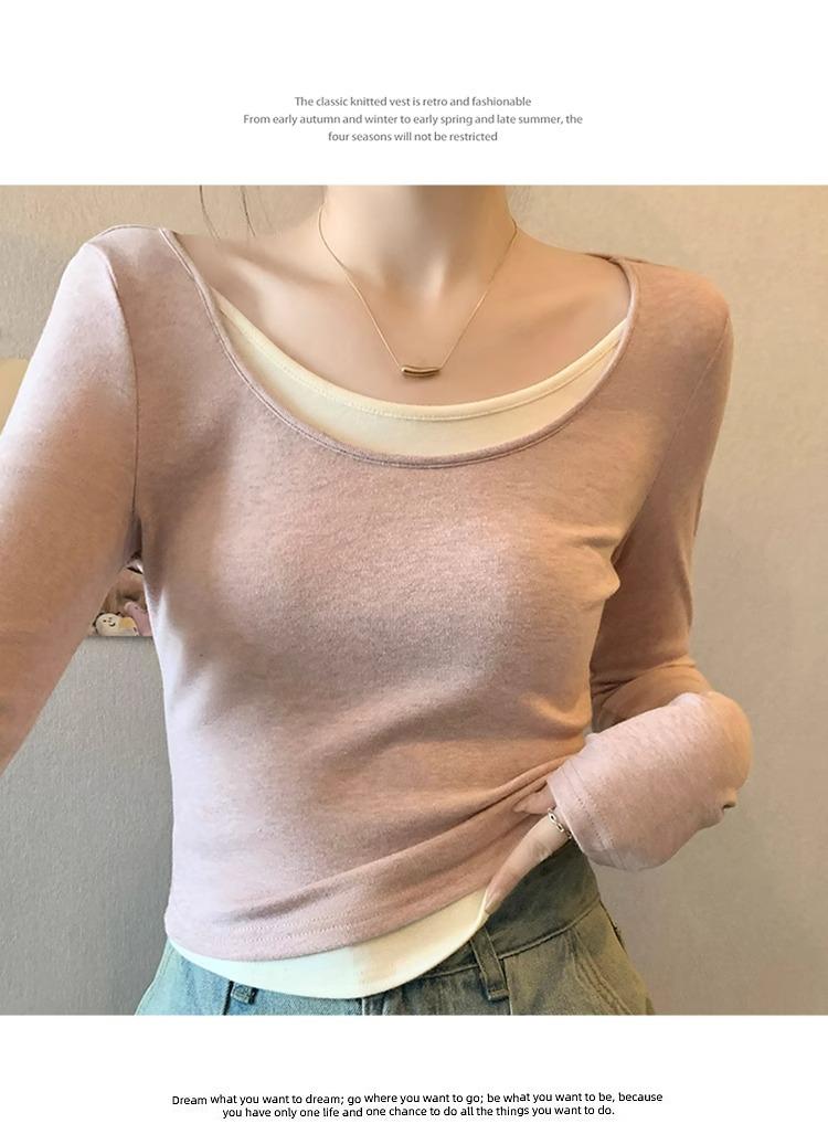 Usa una camiseta interior de fondo de persona pequeña para mujer en otoño e invierno con cuello asimétrico en U a juego de color, manga larga y top para la clavícula