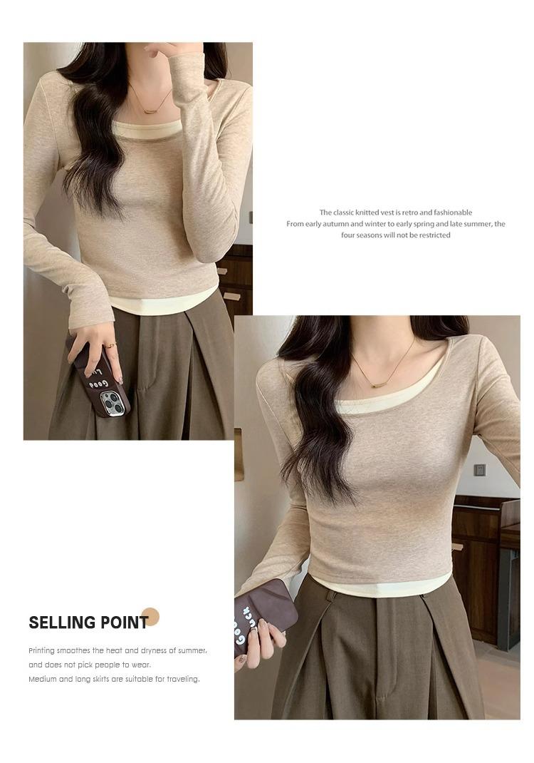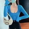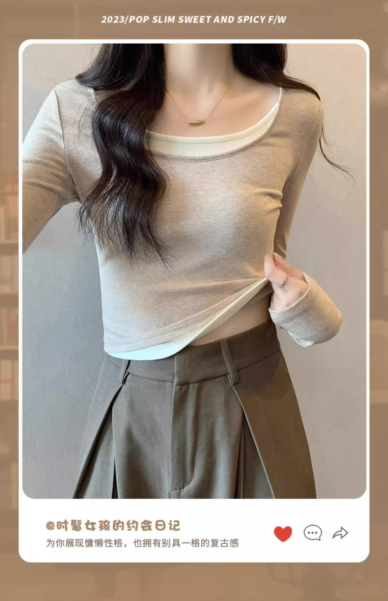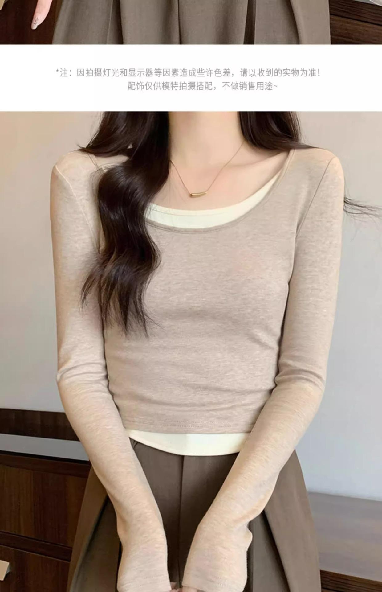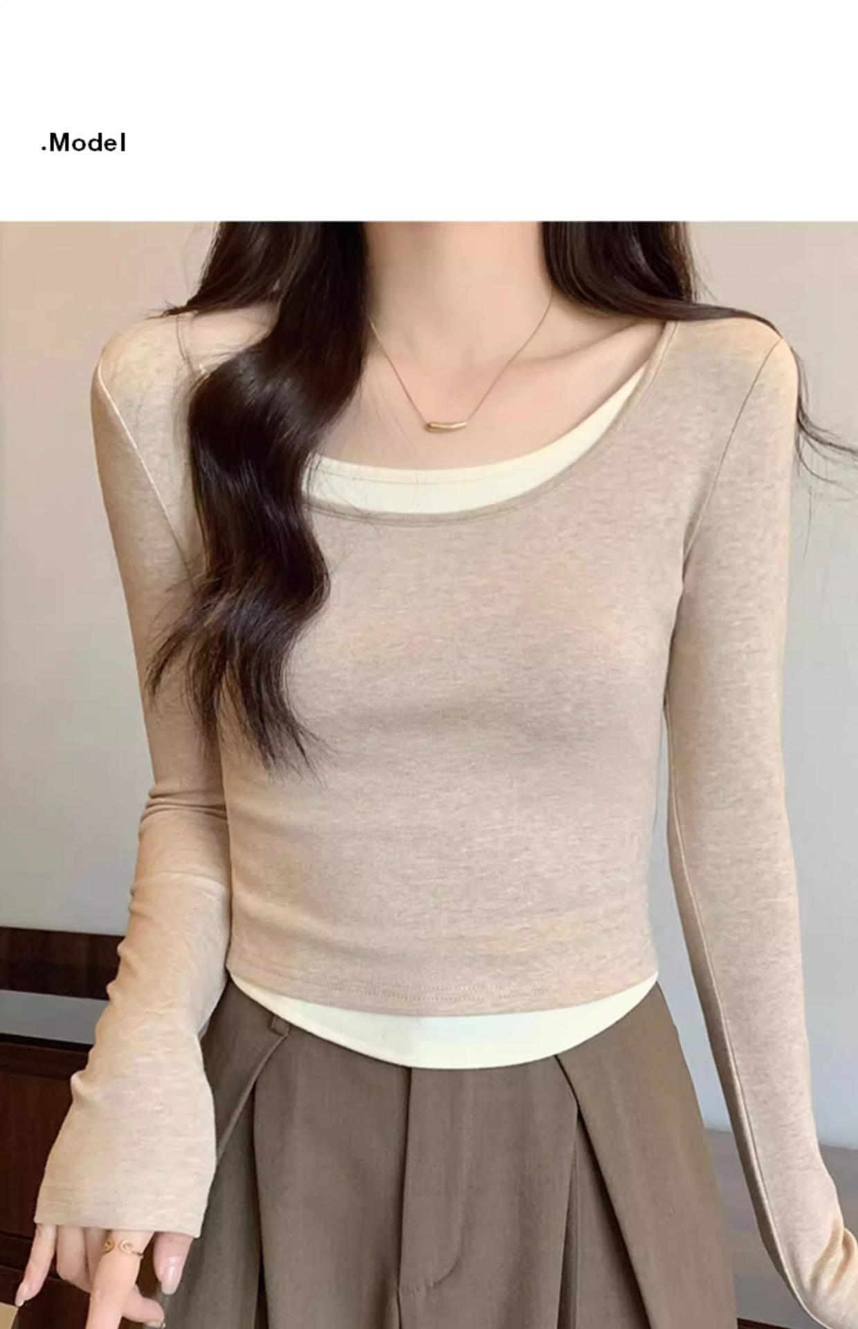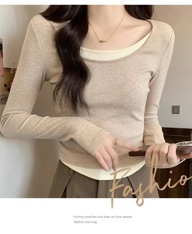 Usa una camiseta interior de fondo de persona pequeña para mujer en otoño e invierno con cuello asimétrico en U a juego de color, manga larga y top para la clavícula