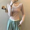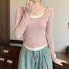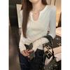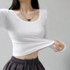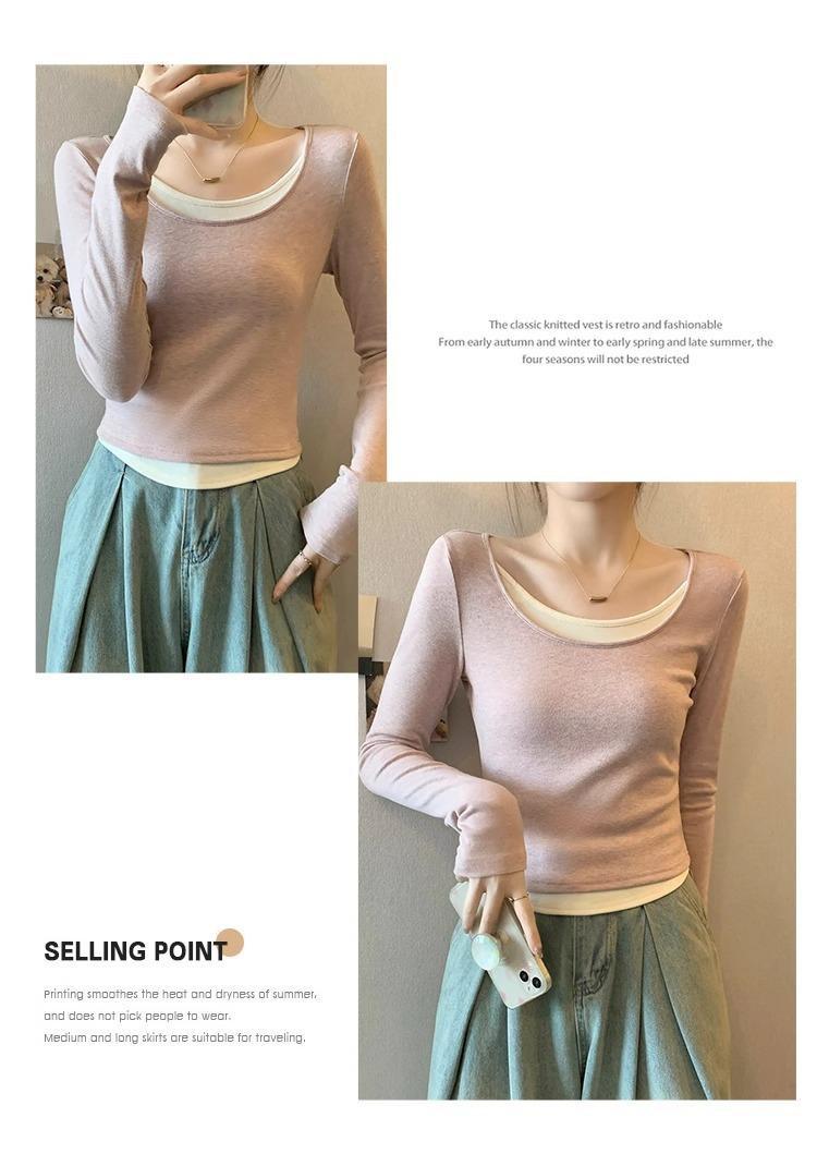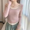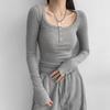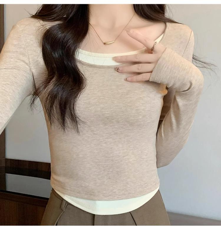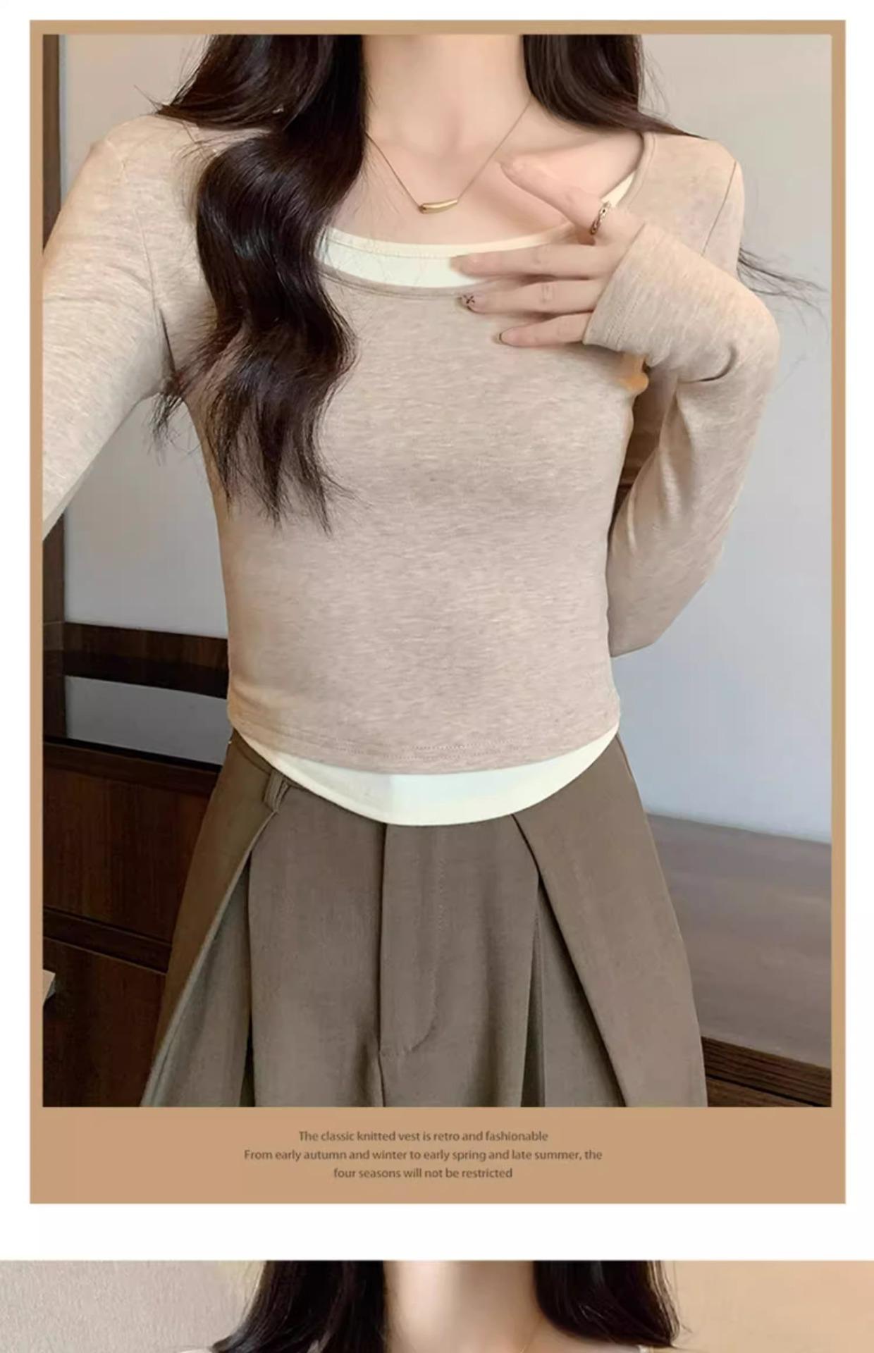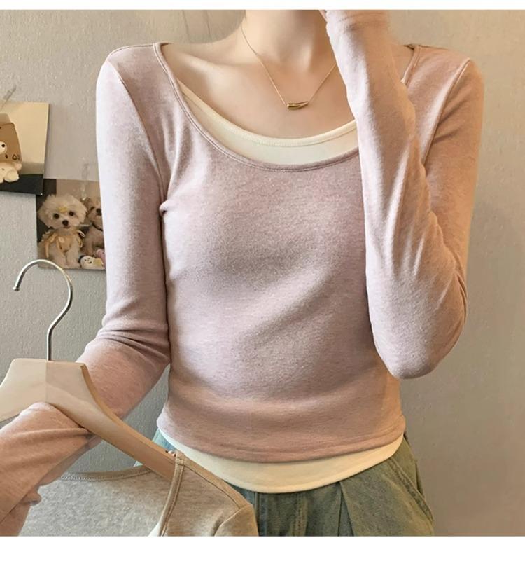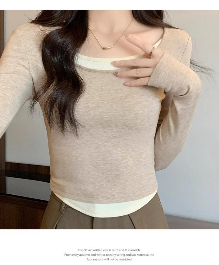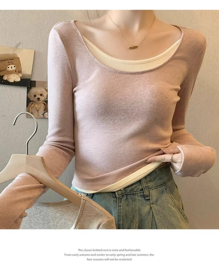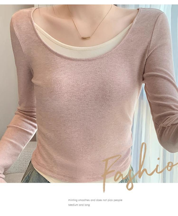 Usa una camiseta interior de fondo de persona pequeña para mujer en otoño e invierno con cuello asimétrico en U a juego de color, manga larga y top para la clavícula