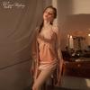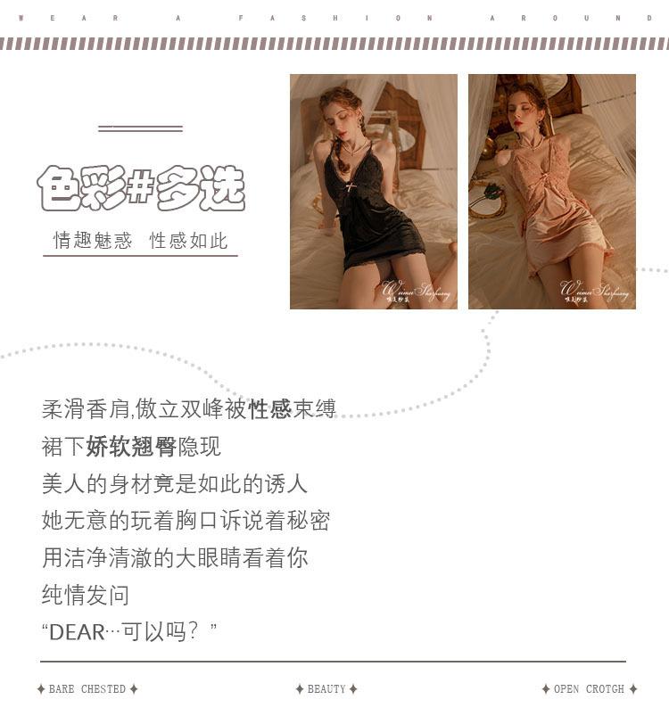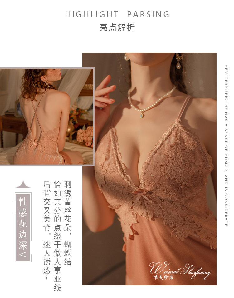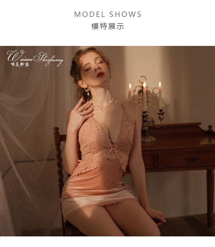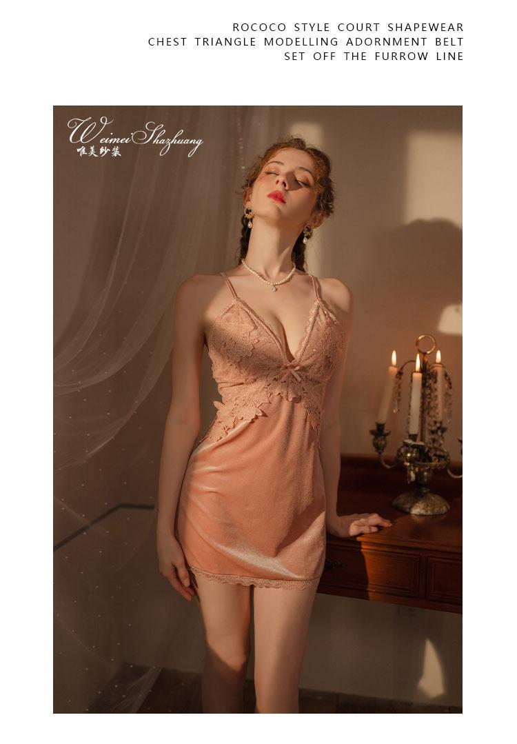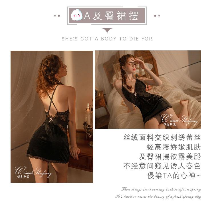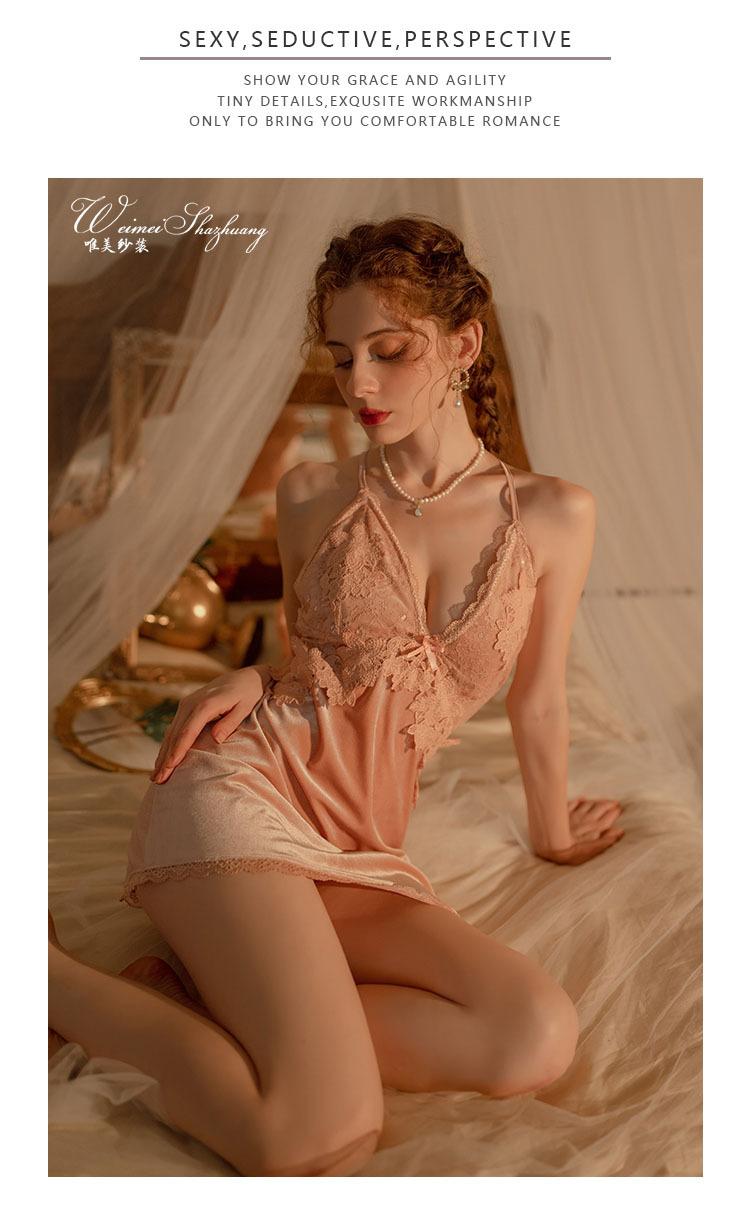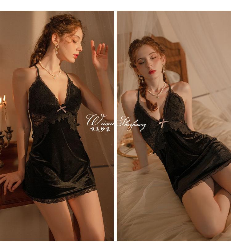 Hermoso camisón de terciopelo sexy de otoño e invierno con encaje y escote en V profundo, camisón sexy sin espalda para mujer