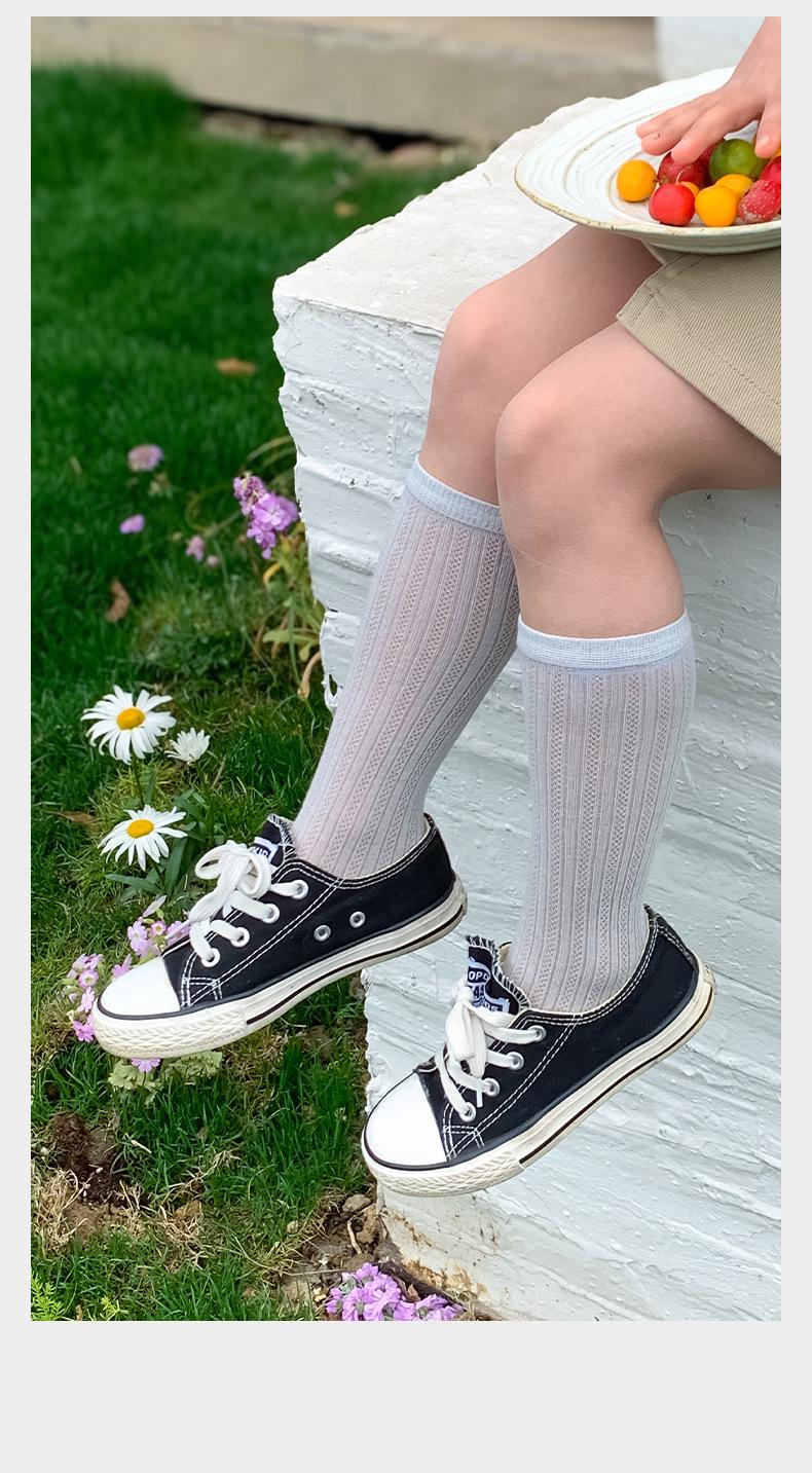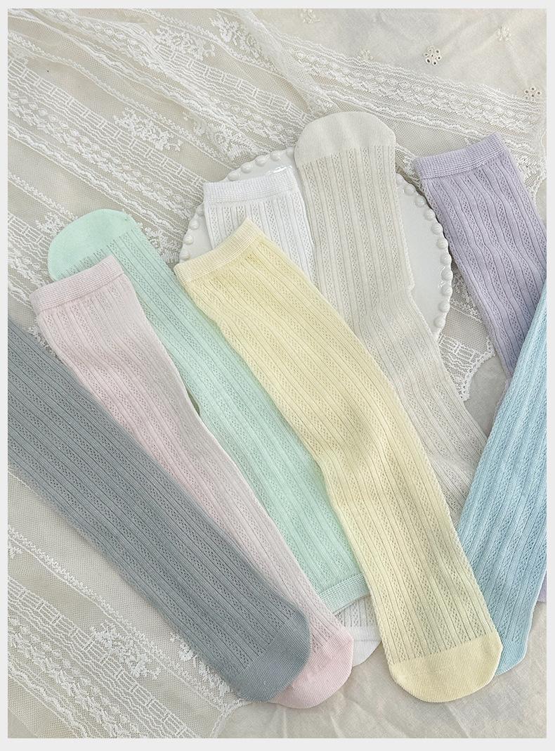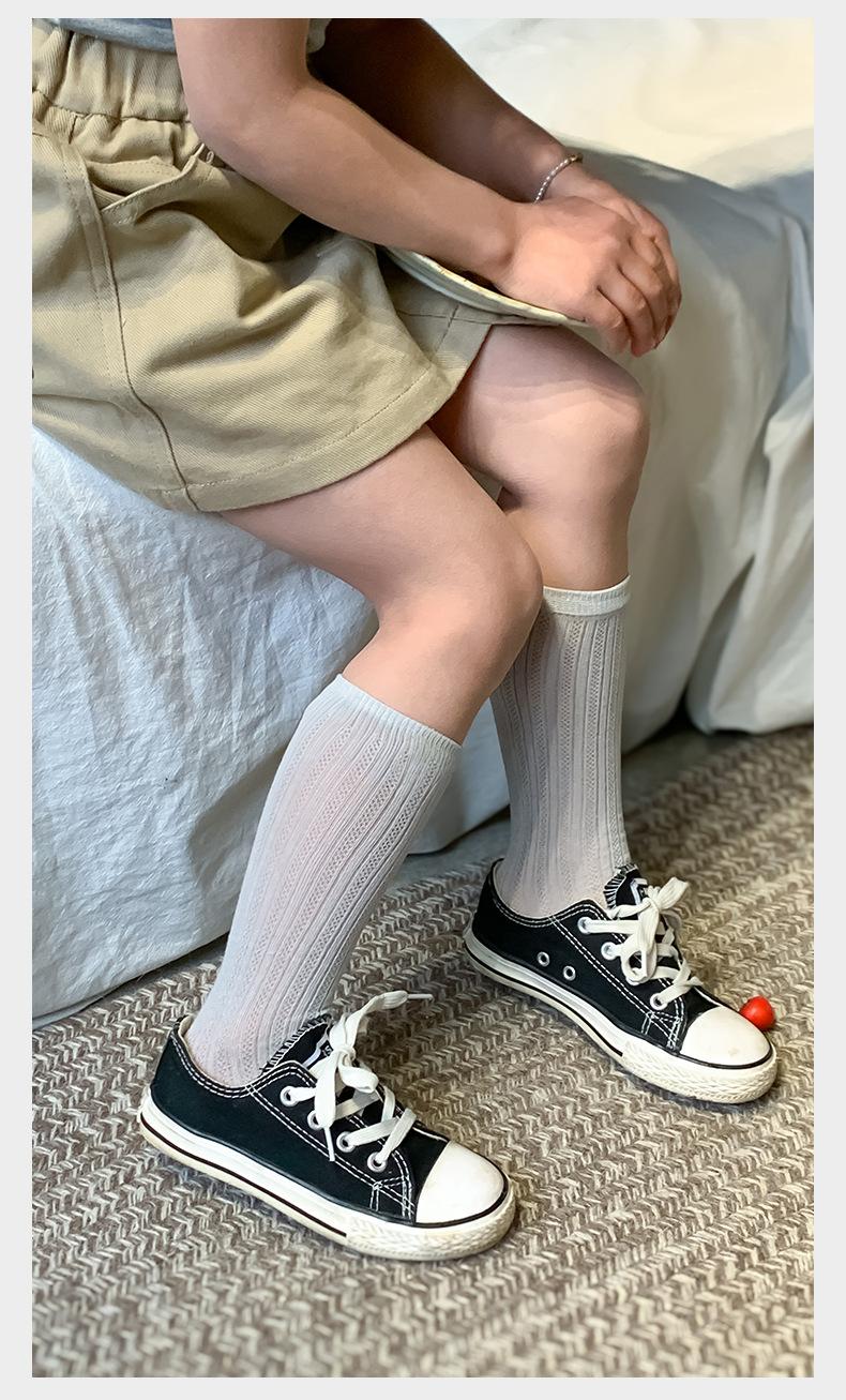 Calcetines de verano para niñas, finos, de clase A, coreanos, de algodón, transpirables, de malla, de color liso, con tiras verticales, de tubo medio para niños.
