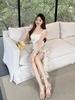 Vestido Francés con Cuello Cuadrado con Volantes Floral sin Espalda con Tirantes de Verano para Mujer Falda Larga a la Cintura Diseño Nicho Falda