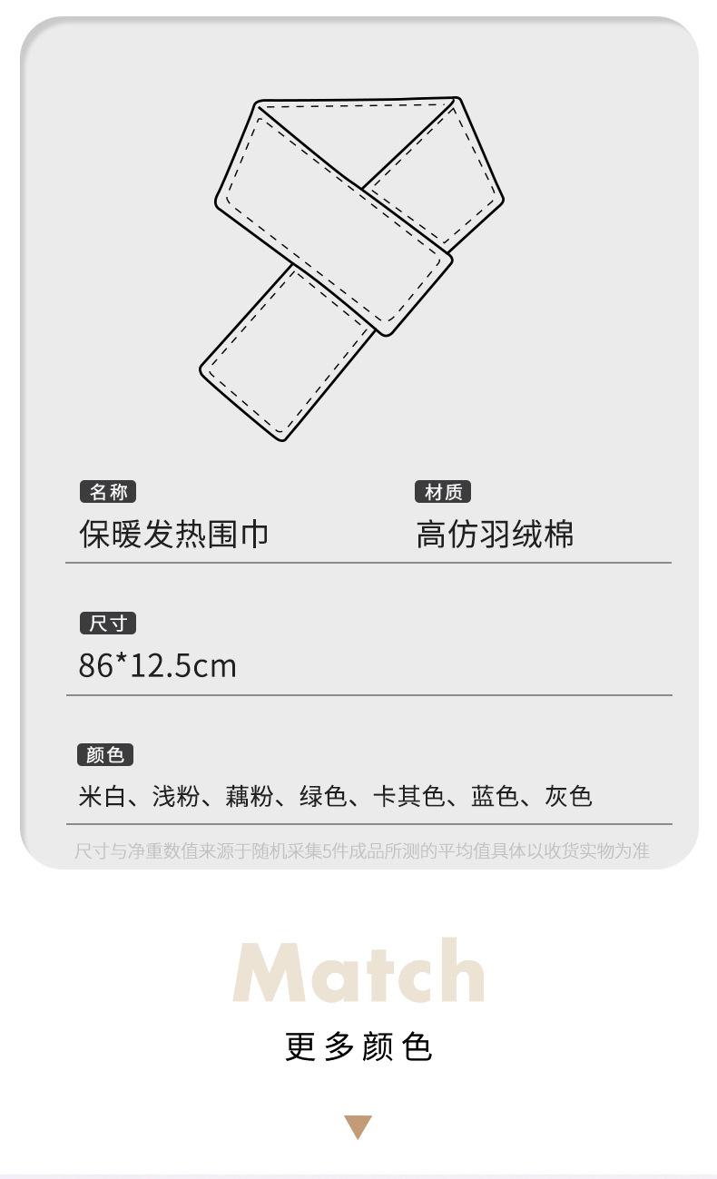 WB207(Bufanda multifuncional):120cm*21cmPeso: 70g Material: Algodón plumón de alta densidad Color: Beige rocío original/gris rojizo/negro crepúsculo/rosa arcoíris temprano/rojo vino/verde menta