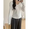 Camiseta de algodón con cuello redondo y hombros descubiertos para mujer, ropa interior de manga larga para otoño, nueva camiseta elástica ajustada y sexy para chica.