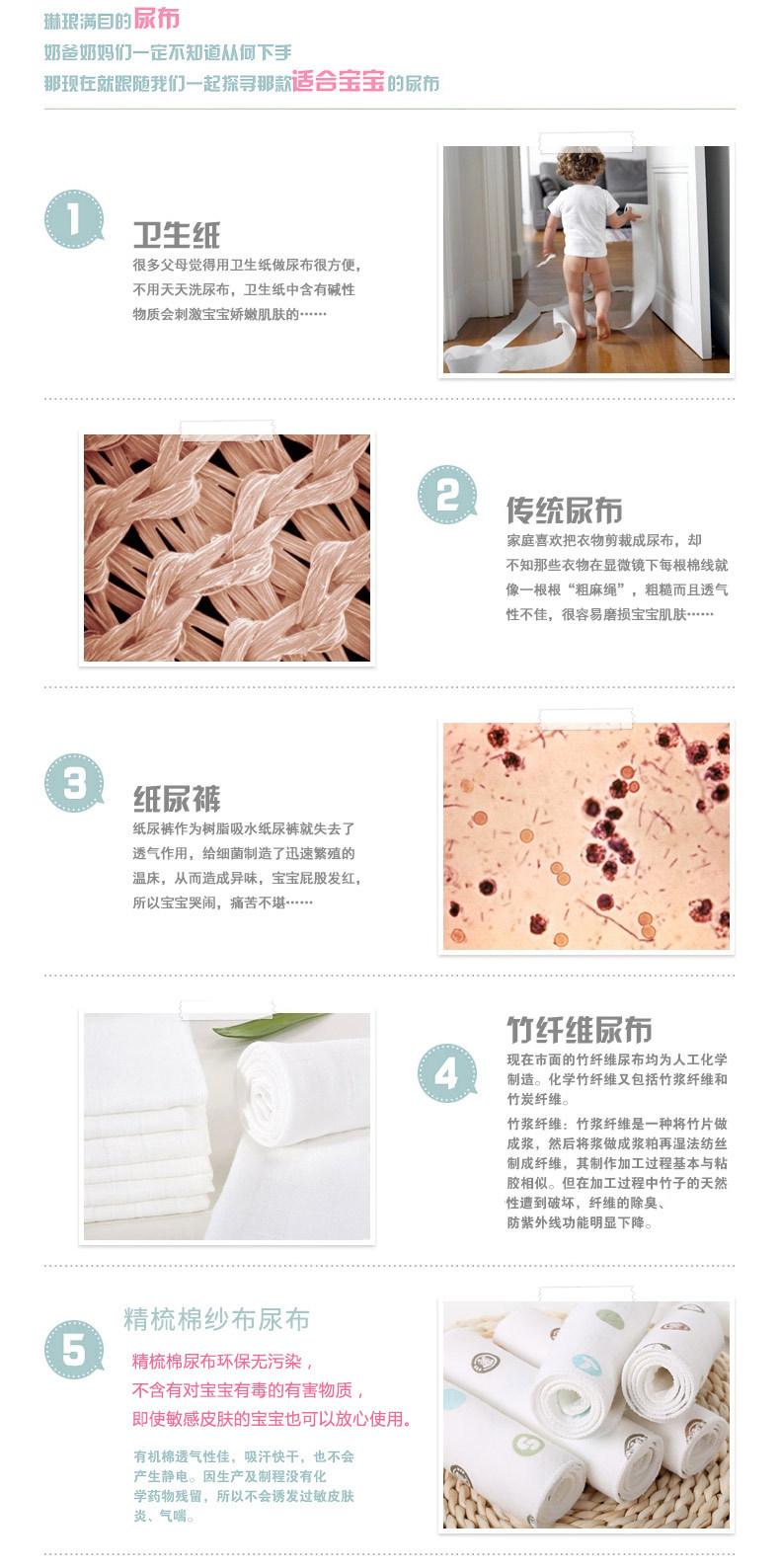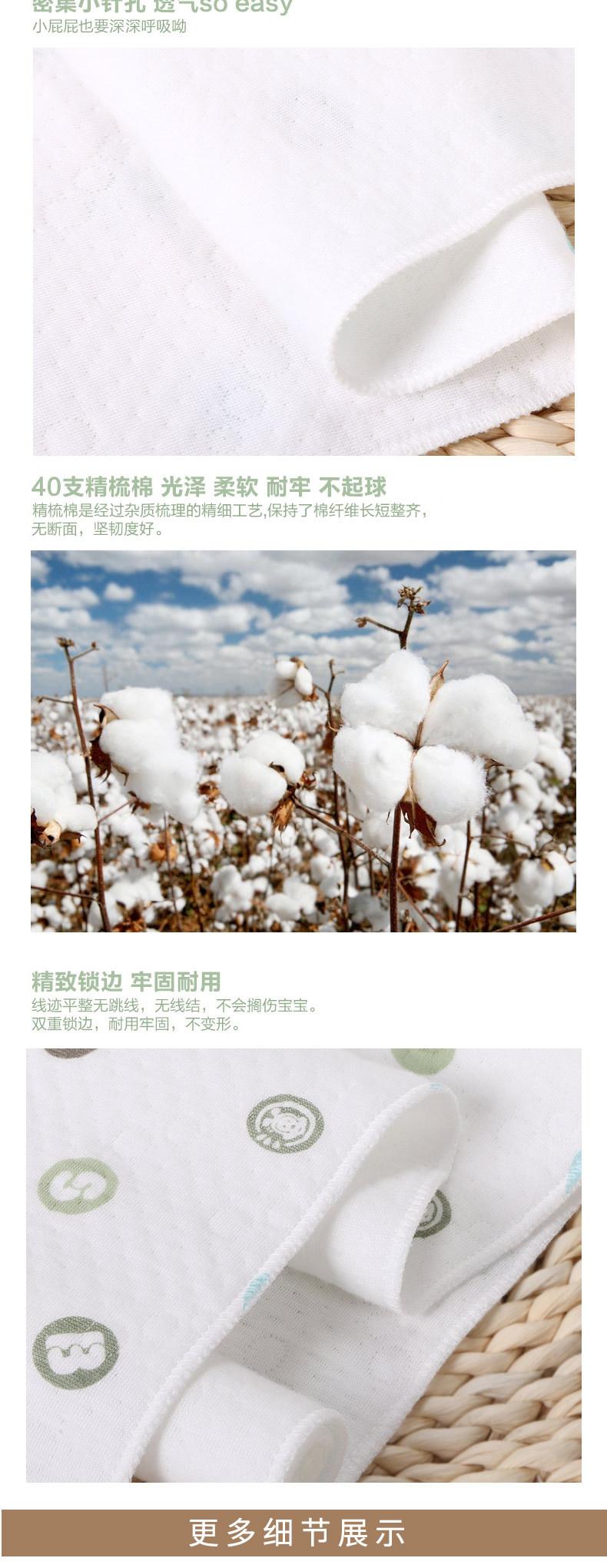 Fuerte transpirabilidad, los pañales hechos de tela de algodón tienen las ventajas de transpirabilidad, durabilidad, economía y protección ambiental. Pueden mantener la piel seca y seca, lo que favorece que la piel respire suavemente y evita la aparición de dermatitis del pañal. Seguros y no irritantes, los pañales de tela están hechos de tela de algodón, que es absolutamente segura y no irritante, y puede proteger la delicada piel del bebé. Económicos y asequibles, los pañales de tela son fáciles de lavar y se pueden reutilizar, ¡lo que facilita ahorrar dinero! Fáciles de observar, una vez que use pañales de tela, naturalmente cambiará la orina de su bebé con regularidad, lo cual es conveniente para que su bebé desarrolle el hábito de orinar.