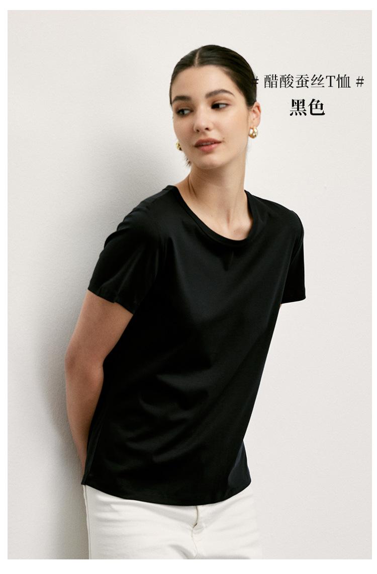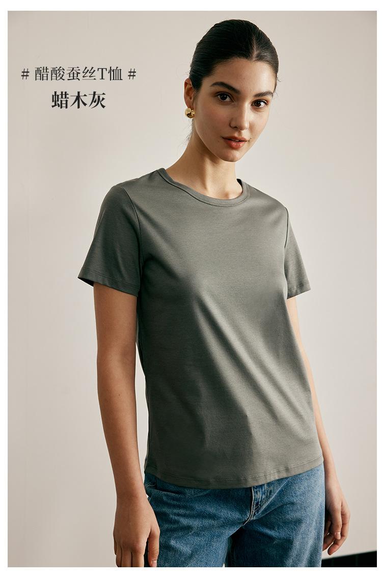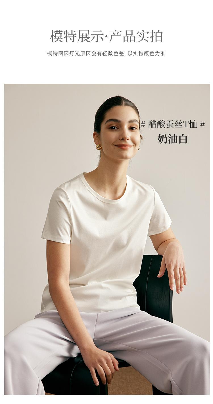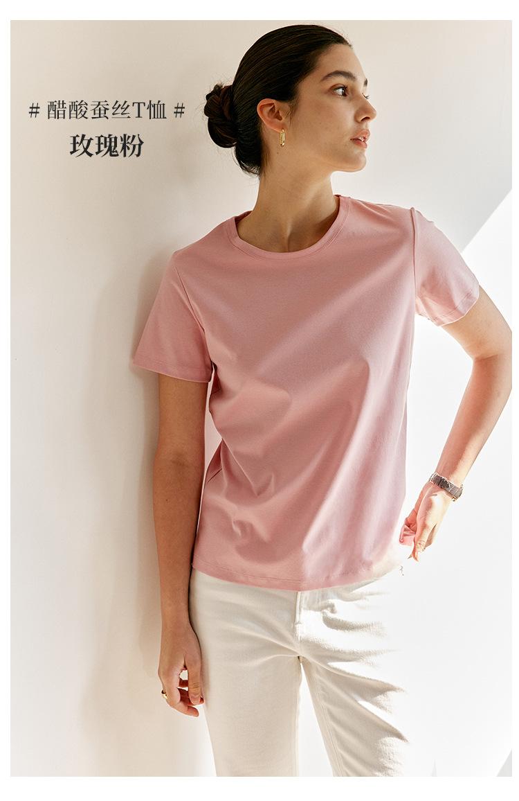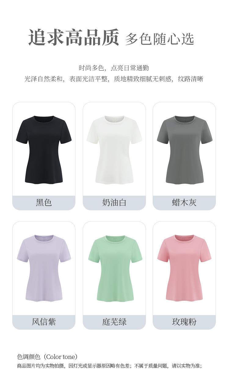 Camiseta de Verano para Mujer Nueva Color Puro Seda de Morera Sedosa Ligera y Delgada Casual Versátil Cuello Redondo Manga Corta